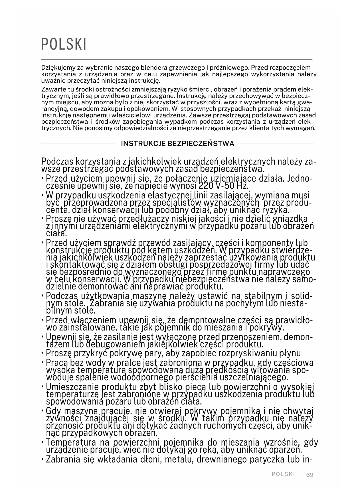 Schakel uit tijdens bedrijf. Oververhitting motor, oververhittingsbeveiliging geactiveerd. Automatische stroomonderbreking is om de motor te beschermen, wat normaal is. Laat het op natuurlijke wijze afko- elen tot de normale temperatuur voordat het automatisch wordt opgestart. Het bedrijfsvermogen over- schrijdt het maximale la- advermogen van de motor vanwege overmatige of paste- uze ingrediënten, en de over- belastingsbeveiliging wordt automatisch uitgeschakeld, wat normaal is. Verlaag het ingrediëntvolume of vul water bij voor verdunning en verlaag de viscositeit o schakel opnieuw in om in te schakelen nadat de overbelastingsbeveiliging automatisch is aangesloten. Abnormaal geluid. Ernstige slijtage van de trans- missie. Neem dan contact op met ons servicepunt of dealer. Het lager van de messeneen- heid is beschadigd. Ernstige slijtage van de ro- estvrijstalen spie van de me- seenheid. Ernstige slijtage van de wa- terdichte anti-slijtage pak- king van de meseenheid. Intermitterende wer- king van de motor. Motorkoolborstel kan versle- ten zijn. Neem dan contact op met ons servicepunt of dealer.69 POLSKI POLSKI Dziękujemy za wybranie naszego blendera grzewczego i próżniowego. Przed rozpoczęciem korzystania z urządzenia oraz w celu zapewnienia jak najlepszego wykorzystania należy uważnie przeczytać niniejszą instrukcję. Zawarte tu środki ostrożności zmniejszają ryzyko śmierci, obrażeń i porażenia prądem elek- trycznym, jeśli są prawidłowo przestrzegane. Instrukcję należy przechowywać w bezpiecz- nym miejscu, aby można było z niej skorzystać w przyszłości, wraz z wypełnioną kartą gwa- rancyjną, dowodem zakupu i opakowaniem. W stosownych przypadkach przekaż niniejszą instrukcję następnemu właścicielowi urządzenia. Zawsze przestrzegaj podstawowych zasad bezpieczeństwa i środków zapobiegania wypadkom podczas korzystania z urządzeń elek- trycznych. Nie ponosimy odpowiedzialności za nieprzestrzeganie przez klienta tych wymagań.