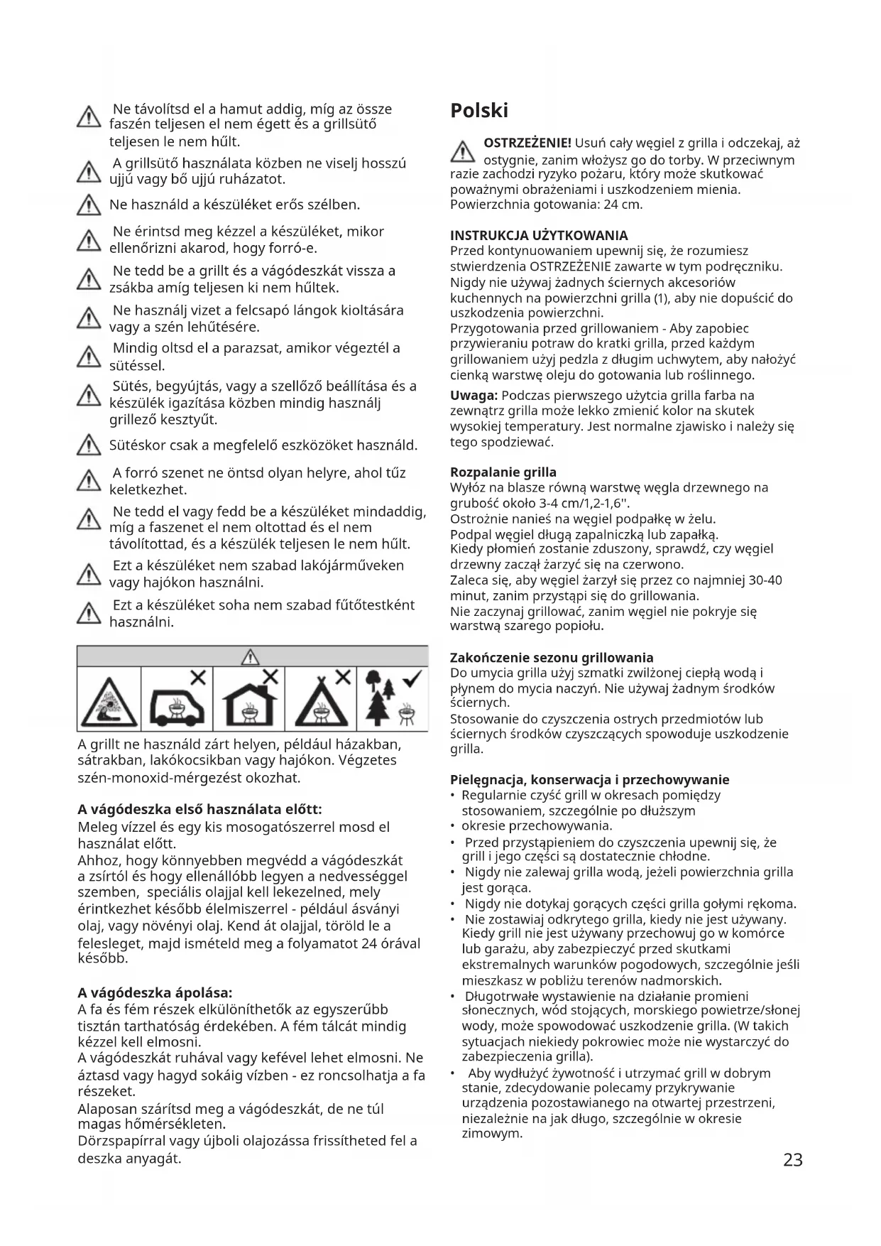- Aby wydłużyć żywotność i utrzymać grill w dobrym stanie, zdecydowanie polecamy przykrywanie urządzenia pozostawianego na otwartej przestrzeni, niezależnie na jak długo, szczególnie w okresie zimowym.24 Nie noś odzieży z długimi lub luźnymi rękawami podczas obsługiwania grilla. Nie używaj grilla przy silnym wietrze. Nie dotykaj grilla rękoma, aby sprawdzić, czy grill jest gorący. Nie wkładaj deski do krojenia i grilla do torby, zanim grill całkowicie ostygnie. Nie używaj wody do opanowania płomieni lub gaszenia węgla. Zawsze zgaś węgiel po zakończeniu grillowania. Podczas grillowania, rozpalania i regulowania odpowietrzników i obsługi grilla zawsze należy używać rękawic. Podczas gotowania używaj odpowiednich przyborów do grillowania. Nie wyrzucaj rozgrzanego węgla w miejscu, gdzie może stanowić zagrożenie pożarowe. Nie odstawiaj na przechowanie, ani nie przykrywaj grilla dopóki węgiel nie zostanie ugaszony i usunięty, a grill nie będzie w pełni schłodzony. Ten grill nie jest przeznaczony do stosowania w pojazdach rekreacyjnych lub łodziach. Grilla nie należy nigdy stosować jako grzejnika. Nie używaj grilla w ciasnych i/lub mieszkalnych pomieszczeniach, np. domach, namiotach, przyczepach kempingowych, kamperach, łodziach. Niebezpieczeństwo zatrucia tlenkiem węgla. Przedpierwszymużyciemnowejdeskidokrojenia Przed użyciem umyj gorącą wodą z dodatkiem łagodnego środka myjącego. Aby ułatwić ochronę deski przed tłuszczem oraz w celu zwiększenia jej naturalnej odporności na działanie wilgoci, warto zabezpieczyć produkt za pomocą oleju zatwierdzonego do kontaktu z żywnością, na przykład oleju roślinnego. Nałóż jedną warstwę oleju, usuń jego nadmiar, a następnie powtórz zabieg po 24 godzinach. Dbanieodeskędokrojenia Elementy metalowe oraz drewniane dają się oddzielić, co ułatwia czyszczenie. Metalową tackę należy zmyć ręcznie. Czyść deskę do krojenia wycietając ją czystą szmatką lub szorując szczotką. Nie zanurzaj produktu w wodzie, ani nie pozostawiaj go w wodzie przez dłuższy czas – może to spowodować popękanie drewna. Nie wystawiaj deski do krojenia na działanie wysokich temperatur, aby przyśpieszyć proces suszenia. W celu odnowienia produktu wystarczy zeszlifować jego powierzchnię średnio drobnym papierem ściernym, a następnie zaolejować.