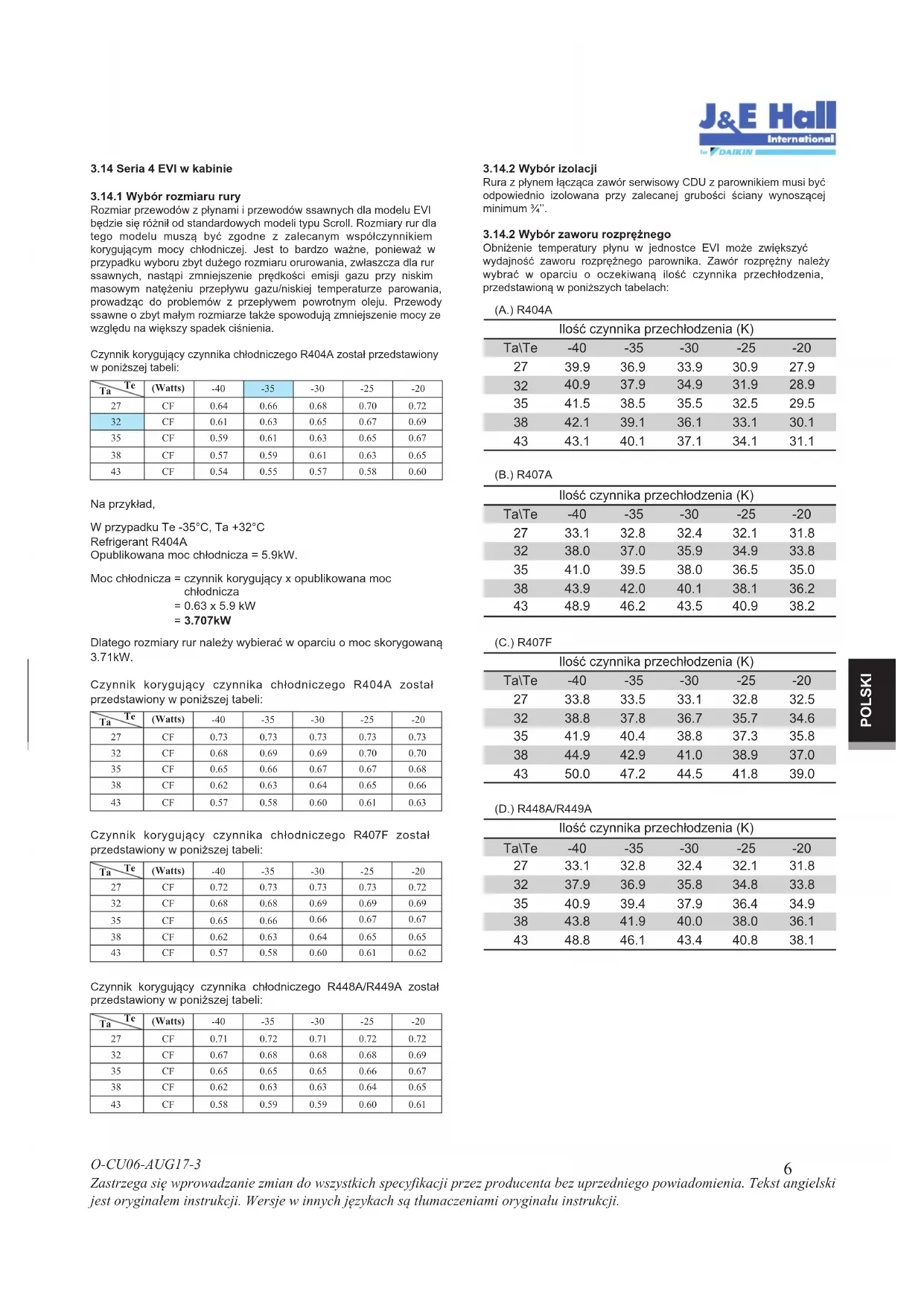 Rozmiar przewodów z płynami i przewodów ssawnych dla modelu EVI bdzie si rónił od standardowych modeli typu Scroll. Rozmiary rur dla tego modelu musz być zgodne z zalecanym współczynnikiem korygujcym mocy chłodniczej. Jest to bardzo wane, poniewa w przypadku wyboru zbyt duego rozmiaru orurowania, zwłaszcza dla rur ssawnych, nastpi zmniejszenie prdkoci emisji gazu przy niskim masowym nateniu przepływu gazu/niskiej temperaturze parowania, prowadzc do problemów z przepływem powrotnym oleju. Przewody ssawne o zbyt małym rozmiarze take spowoduj zmniejszenie mocy ze wzgldu na wikszy spadek cinienia. Czynnik korygujcy czynnika chłodniczego R4Ń4A został przedstawiony w poniszej tabeliŚ (Watts)