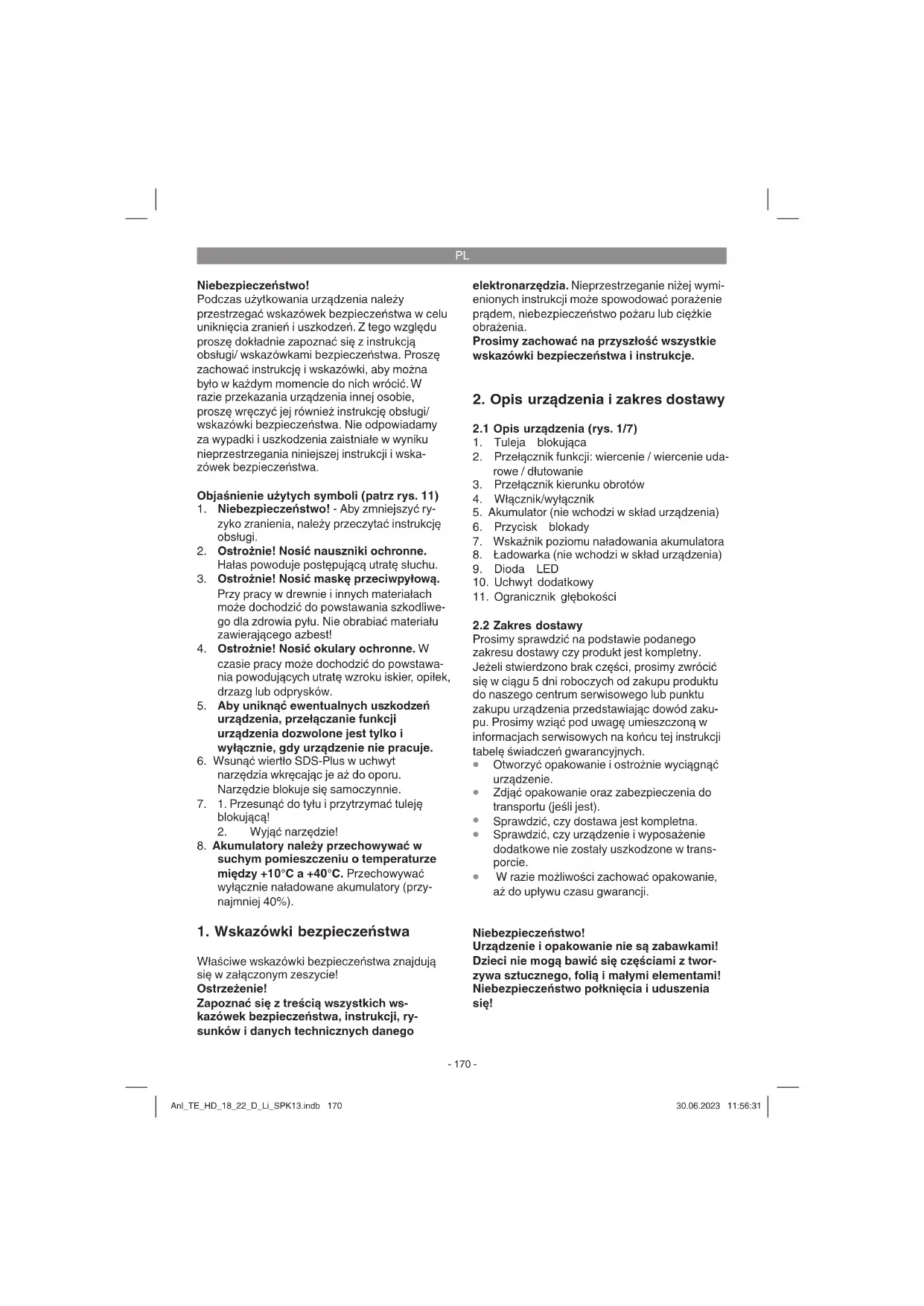 W razie możliwości zachować opakowanie, aż do upływu czasu gwarancji. Niebezpieczeństwo! Urządzenie i opakowanie nie są zabawkami! Dzieci nie mogą bawić się częściami z twor- zywa sztucznego, folią i małymi elementami! Niebezpieczeństwo połknięcia i uduszenia się! Anl_TE_HD_18_22_D_Li_SPK13.indb 170Anl_TE_HD_18_22_D_Li_SPK13.indb 170 30.06.2023 11:56:3130.06.2023 11:56:31PL