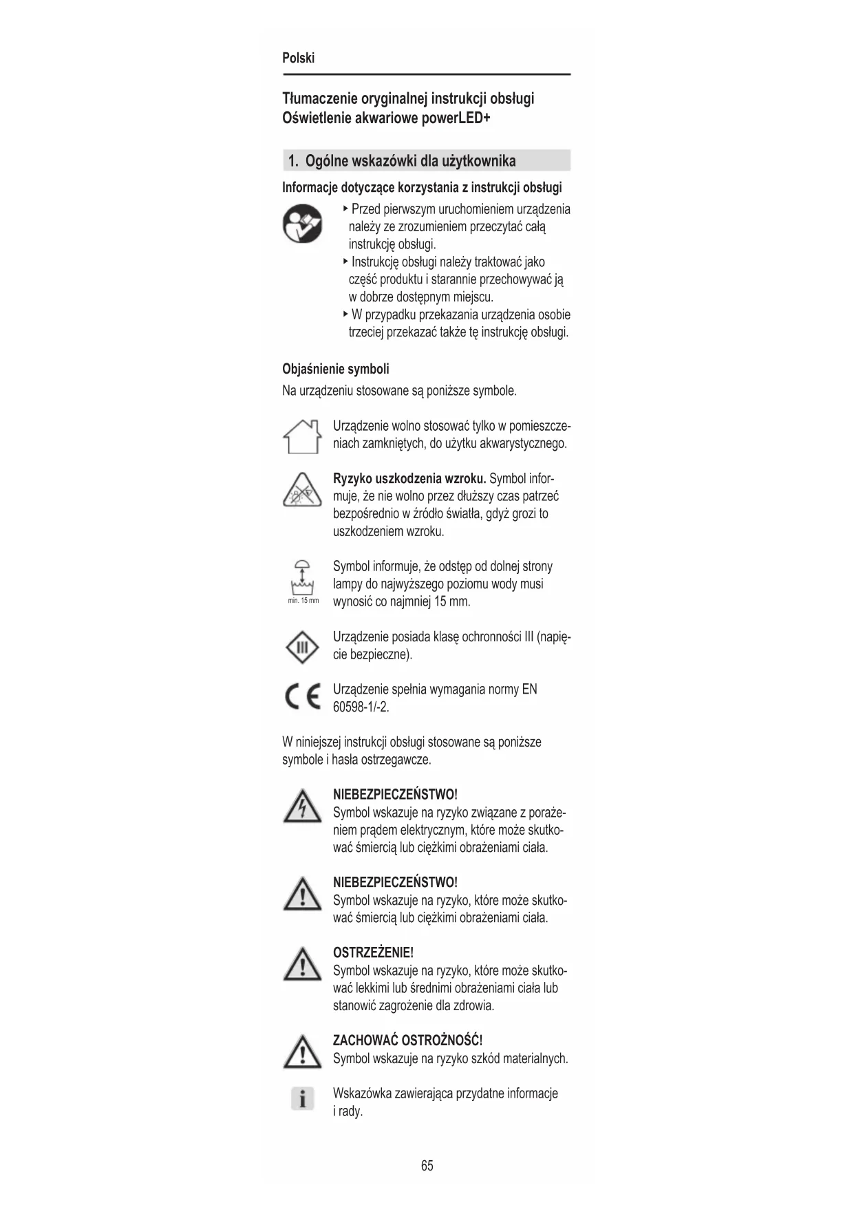 Informacje dotyczące korzystania z instrukcji obsługi ▶ Przed pierwszym uruchomieniem urządzenia należy ze zrozumieniem przeczytać całą instrukcję obsługi. ▶ Instrukcję obsługi należy traktować jako część produktu i starannie przechowywać ją w dobrze dostępnym miejscu. ▶ W przypadku przekazania urządzenia osobie trzeciej przekazać także tę instrukcję obsługi. Objaśnienie symboli Na urządzeniu stosowane są poniższe symbole. Urządzenie wolno stosować tylko w pomieszcze- niach zamkniętych, do użytku akwarystycznego. Ryzyko uszkodzenia wzroku. Symbol infor- muje, że nie wolno przez dłuższy czas patrzeć bezpośrednio w źródło światła, gdyż grozi to uszkodzeniem wzroku. Symbol informuje, że odstęp od dolnej strony lampy do najwyższego poziomu wody musi wynosić co najmniej 15 mm. Urządzenie posiada klasę ochronności III (napię- cie bezpieczne). Urządzenie spełnia wymagania normy EN 60598-1/-2. W niniejszej instrukcji obsługi stosowane są poniższe symbole i hasła ostrzegawcze. NIEBEZPIECZEŃSTWO! Symbol wskazuje na ryzyko związane z poraże- niem prądem elektrycznym, które może skutko- wać śmiercią lub ciężkimi obrażeniami ciała. NIEBEZPIECZEŃSTWO! Symbol wskazuje na ryzyko, które może skutko- wać śmiercią lub ciężkimi obrażeniami ciała. OSTRZEŻENIE! Symbol wskazuje na ryzyko, które może skutko- wać lekkimi lub średnimi obrażeniami ciała lub stanowić zagrożenie dla zdrowia. ZACHOWAĆ OSTROŻNOŚĆ! Symbol wskazuje na ryzyko szkód materialnych. Wskazówka zawierająca przydatne informacje i rady. min. 15 mmPolski
