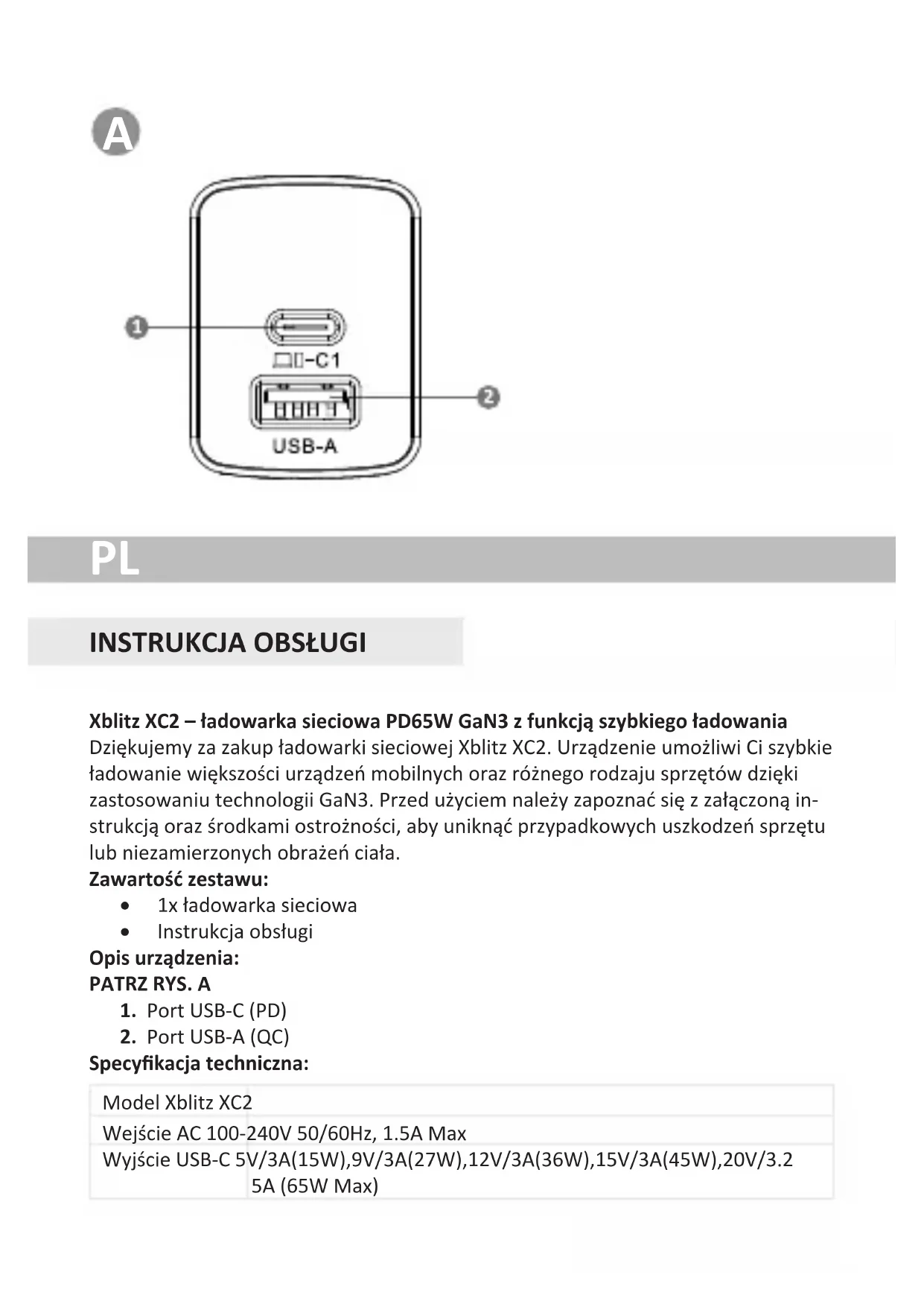 Xblitz XC2 – ładowarka sieciowa PD65W GaN3 z funkcją szybkiego ładowania Dziękujemy za zakup ładowarki sieciowej Xblitz XC2. Urządzenie umożliwi Ci szybkie ładowanie większości urządzeń mobilnych oraz różnego rodzaju sprzętów dzięki zastosowaniu technologii GaN3. Przed użyciem należy zapoznać się z załączoną in- strukcją oraz środkami ostrożności, aby uniknąć przypadkowych uszkodzeń sprzętu lub niezamierzonych obrażeń ciała. Zawartość zestawu: