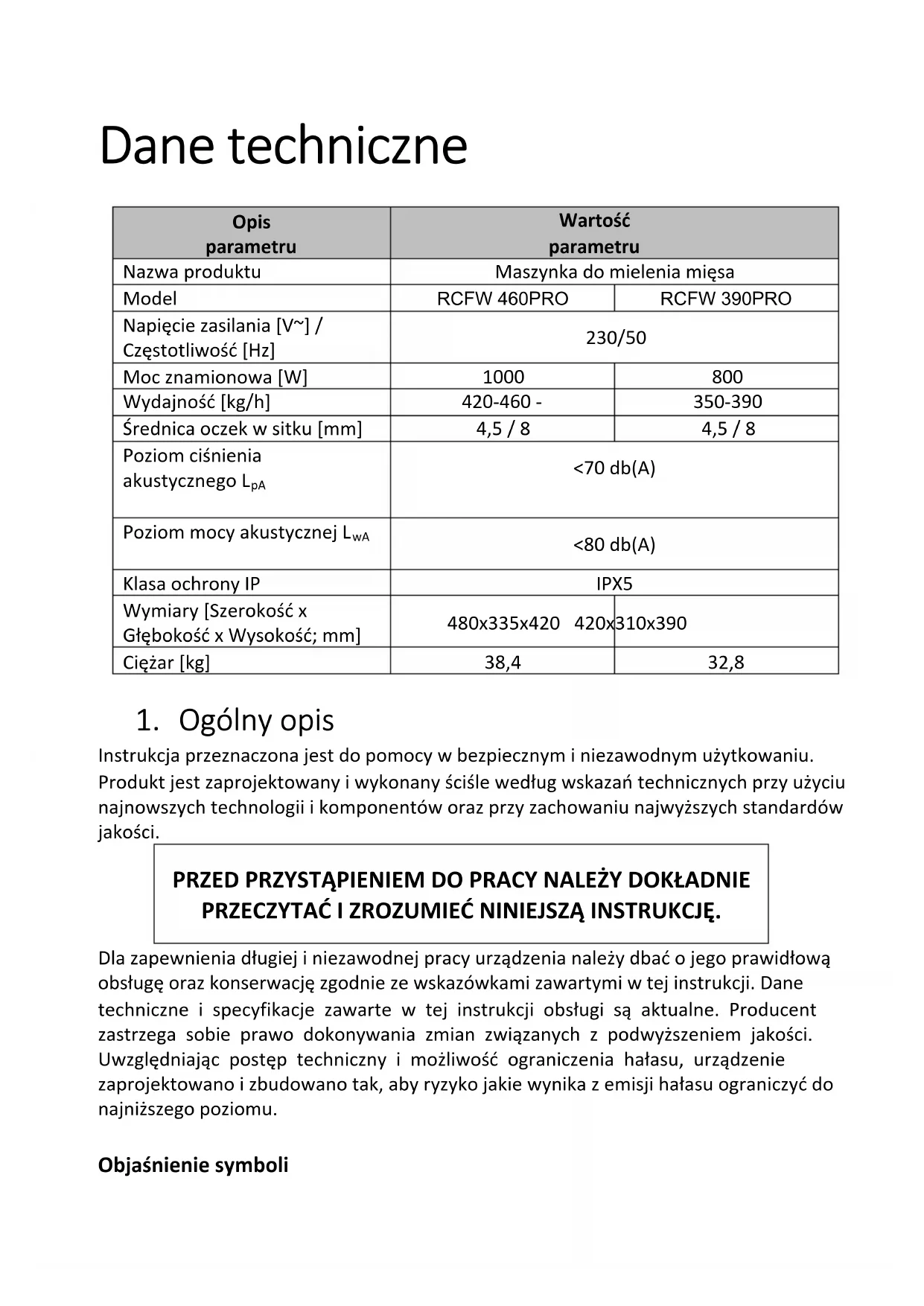 8mm mesh sieveCaution! Please disconnect from power source before opening!Dane techniczne Opis parametru Wartość parametru Nazwa produktu Maszynka do mielenia mięsa Model RCFW 460PRO RCFW 390PRO Napięcie zasilania [V~] / Częstotliwość [Hz] 230/50 Moc znamionowa [W]