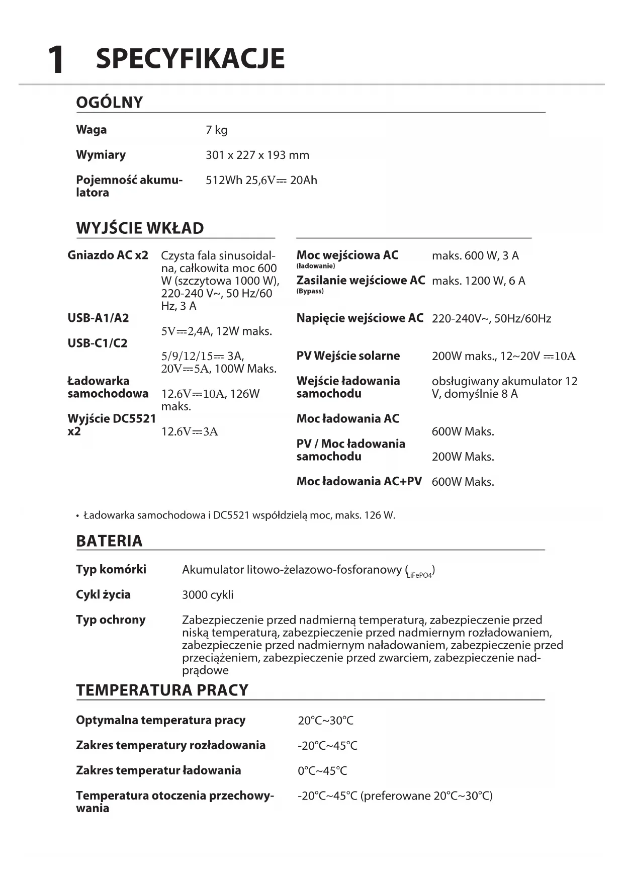 3000 cykli Zabezpieczenie przed nadmierną temperaturą, zabezpieczenie przed niską temperaturą, zabezpieczenie przed nadmiernym rozładowaniem, zabezpieczenie przed nadmiernym naładowaniem, zabezpieczenie przed przeciążeniem, zabezpieczenie przed zwarciem, zabezpieczenie nad- prądowe 20°C~30°C -20°C~45°C 0°C~45°C -20°C~45°C (preferowane 20°C~30°C) maks. 600 W, 3 A maks. 1200 W, 6 A 220-240V~, 50Hz/60Hz 200W maks., 12~20V ⎓10A obsługiwany akumulator 12 V, domyślnie 8 A 600W Maks. 200W Maks. 600W Maks.