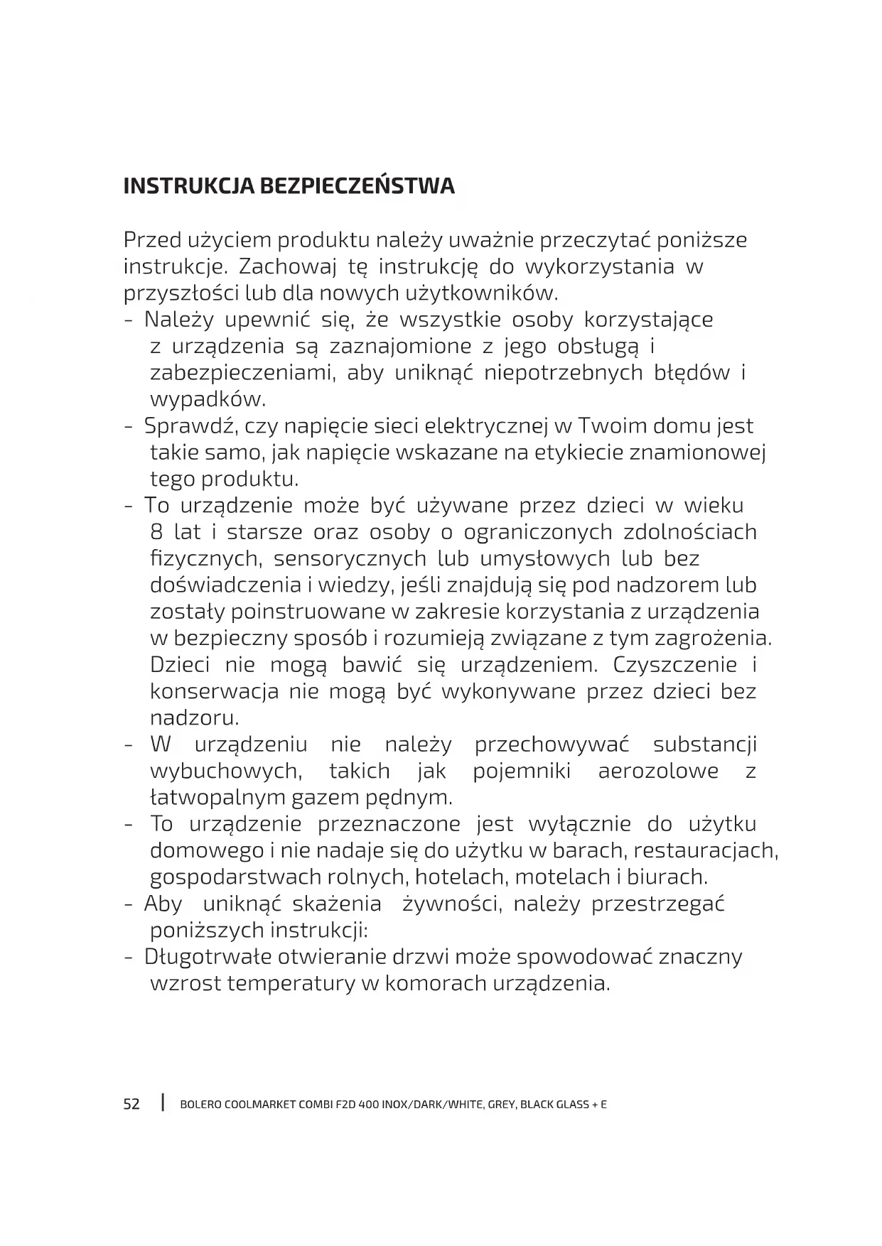 Przed użyciem produktu należy uważnie przeczytać poniższe instrukcje. Zachowaj tę instrukcję do wykorzystania w przyszłości lub dla nowych użytkowników. - Należy upewnić się, że wszystkie osoby korzystające z urządzenia są zaznajomione z jego obsługą i zabezpieczeniami, aby uniknąć niepotrzebnych błędów i wypadków. - Sprawdź, czy napięcie sieci elektrycznej w Twoim domu jest takie samo, jak napięcie wskazane na etykiecie znamionowej tego produktu. - To urządzenie może być używane przez dzieci w wieku 8 lat i starsze oraz osoby o ograniczonych zdolnościach zycznych, sensorycznych lub umysłowych lub bez doświadczenia i wiedzy, jeśli znajdują się pod nadzorem lub zostały poinstruowane w zakresie korzystania z urządzenia w bezpieczny sposób i rozumieją związane z tym zagrożenia. Dzieci nie mogą bawić się urządzeniem. Czyszczenie i konserwacja nie mogą być wykonywane przez dzieci bez nadzoru. - W urządzeniu nie należy przechowywać substancji wybuchowych, takich jak pojemniki aerozolowe z łatwopalnym gazem pędnym. - To urządzenie przeznaczone jest wyłącznie do użytku domowego i nie nadaje się do użytku w barach, restauracjach, gospodarstwach rolnych, hotelach, motelach i biurach. - Aby uniknąć skażenia żywności, należy przestrzegać poniższych instrukcji: - Długotrwałe otwieranie drzwi może spowodować znaczny wzrost temperatury w komorach urządzenia.53 BOLERO COOLMARKET COMBI F2D 400 INOX/DARK/WHITE, GREY, BLACK GLASS + E - Regularnie czyść powierzchnie mające kontakt z żywnością i dostępne systemy odpływowe. - Jeśli urządzenie pozostaje puste przez dłuższy czas, odłącz je, rozmrażając, czyszcząc, susząc i pozostawiając otwarte drzwi, aby zapobiec rozwojowi pleśni wewnątrz. - OSTRZEŻENIE: podczas stawiania urządzenia upewnij się, że przewód zasilania nie jest przytrzaśnięty lub uszkodzony. Przygniecione lub uszkodzone złącze może się nagrzać i spowodować pożar. - Upewnij się, że po zainstalowaniu masz dostęp do głównego złącza urządzenia. - OSTRZEŻENIE: nie umieszczaj listew zasilających z wieloma wtyczkami lub wieloma zasilaczami z tyłu urządzenia. - OSTRZEŻENIE: Należy utrzymywać drożność kratek wentylacyjnych w obudowie urządzenia lub w szafce do zabudowy, w której znajduje się urządzenie. - UWAGA: nie należy używać urządzeń mechanicznych lub innych środków do przyspieszenia procesu rozmrażania, które nie są zalecane przez Cecotec. - UWAGA: nie używaj urządzeń elektrycznych wewnątrz lodówki. - UWAGA: nie wolno uszkodzić układu chłodzenia. - Jeśli przewód jest uszkodzony, musi zostać wymieniony przez producenta, dystrybutora lub osobę o podobnych kwalikacjach, aby uniknąć zagrożenia. - Zaleca się regularne sprawdzanie przewodu zasilającego pod kątem jakichkolwiek oznak uszkodzenia; nie używaj urządzenia, jeśli przewód jest uszkodzony. - OSTRZEŻENIE: aby uniknąć ryzyka związanego z niestabilnością lodówki, należy ją zainstalować zgodnie z instrukcją.54 BOLERO COOLMARKET COMBI F2D 400 INOX/DARK/WHITE, GREY, BLACK GLASS + E - OSTRZEŻENIE! Wykonywanie czynności konserwacyjnych lub napraw obejmujących zdejmowanie osłon jest niebezpieczne dla osób innych niż upoważniony personel. Aby uniknąć ryzyka porażenia prądem, nie próbuj samodzielnie naprawiać urządzenia. - Nie umieszczaj napojów gazowanych w komorze zamrażarki. Lody mogą powodować odmrożenia. Może się to zdarzyć, jeśli zjesz je od razu po wyjęciu z zamrażarki. - Nie wyjmuj przedmiotów z zamrażarki wilgotnymi/mokrymi rękoma, ponieważ może to spowodować otarcia skóry lub odmrożenia. Butelki i puszki nie powinny być umieszczane w zamrażarce, ponieważ mogą pęknąć, gdy ich zawartość zamarznie. - Mrożona żywność może powodować odmrożenia, jeśli zostanie spożyta natychmiast po wyjęciu z komory zamrażarki. - Należy przestrzegać czasów przechowywania zalecanych przez producenta. - Nie pozwalaj dzieciom manipulować elementami sterującymi ani bawić się urządzeniem. Zamrażarka to ciężkie urządzenie. Zachowaj ostrożność podczas jej przenoszenia lub transportu. Zmiana specykacji lub próba modykacji tego produktu w jakikolwiek sposób jest niebezpieczna. - UWAGA: konieczne jest, aby w przypadku drzwi lub pokryw wyposażonych w zamki i klucze były one przechowywane poza zasięgiem dzieci i z dala od urządzenia, aby zapobiec zamknięciu dzieci w środku. - OSTRZEŻENIE: Czynnik chłodniczy używany w urządzeniu oraz materiały izolacyjne muszą być odpowiednio zutylizowane. - Opakowanie należy przechowywać w miejscu niedostępnym dla dzieci, ponieważ istnieje ryzyko uduszenia.55 BOLERO COOLMARKET COMBI F2D 400 INOX/DARK/WHITE, GREY, BLACK GLASS + E - UWAGA: jeśli oświetlenie wewnętrzne jest uszkodzone, skontaktuj się z ocjalnym Serwisem Pomocy Technicznej Cecotec. Nie próbuj samodzielnie go naprawiać. - Upewnij się, że po zainstalowaniu masz dostęp do głównego złącza urządzenia. - Nie umieszczaj żywności bezpośrednio przy wylocie powietrza wewnątrz urządzenia. - Nie wkładaj gorących potraw ani napojów do urządzenia, pozwól im najpierw ostygnąć do temperatury pokojowej. - To urządzenie posiada wtyczkę uziemiającą. Upewnij się, że domowe gniazdko elektryczne jest dobrze uziemione. - Otwory wentylacyjne produktu powinny być wolne od przeszkód. - Odczekaj 5 minut po przerwie w zasilaniu przed ponownym podłączeniem urządzenia. W przeciwnym razie sprężarka może ulec uszkodzeniu. - Nie należy umieszczać napojów gazowanych lub musujących w komorze zamrażarki, ponieważ powoduje to wzrost ciśnienia w pojemniku, co może doprowadzić do eksplozji i uszkodzenia urządzenia. - Aby uniknąć obrażeń lub śmierci w wyniku porażenia prądem, nie należy obsługiwać urządzenia mokrymi rękami lub na mokrej powierzchni. - Nie wolno używać tej lodówki z przedłużaczem lub lis