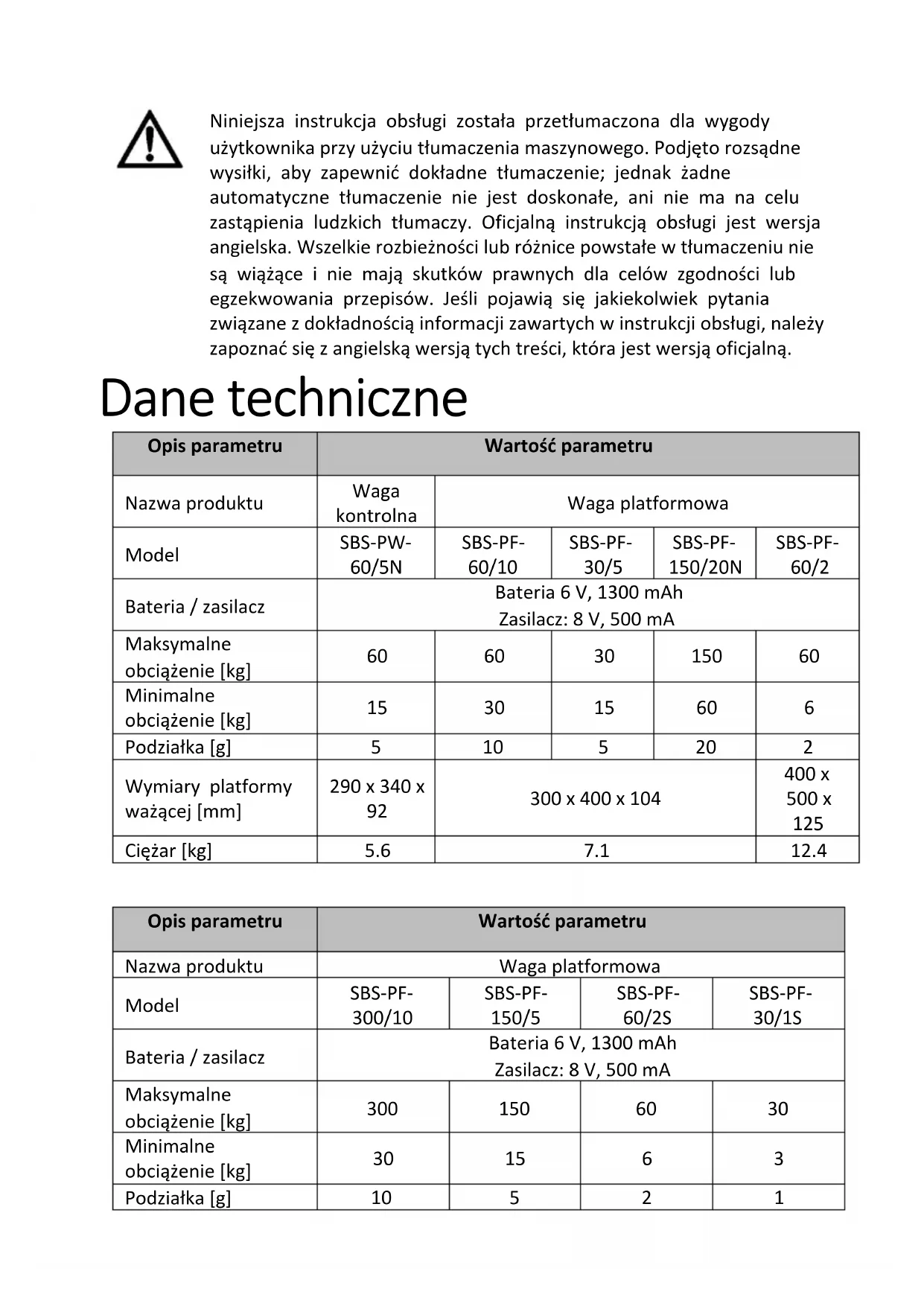 j) Do not use sharp and/or metal objects (e.g. wire brush or metal spatula) as they may damage the surface of the material from which the device is made. k) Do not clean the product with acidic substances, medical agents, thinners, fuel, oils or other chemicals. It may cause damage to the device. INSTRUCTIONS FOR THE SAFE DISPOSAL OF BATTERIES. The devices are equipped with 6 V, 1300 mAh batteries. Remove used batteries from the unit in the same way you put them in. Return the batteries to a unit responsible for their disposal.DISPOSAL OF USED UNITS. At the end of its useful life, this product should not be disposed of with normal household waste but should be taken to a collection point for the recycling of electrical and electronic equipment. This is indicated by the symbol on the product, operating instructions or packaging. The materials used in this appliance are recyclable according to their marking. By reuse, recycling or applying other forms of use of waste machines, you make a significant contribution to the protection of our environment. Your local administration will provide you with information about the appropriate disposal point for used appliances.Niniejsza instrukcja obsługi została przetłumaczona dla wygody użytkownika przy użyciu tłumaczenia maszynowego. Podjęto rozsądne wysiłki, aby zapewnić dokładne tłumaczenie; jednak żadne automatyczne tłumaczenie nie jest doskonałe, ani nie ma na celu zastąpienia ludzkich tłumaczy. Oficjalną instrukcją obsługi jest wersja angielska. Wszelkie rozbieżności lub różnice powstałe w tłumaczeniu nie są wiążące i nie mają skutków prawnych dla celów zgodności lub egzekwowania przepisów. Jeśli pojawią się jakiekolwiek pytania związane z dokładnością informacji zawartych w instrukcji obsługi, należy zapoznać się z angielską wersją tych treści, która jest wersją oficjalną. Dane techniczne Opis parametru Wartość parametru Nazwa produktu Waga kontrolna Waga platformowa Model SBS-PW- 60/5N SBS-PF- 60/10 SBS-PF- 30/5 SBS-PF- 150/20N SBS-PF- 60/2 Bateria / zasilacz Bateria 6 V, 1300 mAh Zasilacz: 8 V, 500 mA Maksymalne obciążenie [kg]