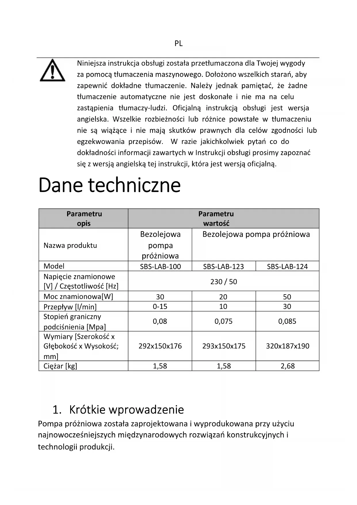 Niniejsza instrukcja obsługi została przetłumaczona dla Twojej wygody za pomocą tłumaczenia maszynowego. Dołożono wszelkich starań, aby zapewnić dokładne tłumaczenie. Należy jednak pamiętać, że żadne tłumaczenie automatyczne nie jest doskonałe i nie ma na celu zastąpienia tłumaczy-ludzi. Oficjalną instrukcją obsługi jest wersja angielska. Wszelkie rozbieżności lub różnice powstałe w tłumaczeniu nie są wiążące i nie mają skutków prawnych dla celów zgodności lub egzekwowania przepisów. W razie jakichkolwiek pytań co do dokładności informacji zawartych w Instrukcji obsługi prosimy zapoznać się z wersją angielską tej instrukcji, która jest wersją oficjalną. Dane techniczne Parametru opis Parametru wartość Nazwa produktu Bezolejowa pompa próżniowa Bezolejowa pompa próżniowa Model SBS-LAB-100 SBS-LAB-123 SBS-LAB-124 Napięcie znamionowe [V] / Częstotliwość [Hz] 230 / 50 Moc znamionowa[W]
