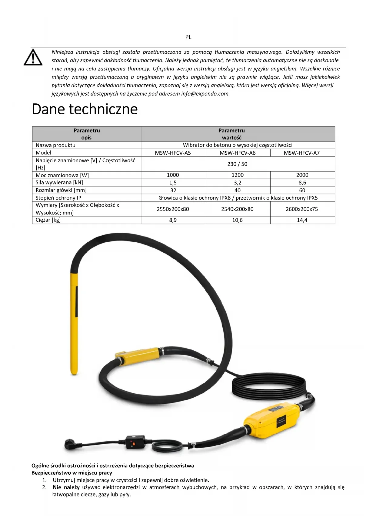 Niniejsza instrukcja obsługi została przetłumaczona za pomocą tłumaczenia maszynowego. Dołożyliśmy wszelkich starań, aby zapewnić dokładność tłumaczenia. Należy jednak pamiętać, że tłumaczenia automatyczne nie są doskonałe i nie mają na celu zastąpienia tłumaczy. Oficjalna wersja instrukcji obsługi jest w języku angielskim. Wszelkie różnice między wersją przetłumaczoną a oryginałem w języku angielskim nie są prawnie wiążące. Jeśli masz jakiekolwiek pytania dotyczące dokładności tłumaczenia, zapoznaj się z wersją angielską, która jest wersją oficjalną. Więcej wersji językowych jest dostępnych na życzenie pod adresem info@expondo.com. Dane techniczne Parametru opis Parametru wartość Nazwa produktu Wibrator do betonu o wysokiej częstotliwości Model MSW-HFCV-A5 MSW-HFCV-A6 MSW-HFCV-A7 Napięcie znamionowe [V] / Częstotliwość [Hz] 230 / 50 Moc znamionowa [W]