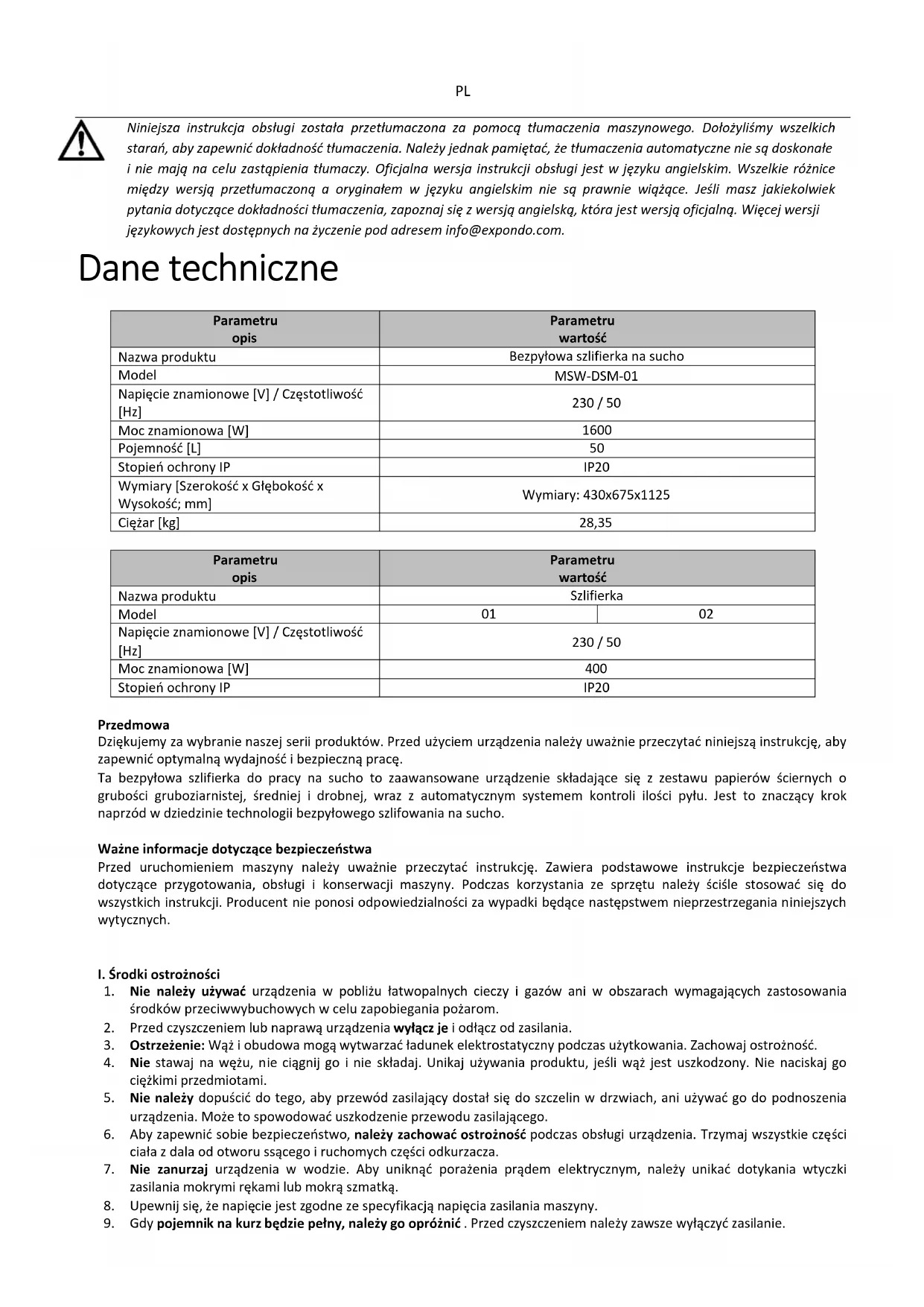 Niniejsza instrukcja obsługi została przetłumaczona za pomocą tłumaczenia maszynowego. Dołożyliśmy wszelkich starań, aby zapewnić dokładność tłumaczenia. Należy jednak pamiętać, że tłumaczenia automatyczne nie są doskonałe i nie mają na celu zastąpienia tłumaczy. Oficjalna wersja instrukcji obsługi jest w języku angielskim. Wszelkie różnice między wersją przetłumaczoną a oryginałem w języku angielskim nie są prawnie wiążące. Jeśli masz jakiekolwiek pytania dotyczące dokładności tłumaczenia, zapoznaj się z wersją angielską, która jest wersją oficjalną. Więcej wersji językowych jest dostępnych na życzenie pod adresem info@expondo.com. Dane techniczne Parametru opis Parametru wartość Nazwa produktu Bezpyłowa szlifierka na sucho Model MSW-DSM-01 Napięcie znamionowe [V] / Częstotliwość [Hz] 230 / 50 Moc znamionowa [W]