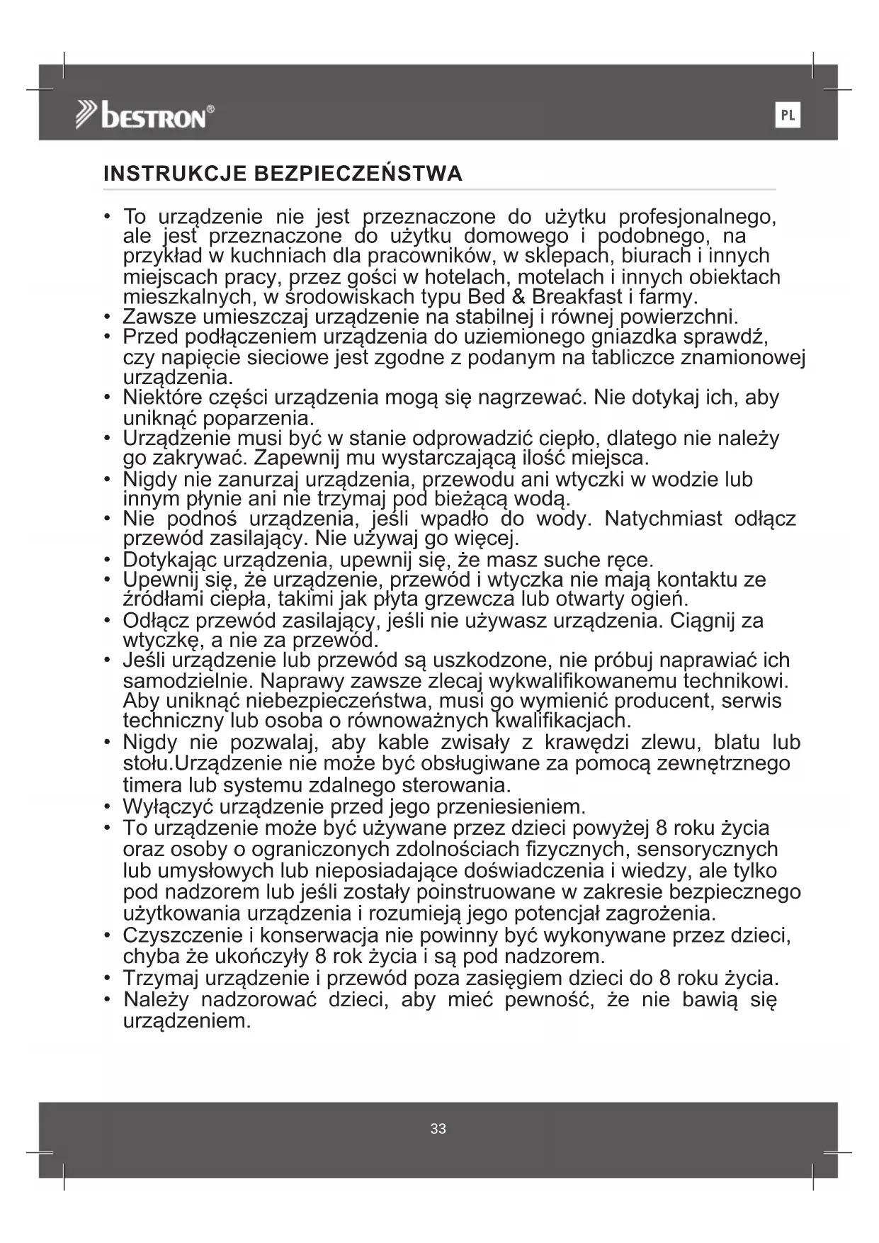 - Twoja gmina może poinformować Cię, gdzie w Twojej okolicy znaleźć wyznaczony punkt zbiórki odpadów. PRACA W mało prawdopodobnym przypadku awarii należy skontaktować się z obsługą klienta Bestron: www.bestron.com/service Specyfikacja techniczna Model AMN100CO Sieć elektryczna 230V~ Częstotliwość (Hz) 50 Klasa bezpieczeństwa 1 Moc (W) Moc wejściowa 1150W Moc wyjściowa 700W Hałas (dB(A)) - Maks. Pojemność ca. 20L Maksymalny ciągły czas pracy (KB) - Wymiary (wys. x szer. x gł.) (cm) 45 x 35 x 26 Długość kabla (cm) 85PL