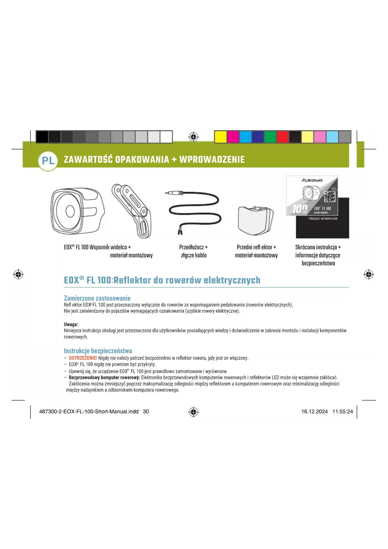 FL 100 jest przeznaczony wyłącznie do rowerów ze wspomaganiem pedałowania (rowerów elektrycznych). Nie jest zatwierdzony do pojazdów wymagających oznakowania (szybkie rowery elektryczne). Uwaga: Niniejsza instrukcja obsługi jest przeznaczona dla użytkowników posiadających wiedzę i doświadczenie w zakresie montażu i instalacji komponentów rowerowych. Instrukcje bezpieczeństwa – OSTRZEŻENIE! Nigdy nie należy patrzeć bezpośrednio w re ektor roweru, gdy jest on włączony. – EOX