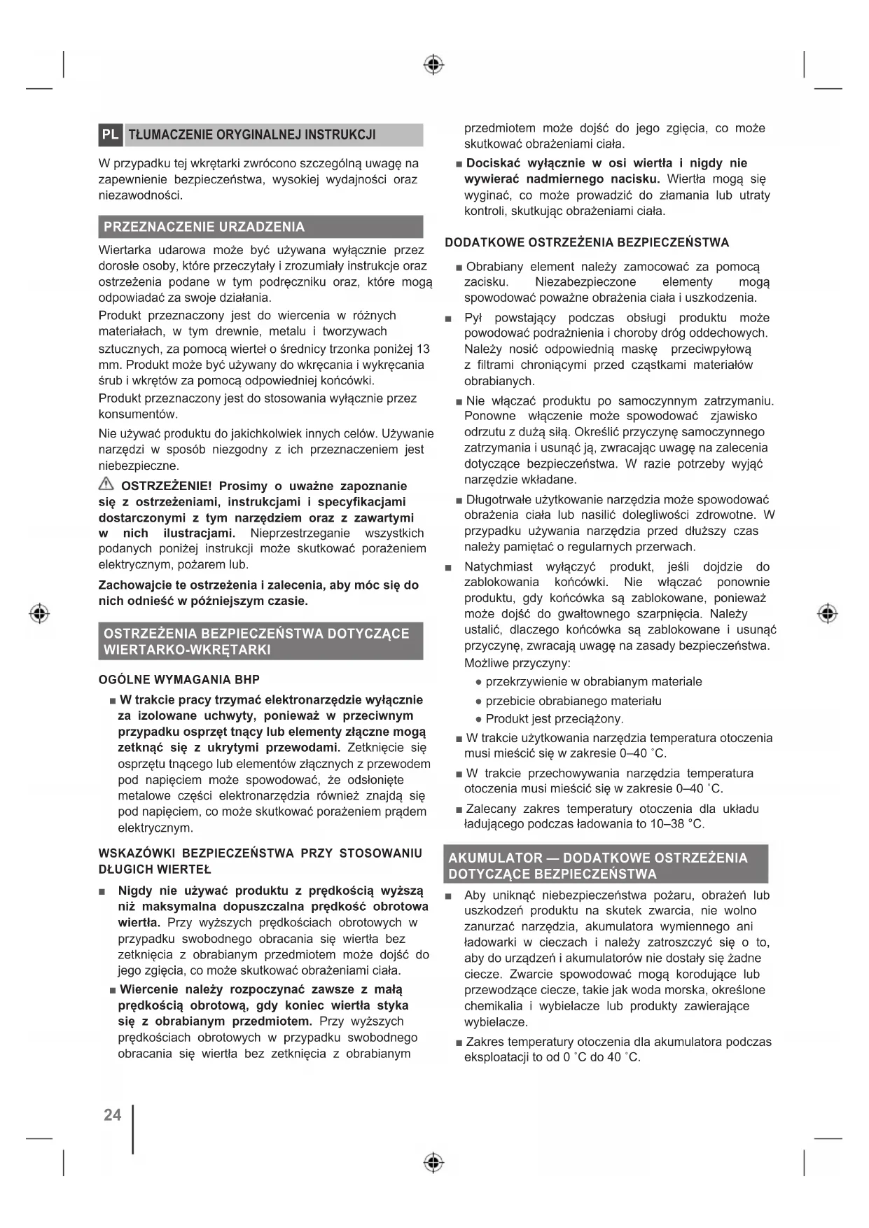 ■ Obrabiany element należy zamocować za pomocą zacisku. Niezabezpieczone elementy mogą spowodować poważne obrażenia ciała i uszkodzenia. ■ Pył powstający podczas obsługi produktu może powodować podrażnienia i choroby dróg oddechowych. Należy nosić odpowiednią maskę przeciwpyłową z filtrami chroniącymi przed cząstkami materiałów obrabianych. ■ Nie włączać produktu po samoczynnym zatrzymaniu. Ponowne włączenie może spowodować zjawisko odrzutu z dużą siłą. Określić przyczynę samoczynnego zatrzymania i usunąć ją, zwracając uwagę na zalecenia dotyczące bezpieczeństwa. W razie potrzeby wyjąć narzędzie wkładane. ■ Długotrwałe użytkowanie narzędzia może spowodować obrażenia ciała lub nasilić dolegliwości zdrowotne. W przypadku używania narzędzia przed dłuższy czas należy pamiętać o regularnych przerwach. ■ Natychmiast wyłączyć produkt, jeśli dojdzie do zablokowania końcówki. Nie włączać ponownie produktu, gdy końcówka są zablokowane, ponieważ może dojść do gwałtownego szarpnięcia. Należy ustalić, dlaczego końcówka są zablokowane i usunąć przyczynę, zwracają uwagę na zasady bezpieczeństwa. Możliwe przyczyny: ● przekrzywienie w obrabianym materiale ● przebicie obrabianego materiału ● Produkt jest przeciążony. ■ W trakcie użytkowania narzędzia temperatura otoczenia musi mieścić się w zakresie 0–40 ˚C. ■ W trakcie przechowywania narzędzia temperatura otoczenia musi mieścić się w zakresie 0–40 ˚C. ■ Zalecany zakres temperatury otoczenia dla układu ładującego podczas ładowania to 10–38 °C.