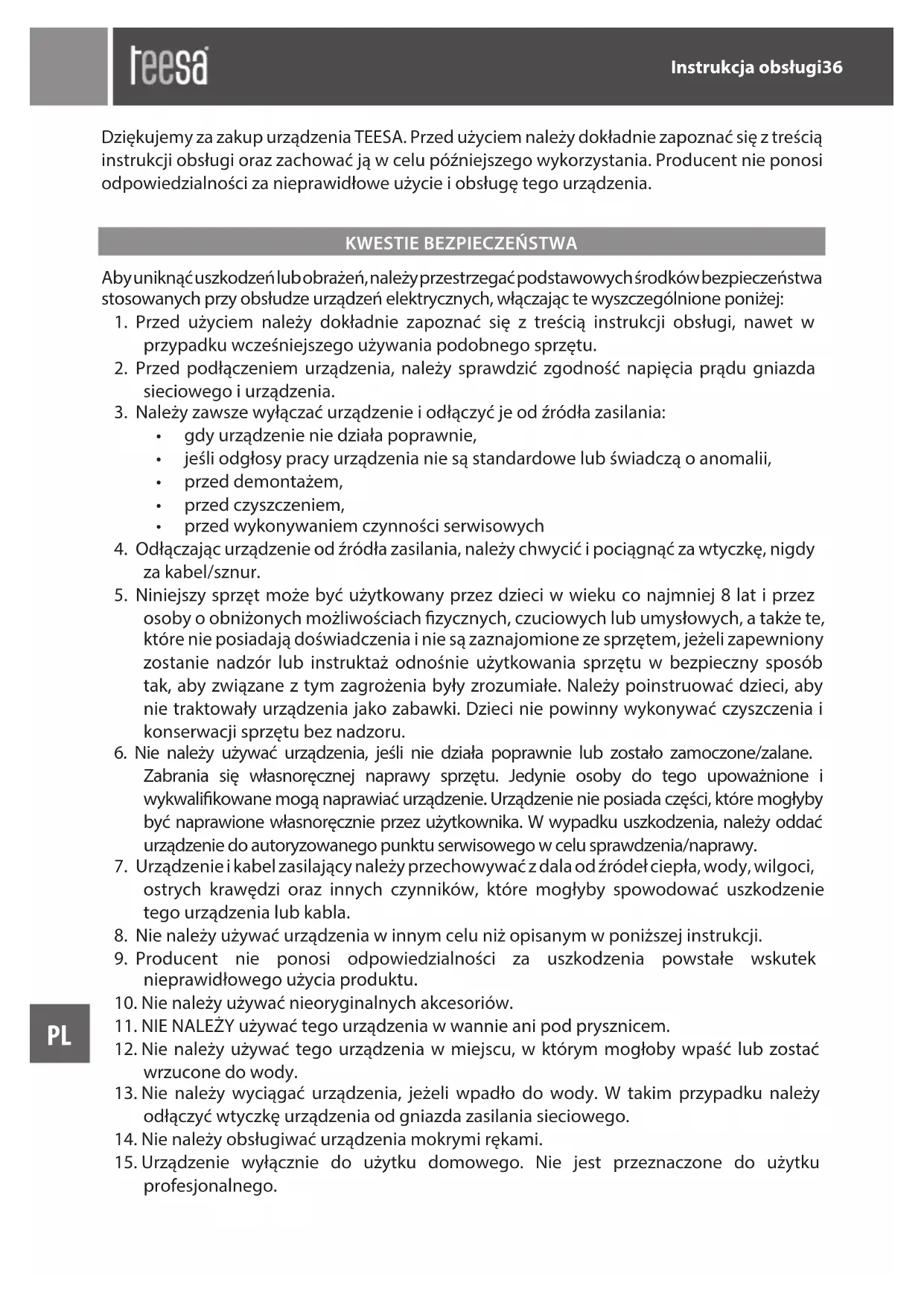 Probleem Mogelijke oorzaak Mogelijke oplossing De borstel werkt niet Nieuw gekochte tanden- borstel of langer dan 3 maanden niet gebruikt Laad de borstel minimaal 2,5 uur Trilling neemt af tijdens gebruik Te hard poetsen en de tand- enborstel tegen de tanden drukken Beweeg de borstelkop lang- zaam en voorzichtig Na het opladen kan de tandenborstel slechts korte tijd gebruikt worden Te korte laadtijd Laad de borstel minimaal 2,5 uurPL Instrukcja obsługi36 Dziękujemy za zakup urządzenia TEESA. Przed użyciem należy dokładnie zapoznać się z treścią instrukcji obsługi oraz zachować ją w celu późniejszego wykorzystania. Producent nie ponosi odpowiedzialności za nieprawidłowe użycie i obsługę tego urządzenia.