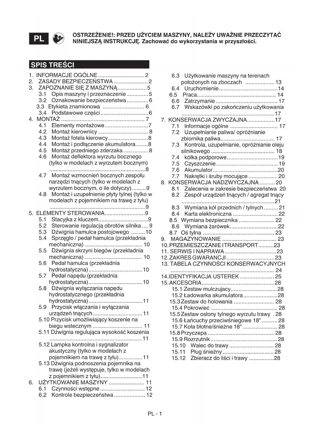 - Nigdy nie należy używać maszyny z uszkodzonymi, brakującymi lub niewłaściwie zamontowanymi zabezpieczeniami, (pojemnik na trawę, ochrona wyrzutu bocznego, ochrona wyrzutu tylnego).