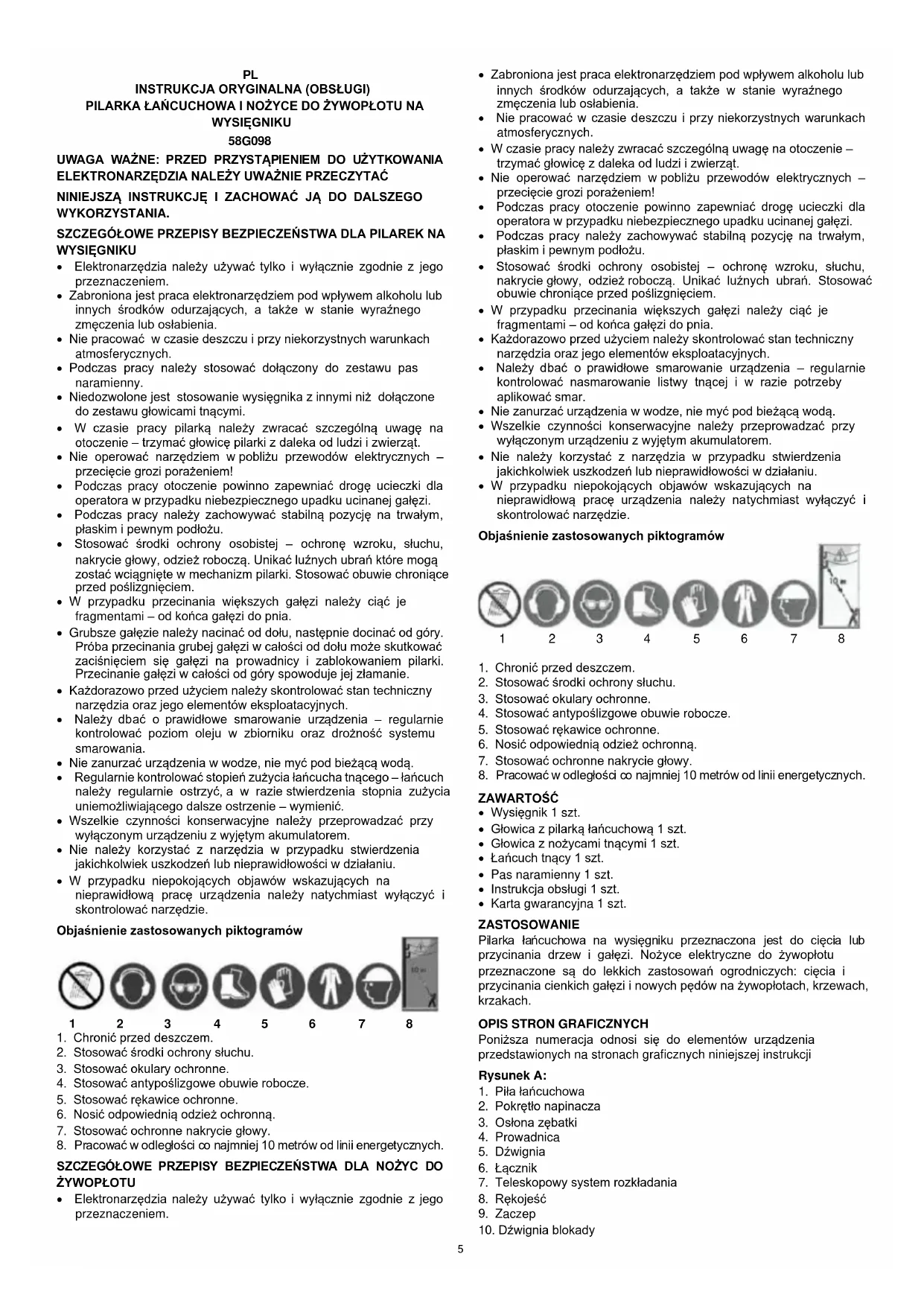 Pilarka łańcuchowa Prędkość liniowa łańcucha (bez obciążenia) 8 m/s Prowadnica 240 mm Naciąganie łańcucha bez narzędziowe Podziałka łańcucha 3/8˝ (9,53 mm) Grubość łańcucha 0,05” (1,27mm) Olej łańcuchowy SAE10W-30 Pojemność zbiornika oleju łańcuchowego 0,07 l Maksymalna długość robocza 250 cm Masa 3,35 kg Nożyce do żywopłotu Prędkość obrotowa na biegu jałowym 1300 min-1 Szerokość cięcia 430 mm Maksymalna grubość ciętej łodygi 15 mm Regulacja kąta cięcia -22,5˚ ÷ 90˚ Maksymalna długość robocza 260 cm Masa 3,2 kg 58G098 oznacza zarówno typ oraz określenie maszyny DANE DOTYCZĄCE HAŁASU I DRGAŃ – PILARKA ŁAŃCUCHOWA Poziom ciśnienia akustycznego