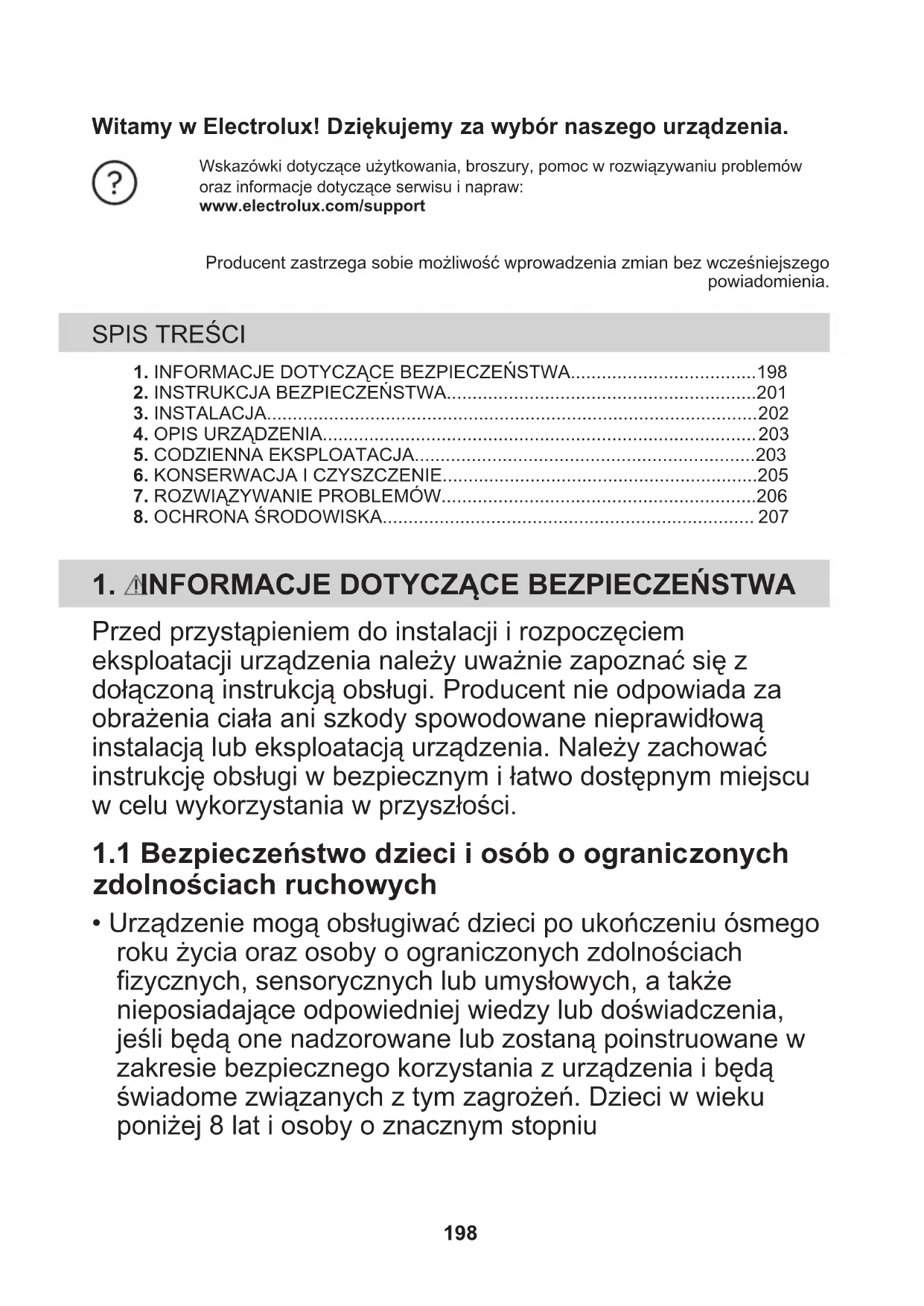 - Urządzenie mogą obsługiwać dzieci po ukończeniu ósmego roku życia oraz osoby o ograniczonych zdolnościach fizycznych, sensorycznych lub umysłowych, a także nieposiadające odpowiedniej wiedzy lub doświadczenia, jeśli będą one nadzorowane lub zostaną poinstruowane w zakresie bezpiecznego korzystania z urządzenia i będą świadome związanych z tym zagrożeń. Dzieci w wieku poniżej 8 lat i osoby o znacznym stopniu 198niepełnosprawności nie powinny zbliżać się urządzenia, jeśli nie znajdują się pod stałym nadzorem.