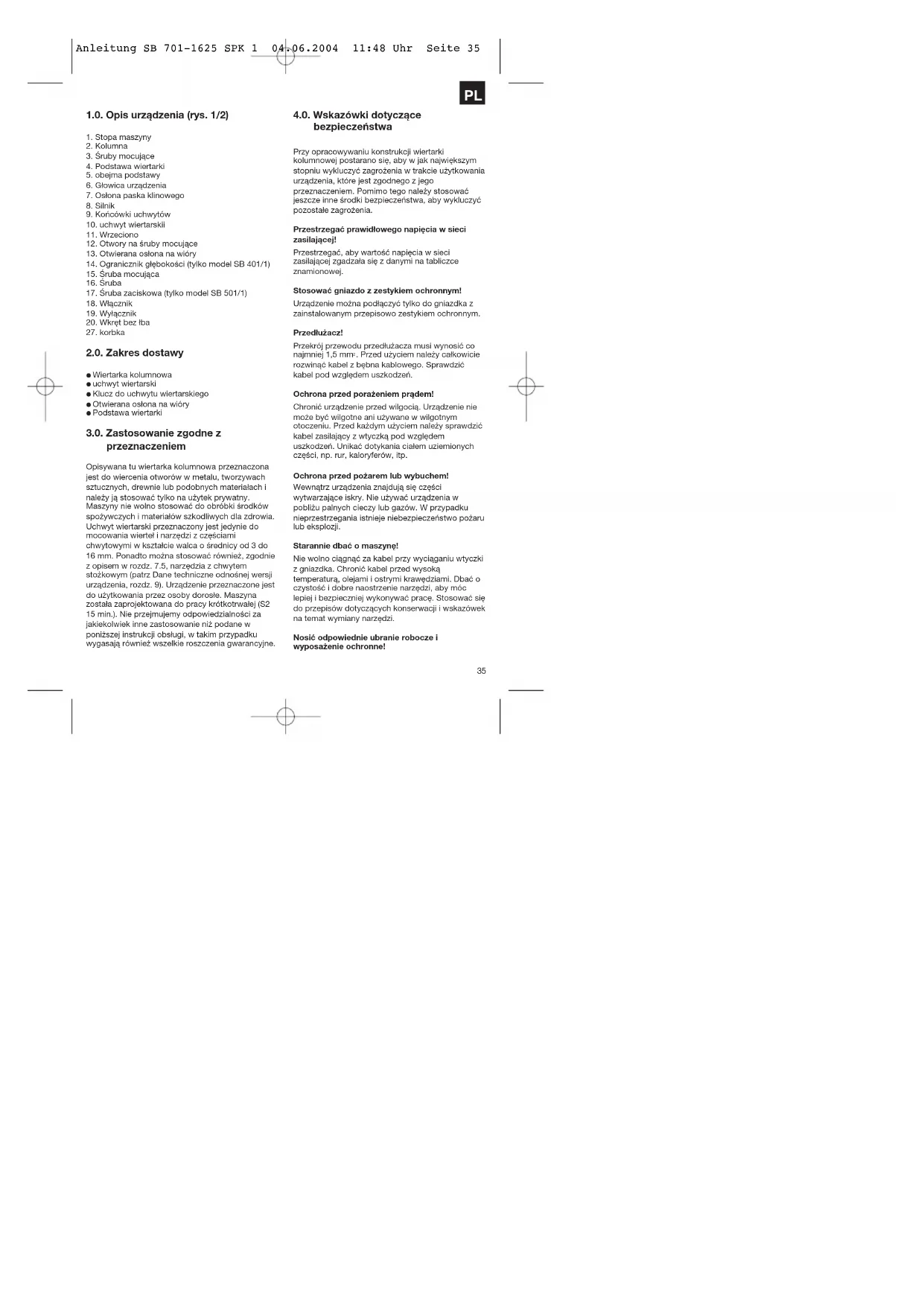 Anleitung SB 701-1625 SPK 1 04.06.2004 11:48 Uhr Seite 3536 Nieodpowiednie jest obszerne ubranie, gdyż może zostać wciągnięte przez ruchome części urządzenia lub zawiesić się. Na długie włosy należy zakładać siatkę na włosy. Przy pracy z obrabiarkami nie wolno nosić biżuterii. Koniecznie nosić okulary ochronne. W przypadku nieprzestrzegania może dojść do zranienia oczu. Utrzymywać porządek w miejscu pracy! Nieporządek w miejscu pracy prowadzi łatwo do wypadków. Nie pozostawiać narzędzi, przedmiotów lub przewodów leżących w pobliżu stanowiska pracy: niebezpieczeństwo potknięcia! Zadbać o wystarczające oświetlenie. Zwrócić uwagę na inne osoby! Podczas użytkowania urządzenia zwrócić uwagę na inne osoby, a zwłaszcza na dzieci, których nie wolno dopuszczać do stanowiska pracy. Nie pozwalać nikomu na dotykanie urządzenia lub przewodu. Przechowywać bezpiecznie urządzenia! Nieużywane urządzenia należy przechowywać w suchym, zamykanym na klucz i niedostępnym dla dzieci pomieszczeniu. Nie przeciążać urządzenia! Pracować tylko w podanym zakresie mocy. Do ciężkich prac nie stosować maszyn o małej mocy. Nie używać elektronarzędzi do celów, do których nie są przeznaczone. Pewna pozycja przy pracy! Podczas pracy dbać o pewną postawę ciała. Unikać nienaturalnych postaw ciała, cały czas utrzymywać równowagę. Wyciągnąć z gniazdka wtyczkę kabla zasilającego - w wypadku nieużywania urządzenia, przed pracami konserwacyjnymi i przy wymianie wiertła. Nie dopuszczać do nieoczekiwanego uruchomienia! Upewnić się przed podłączeniem wtyczki kabla zasilającego do gniazdka, że włącznik urządzenia jest wyłączony. Zachować uwagę przy wykonywaniu pracy! Stale obserwować maszynę i obrabiany przedmiot. Nie używać maszyny, jeżeli jest się nieskoncentrowanym lub rozproszonym. Nie używać nigdy maszyny będąc pod wpływem alkoholu lub tabletek. Maksymalna wielkość przedmiotu obrabianego Wolno obrabiać tylko takie przedmioty (max. wymiary 20 x 20 cm), które można bezpiecznie zamocować w podstawie wiertarki lub w imadle. Sprawdzać urządzenie pod względem uszkodzeń! Przed użyciem urządzenia należy sprawdzić elementy zabezpieczające, osłony lub lekko uszkodzone części, czy funkcjonują bez zastrzeżeń. Sprawdzać regularnie przewód zasilający urządzenie. Wszystkie części muszą być prawidłowo zamontowane i spełniać wszystkie wymagania, aby zapewnić prawidłową eksploatację. Uszkodzone elementy zabezpieczające, osłony i części muszą zostać fachowo naprawione lub wymienione w autoryzowanym warsztacie serwisowym, o ile nie podano inaczej w instrukcji obsługi. Nie używać elektronarzędzi, jeżeli nie działa ich włącznik / wyłącznik. Ostrzeżenie! Używanie innych narzędzi lub osprzętu niż podane w poniższej instrukcji obsługi może oznaczać niebezpieczeństwo obrażeń użytkownika. Należy przeczytać instrukcję obsługi i stosować się do podanych w niej zaleceń. 5.0. Ustawienie