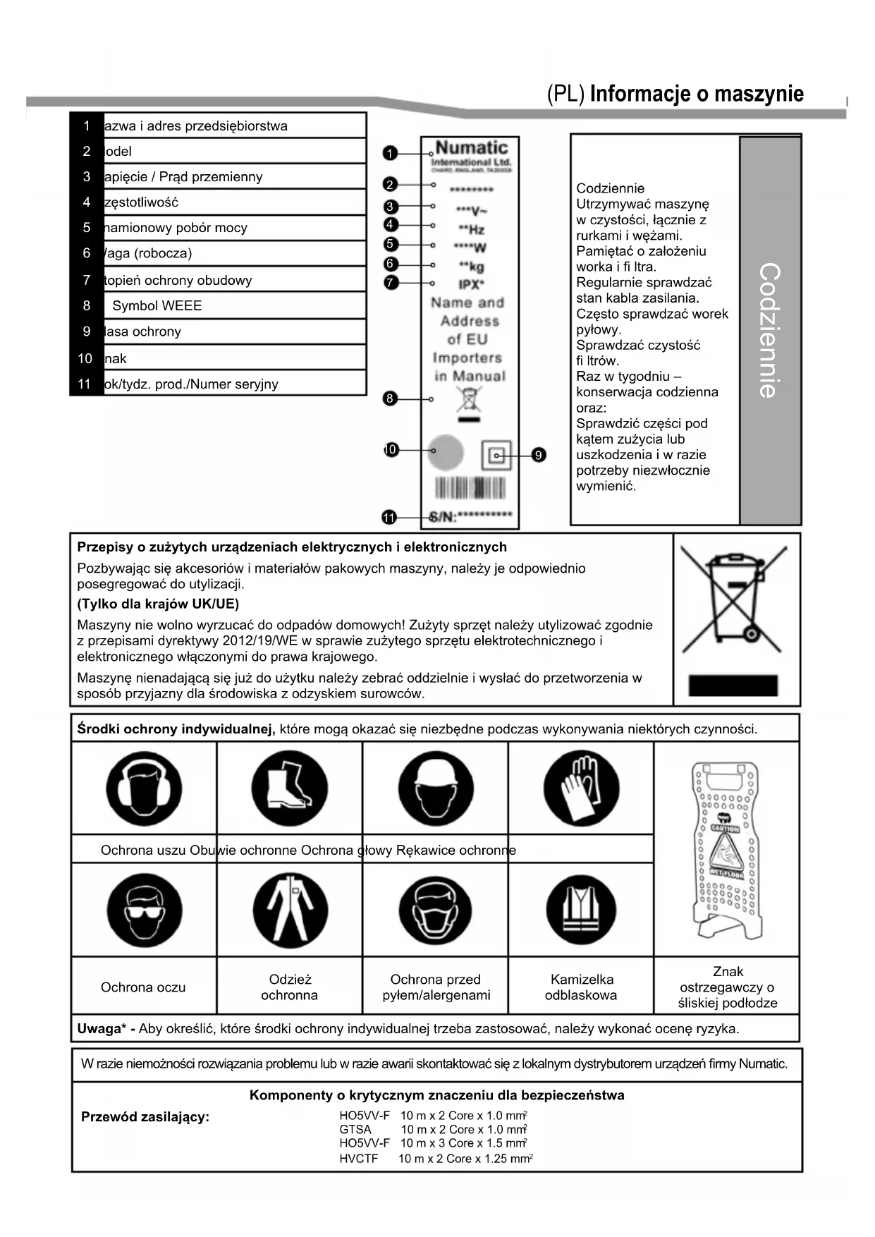 1 Nazwa i adres przedsiębiorstwa 2 Model 3 Napięcie / Prąd przemienny 4 Częstotliwość 5 Znamionowy pobór mocy 6 Waga (robocza) 7 Stopień ochrony obudowy