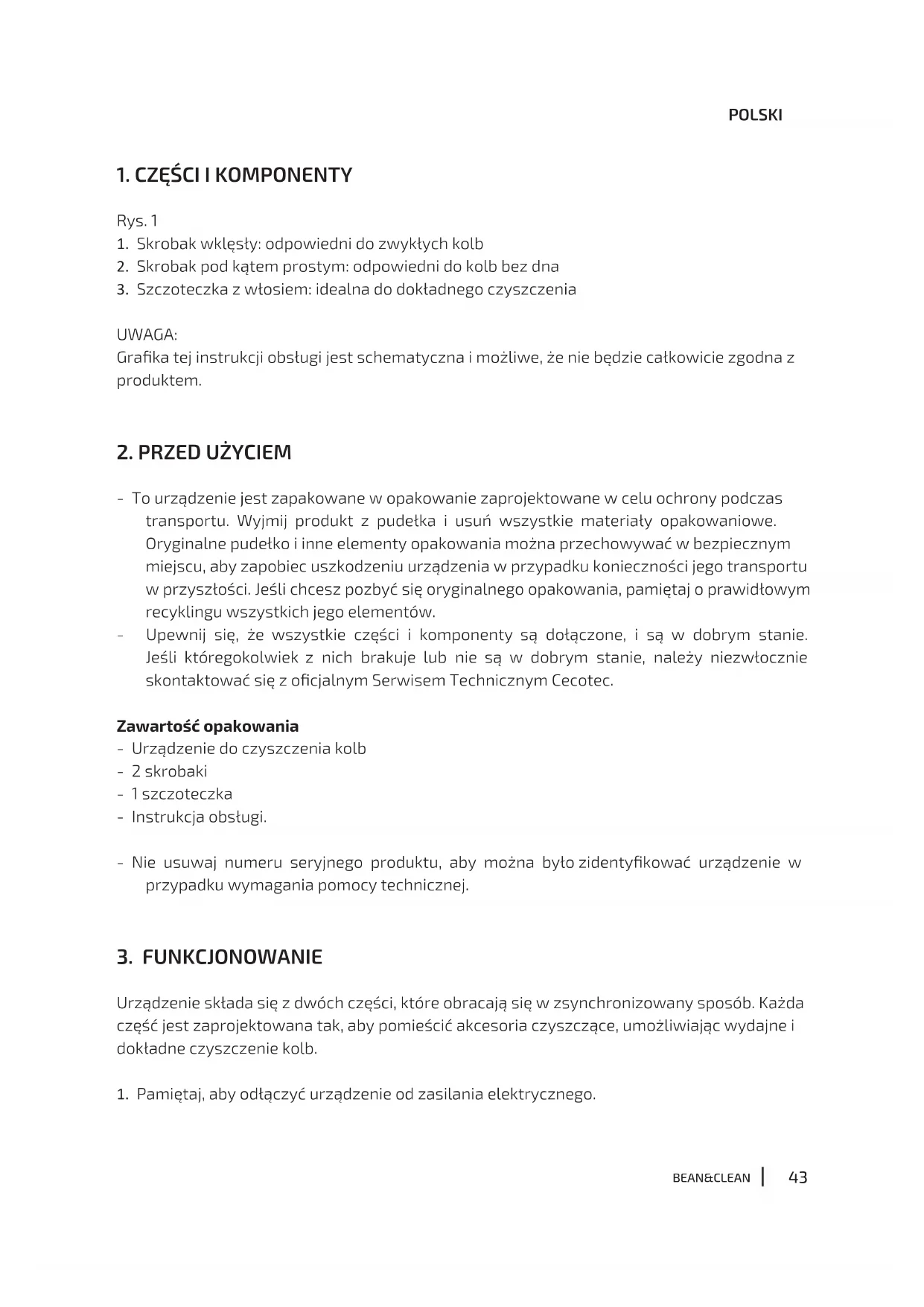 Przed użyciem produktu należy uważnie przeczytać poniższe instrukcje. Zachowaj tę instrukcję do wykorzystania w przyszłości lub dla nowych użytkowników.15 BEAN&CLEAN - Ostrzeżenie: Podczas czyszczenia kolby nie należy wywierać zbyt dużego nacisku, ponieważ może to spowodować uszkodzenie głowic. - Nie dotykaj głowic, gdy urządzenie jest włączone. Przed dotknięciem tych części należy upewnić się, że urządzenie zostało odłączone od zasilania. - Urządzenie należy stawiać na poziomej i stabilnej powierzchni. - Nie wolno instalować żadnych dodatkowych części, które nie zostały dostarczone wraz z urządzeniem. - Nie wolno zamoczyć silnika ani żadnych części elektrycznych. - Jeśli przewód zasilający jest uszkodzony, należy go wymienić na specjalny przewód lub zestaw dostarczony przez producenta lub serwis posprzedażowy. Nie używaj tego urządzenia, jeśli przewód zasilający lub wtyczka są uszkodzone. - Nie używaj urządzenia na zewnątrz ani w wilgotnym otoczeniu. - Przed wymianą głowic czyszczących lub wykonaniem jakichkolwiek czynności konserwacyjnych należy zawsze odłączyć urządzenie od zasilania. - Nie próbuj samodzielnie naprawiać urządzenia. W przypadku jakichkolwiek nieprawidłowości należy skontaktować się z ocjalnym Serwisem Pomocy Technicznej Cecotec. - To urządzenie może być używane przez dzieci w wieku 8 lat i starsze oraz osoby o ograniczonych zdolnościach zycznych, sensorycznych lub umysłowych lub bez doświadczenia i wiedzy, jeśli znajdują się pod nadzorem lub zostały poinstruowane w zakresie korzystania z urządzenia w bezpieczny sposób i rozumieją związane z tym zagrożenia. Dzieci nie mogą bawić się urządzeniem. Czyszczenie i konserwacja urządzenia, które ma przeprowadzać16 BEAN&CLEAN użytkownik nie mogą być wykonywane przez dzieci bez nadzoru. - To urządzenie przeznaczone jest wyłącznie do użytku domowego i nie nadaje się do użytku w barach, restauracjach, gospodarstwach rolnych, hotelach, motelach i biurach.