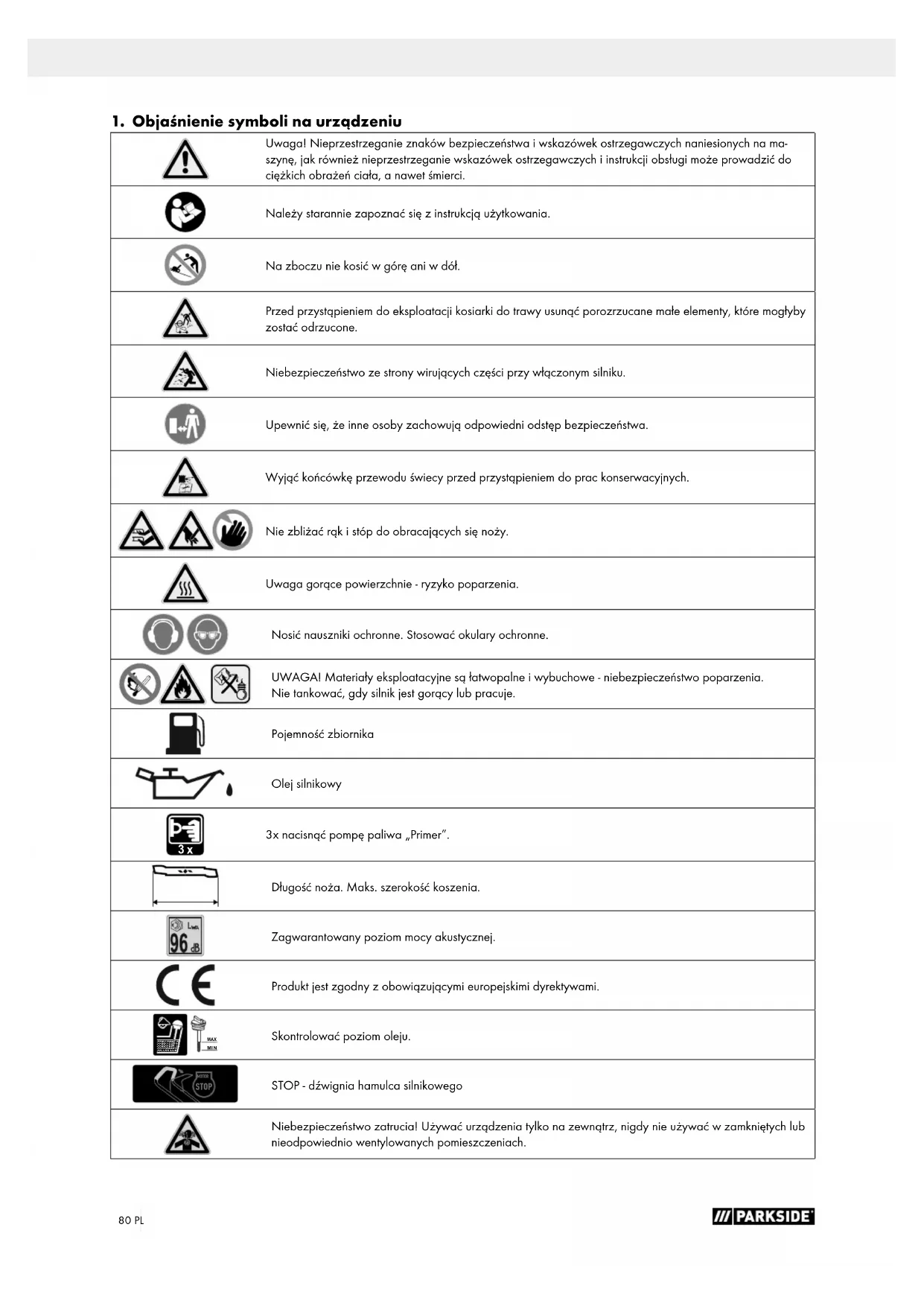 3x nacisnąć pompę paliwa „Primer”. Długość noża. Maks. szerokość koszenia. Zagwarantowany poziom mocy akustycznej. Produkt jest zgodny z obowiązującymi europejskimi dyrektywami. MIN MAX Skontrolować poziom oleju. STOP MOTOR STOP - dźwignia hamulca silnikowego Niebezpieczeństwo zatrucia! Używać urządzenia tylko na zewnątrz, nigdy nie używać w zamkniętych lub nieodpowiednio wentylowanych pomieszczeniach.81PL m Uwaga! Miejsca w niniejszej instrukcji obsługi, które dotyczą bezpieczeństwa użytkownika, zostały oznaczone następującym znakiem. NIEBEZPIECZEŃ- STWO! Słowo sygnalizacyjne oznaczające sytuację bezpośredniego niebezpieczeństwa, która, jeśli jej się nie uniknie, spowoduje śmierć lub poważne obrażenia ciała. OSTRZEŻENIE! Słowo sygnalizacyjne oznaczające sytuację potencjalnego niebezpieczeństwa, która, jeśli jej się nie unik- nie, może spowodować śmierć lub poważne obrażenia ciała. OSTROŻNIE! Słowo sygnalizacyjne oznaczające sytuację potencjalnego niebezpieczeństwa, która, jeśli jej się nie unik- nie, może spowodować niewielkie lub umiarkowane obrażenia ciała. WSKAZÓWKA Słowo sygnalizacyjne oznaczające sytuację potencjalnego niebezpieczeństwa, która, jeśli jej się nie unik- nie, może spowodować uszkodzenie produktu lub własności/posiadanego mienia.82 PL