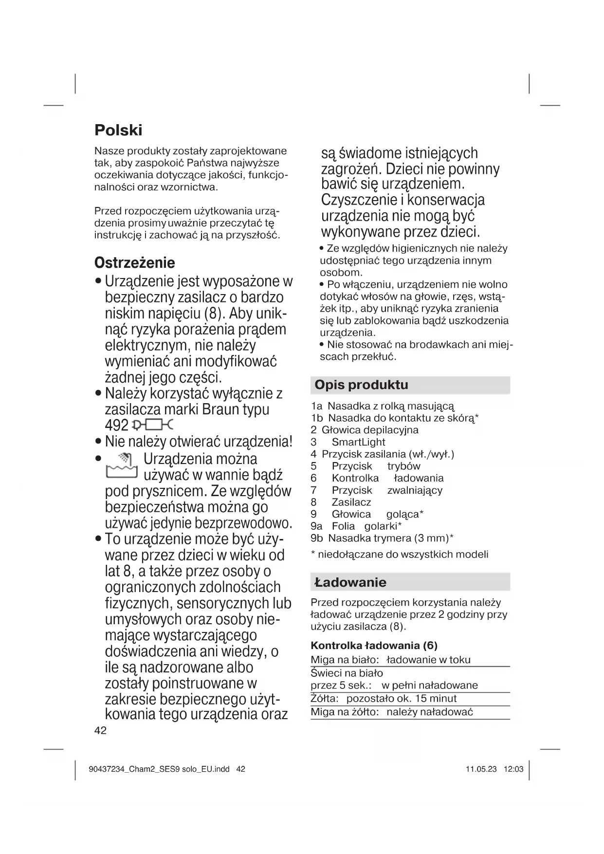- niedołączane do wszystkich modeli Ładowanie Przed rozpoczęciem korzystania należy ładować urządzenie przez 2 godziny przy użyciu zasilacza (8). Kontrolka ładowania (6) Miga na biało: ładowanie w toku Świeci na biało przez 5 sek.: w pełni naładowane Żółta: pozostało ok. 15 minut Miga na żółto: należy naładować 90437234_Cham2_SES9 solo_EU.indd 4290437234_Cham2_SES9 solo_EU.indd 42 11.05.23 12:0311.05.23 12:0343 Czas działania urządzenia wynosi do 50 minut w przypadku użycia do 24 godzin po naładowaniu. Naładuj baterię, gdy włączy się żółta kontrolka lub gdy silniczek całkowicie się zatrzyma. 15-minutowe szybkie ładowanie zapewni 10 minut pracy urządzenia. Optymalny zakres temperatury dla ładowania, użytkowania i przechowywania urządzenia to od 15 do 35°C. Gdy okres eksploatacji wbudowanego akumulatora upłynie, można go wymienić w autoryzowanym centrum obsługi Braun. Tryby pracy uruchamianie w trybie zasilania (I) Naciskaj przycisk trybów (5), aby wybierać spośród następujących trybów jeden po drugim: tryb delikatny (II) tryb Smart Touch (A = automatycznie) powrót do trybu zasilania (I) Tryb Smart Touch pozwala kontrolować prędkość zależnie od stosowanego nacisku: Lekki nacisk: Delikatny tryb do okolic wrażliwych Normalny nacisk: Tryb zasilania zapewnia najlepszą efektywność Tryby zasilania i delikatny dostępne są ze wszystkimi nasadkami. Tryb Smart Touch zoptymalizowano pod kątem nasadki z rolką masującą. Czerwona lampka ostrzegawcza (3) sygnalizuje, że użytkownik stosuje zbyt duży nacisk. Blokada podróżna Aby aktywować blokadę podróżną, należy nacisnąć przycisk zasilania na 3 sekundy do momentu, gdy sygnał dźwię- kowy potwierdzi udaną aktywację. Aby odblokować urządzenie, należy ponow- nie wcisnąć przycisk zasilania na 3 sekundy. Przycisk zasilania powinien zostać zwolniony, gdy urządzenie zacznie pracować. Odblokowania można również dokonać poprzez ładowanie. Depilacja (A) Wskazówki dla początkujących