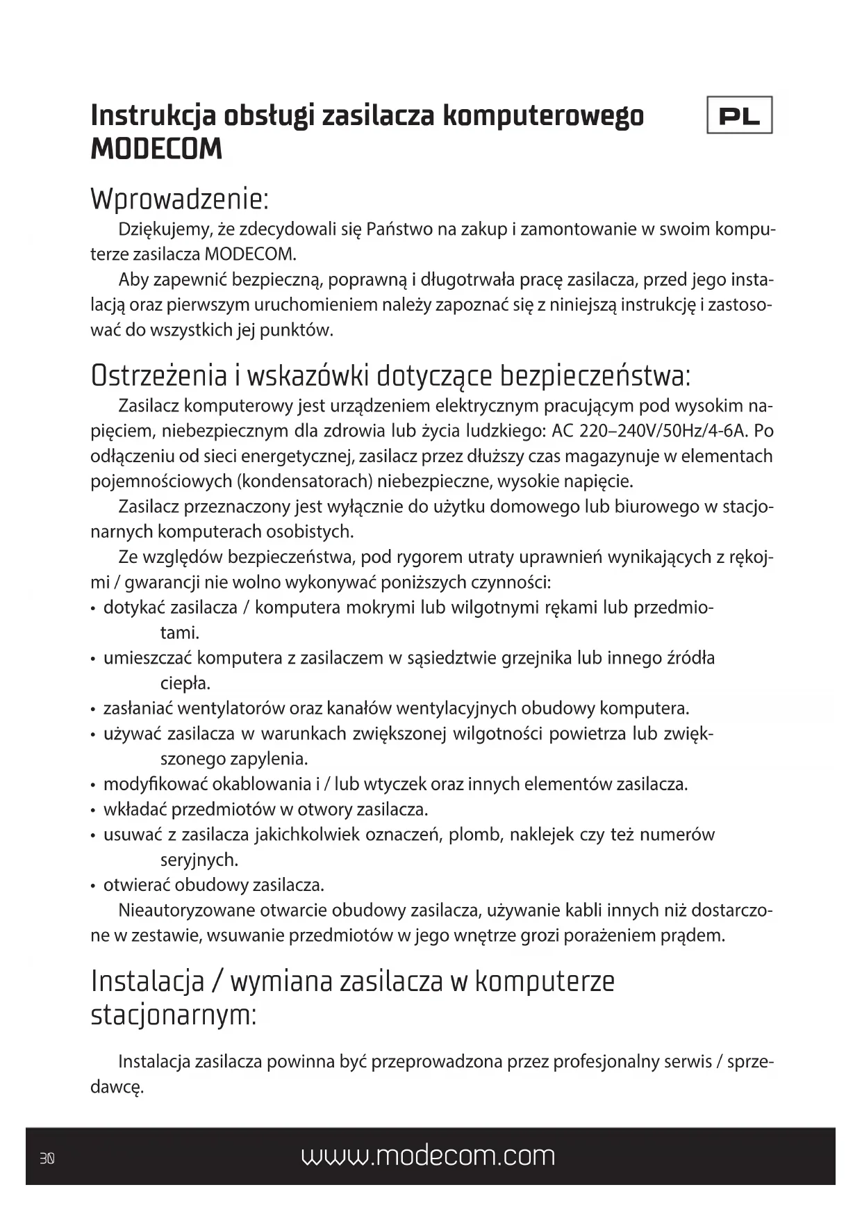 - otwierać obudowy zasilacza. Nieautoryzowane otwarcie obudowy zasilacza, używanie kabli innych niż dostarczo- ne w zestawie, wsuwanie przedmiotów w jego wnętrze grozi porażeniem prądem. Instalacja / wymiana zasilacza w komputerze stacjonarnym: Instalacja zasilacza powinna być przeprowadzona przez profesjonalny serwis / sprze- dawcę.www.modecom.com