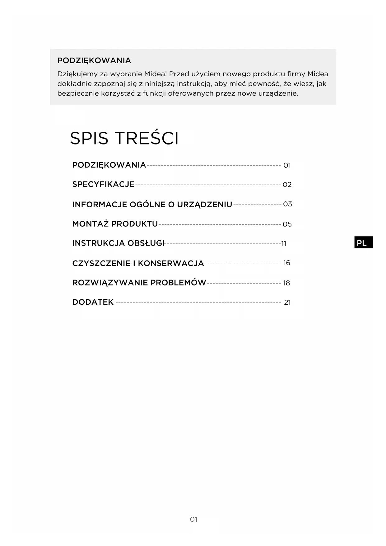 PODZIĘKOWANIA Dziękujemy za wybranie Midea! Przed użyciem nowego produktu firmy Midea dokładnie zapoznaj się z niniejszą instrukcją, aby mieć pewność, że wiesz, jak bezpiecznie korzystać z funkcji oferowanych przez nowe urządzenie.