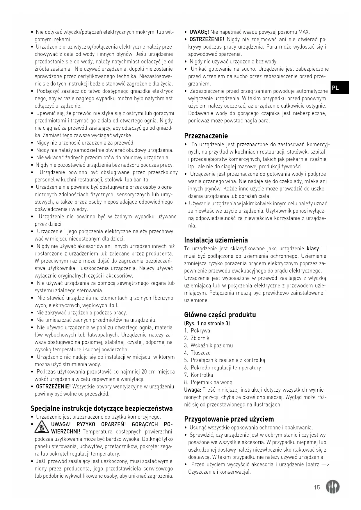 - Unikać gotowania na sucho. Urządzenie jest zabezpieczone przed wrzeniem na sucho przez zabezpieczenie przed prze