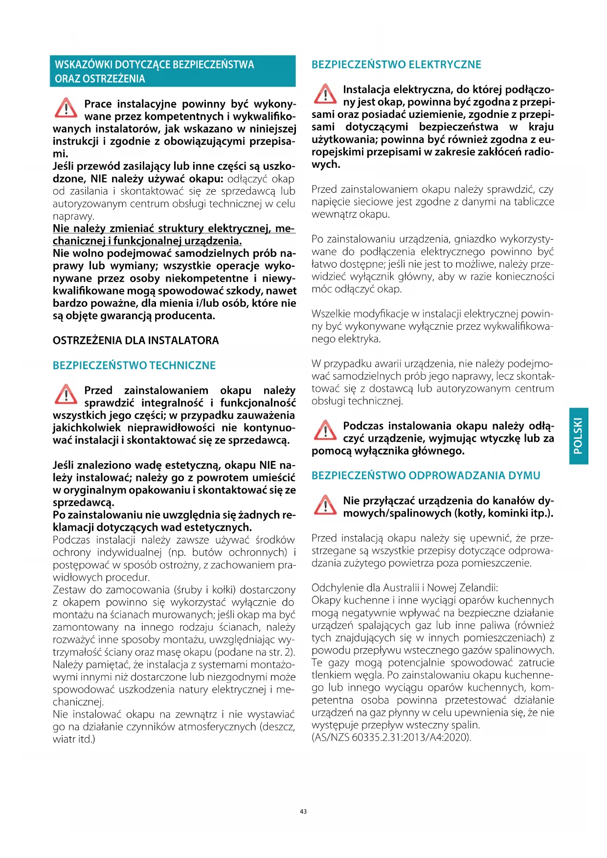 Prace instalacyjne powinny być wykony- wane przez kompetentnych i wykwaliko- wanych instalatorów, jak wskazano w niniejszej instrukcji i zgodnie z obowiązującymi przepisa- mi. Jeśli przewód zasilający lub inne części są uszko- dzone, NIE należy używać okapu: odłączyć okap od zasilania i skontaktować się ze sprzedawcą lub autoryzowanym centrum obsługi technicznej w celu naprawy. Nie należy zmieniać struktury elektrycznej, me- chanicznej i funkcjonalnej urządzenia. Nie wolno podejmować samodzielnych prób na- prawy lub wymiany; wszystkie operacje wyko- nywane przez osoby niekompetentne i niewy- kwalikowane mogą spowodować szkody, nawet bardzo poważne, dla mienia i/lub osób, które nie są objęte gwarancją producenta.