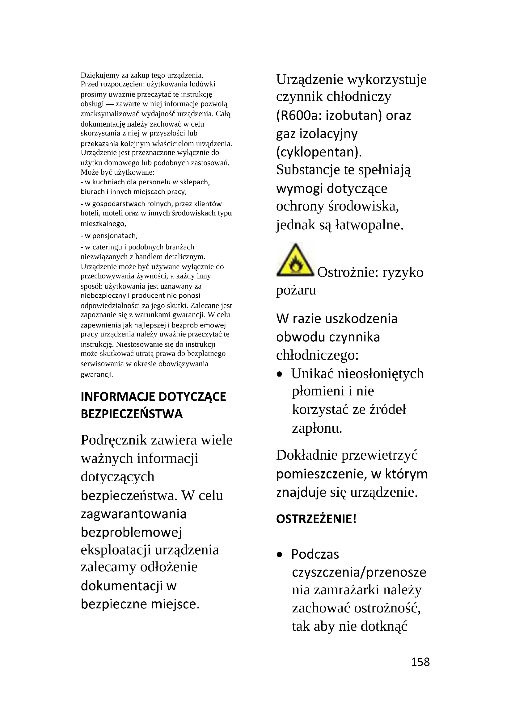 BEZPIECZEŃSTWA Podręcznik zawiera wiele ważnych informacji dotyczących bezpieczeństwa. W celu zagwarantowania bezproblemowej eksploatacji urządzenia zalecamy odłożenie dokumentacji w bezpieczne miejsce. Urządzenie wykorzystuje czynnik chłodniczy (R600a: izobutan) oraz gaz izolacyjny (cyklopentan). Substancje te spełniają wymogi dotyczące ochrony środowiska, jednak są łatwopalne. Ostrożnie: ryzyko pożaru W razie uszkodzenia obwodu czynnika chłodniczego:
