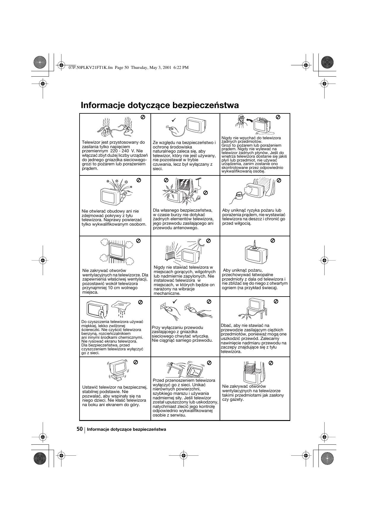 07P.50PLKV21FT1K.fm Page 50 Thursday, May 3, 2001 6:22 PM Informacje dotyczące bezpieczeństwa Telewizor jest przystosowany do zasilania tylko napięciem przemiennym 220 - 240 V. Nie włączać zbyt dużej liczby urządzeń do jednego gniazdka sieciowegogrozi to pożarem lub porażeniem prądem. Ze względu na bezpieczeństwo i ochronę środowiska naturalnego zaleca się, aby telewizor, który nie jest używany, nie pozostawał w trybie czuwania, lecz był wyłączany z sieci. Nie otwierać obudowy ani nie zdejmować pokrywy z tyłu telewizora. Naprawy powierzać tylko wykwalifikowanym osobom. Dla własnego bezpieczeństwa, w czasie burzy nie dotykać żadnych elementów telewizora, jego przewodu zasilającego ani przewodu antenowego. Nie zakrywać otworów wentylacyjnych na telewizorze. Dla zapewnienia właściwej wentylacji, pozostawić wokół telewizora przynajmniej 10 cm wolnego miejsca. Nigdy nie stawiać telewizora w miejscach gorących, wilgotnych lub nadmiernie zapylonych. Nie instalować telewizora w miejscach, w których będzie on narażony na wibracje mechaniczne. Do czyszczenia telewizora używać miękkiej, lekko zwilżonej ściereczki. Nie czyścić telewizora benzyną, rozcieńczalnikiem ani innymi środkami chemicznymi. Nie rysować ekranu telewizora. Dla bezpieczeństwa, przed czyszczeniem telewizora wyłączyć go z sieci. Ustawić telewizor na bezpiecznej, stabilnej podstawie. Nie pozwalać, aby wspinały się na niego dzieci. Nie kłaść telewizora na boku ani ekranem do góry.
