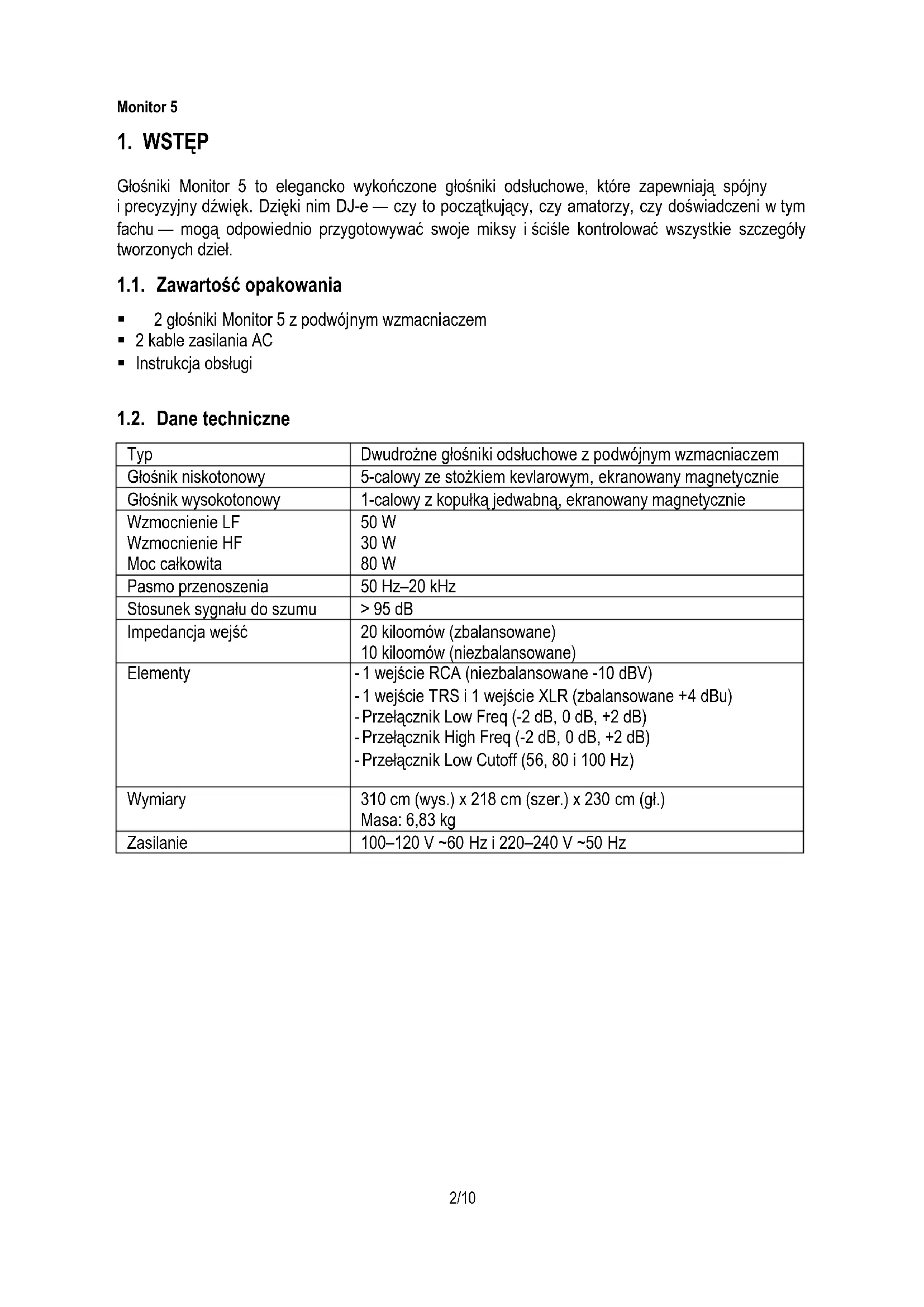 Głośniki Monitor 5 to elegancko wykończone głośniki odsłuchowe, które zapewniają spójny i precyzyjny dźwięk. Dzięki nim DJ-e — czy to początkujący, czy amatorzy, czy doświadczeni w tym fachu — mogą odpowiednio przygotowywać swoje miksy i ściśle kontrolować wszystkie szczegóły tworzonych dzieł. 1.1. Zawartość opakowania 2 głośniki Monitor 5 z podwójnym wzmacniaczem 2 kable zasilania AC Instrukcja obsługi 1.2. Dane techniczne Typ Dwudrożne głośniki odsłuchowe z podwójnym wzmacniaczem Głośnik niskotonowy 5-calowy ze stożkiem kevlarowym, ekranowany magnetycznie Głośnik wysokotonowy 1-calowy z kopułką jedwabną, ekranowany magnetycznie Wzmocnienie LF Wzmocnienie HF Moc całkowita 50 W 30 W 80 W Pasmo przenoszenia 50 Hz–20 kHz Stosunek sygnału do szumu > 95 dB Impedancja wejść 20 kiloomów (zbalansowane) 10 kiloomów (niezbalansowane) Elementy - 1 wejście RCA (niezbalansowane -10 dBV) - 1 wejście TRS i 1 wejście XLR (zbalansowane +4 dBu) - Przełącznik Low Freq (-2 dB, 0 dB, +2 dB) - Przełącznik High Freq (-2 dB, 0 dB, +2 dB) - Przełącznik Low Cutoff (56, 80 i 100 Hz) Wymiary 310 cm (wys.) x 218 cm (szer.) x 230 cm (gł.) Masa: 6,83 kg Zasilanie 100–120 V ~60 Hz i 220–240 V ~50 HzMonitor 5 3/10