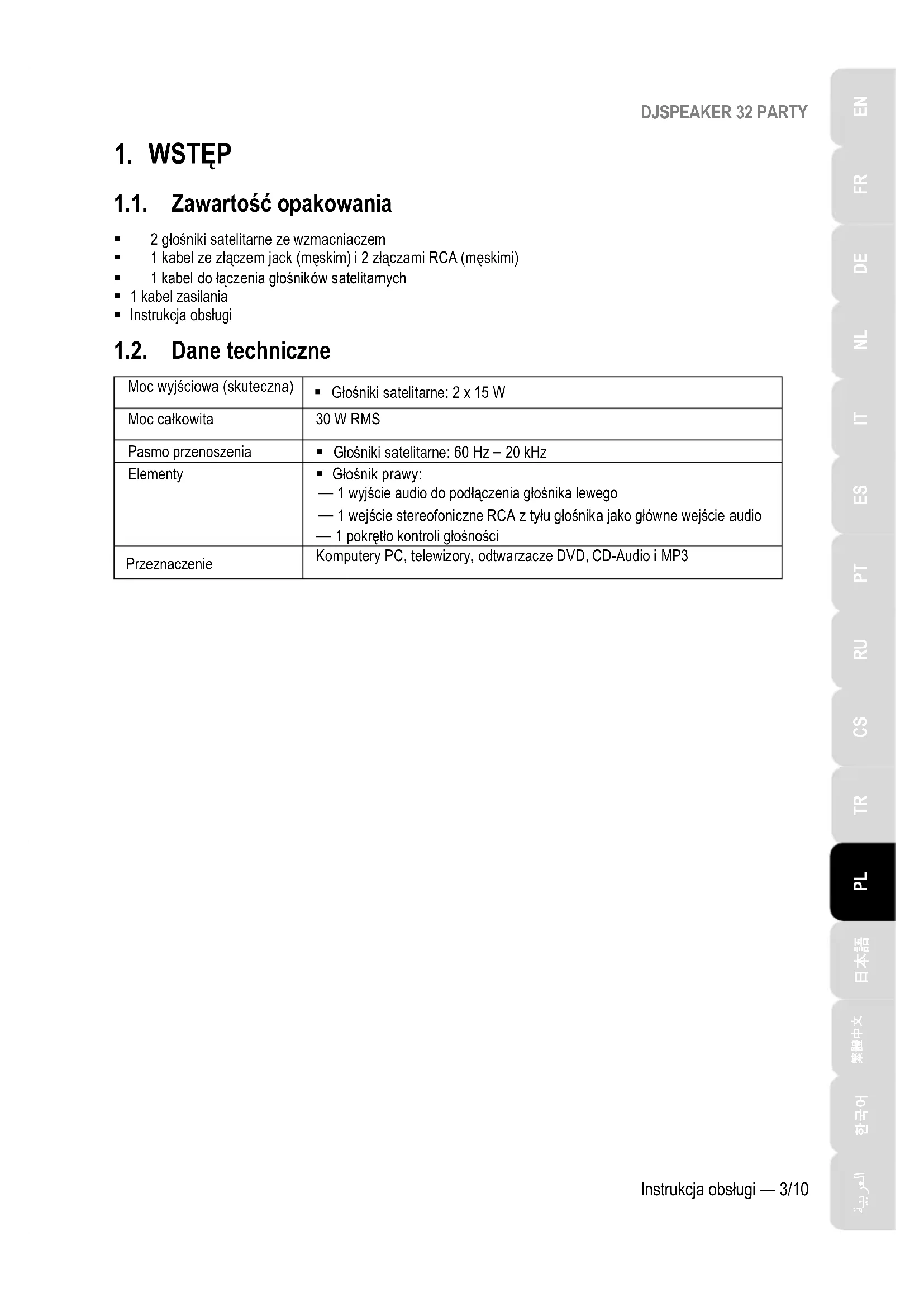 1.1. Zawartość opakowania 2 głośniki satelitarne ze wzmacniaczem 1 kabel ze złączem jack (męskim) i 2 złączami RCA (męskimi) 1 kabel do łączenia głośników satelitarnych 1 kabel zasilania Instrukcja obsługi 1.2. Dane techniczne Moc wyjściowa (skuteczna) Głośniki satelitarne: 2 x 15 W Moc całkowita 30 W RMS Pasmo przenoszenia Głośniki satelitarne: 60 Hz – 20 kHz Elementy Głośnik prawy: — 1 wyjście audio do podłączenia głośnika lewego — 1 wejście stereofoniczne RCA z tyłu głośnika jako główne wejście audio — 1 pokrętło kontroli głośności Przeznaczenie Komputery PC, telewizory, odtwarzacze DVD, CD-Audio i MP3DJSPEAKER 32 PARTY 4/10 — Instrukcja obsługi 1.3. Zalecenia - Ustaw głośniki satelitarne na płaskiej powierzchni, aby do minimum ograniczyć ryzyko ich upadku. - Nie otwieraj zestawu głośników, ponieważ grozi to uszkodzeniem jego elementów wewnętrznych. - Zestaw głośników jest przeznaczony do użytku w klimacie umiarkowanym. - Aby uniknąć ryzyka pożaru i wyładowań elektrycznych, zestaw głośników należy trzymać z dala od: - deszczu i wilgoci oraz wszelkich płynów (wody, środków chemicznych i innych cieczy); - źródeł ciepła, takich jak grzejniki, piecyki i inne urządzenia wytwarzające ciepło (w tym wzmacniacze); - bezpośredniego światła słonecznego. - Nie ustawiaj zestawu głośników w miejscu, w którym byłby narażony na zachlapanie lub zalanie wodą. - Nigdy nie stawiaj na zestawie głośników przedmiotów wypełnionych płynem (kieliszków, wazonów itp.). - Jeśli nie zamierzasz korzystać z zestawu głośników przez dłuższy czas, odłącz kabel zasilania. W tym celu chwyć i wyciągnij wtyczkę — nigdy nie ciągnij za sam kabel. - Dbaj o to, aby po podłączeniu do gniazda elektrycznego wtyczka zasilania zestawu głośników była łatwo dostępna. - Chcąc wyczyścić zestaw głośników, najpierw go odłącz. Czyść zestaw wilgotną szmatką i nie stosuj środków czyszczących w aerozolu. - Wtyczka zasilania zestawu głośników służy do wyłączania zasilania urządzenia i dlatego musi być zawsze łatwo dostępna. - Oznaczenia znajdują się z tyłu głośników.