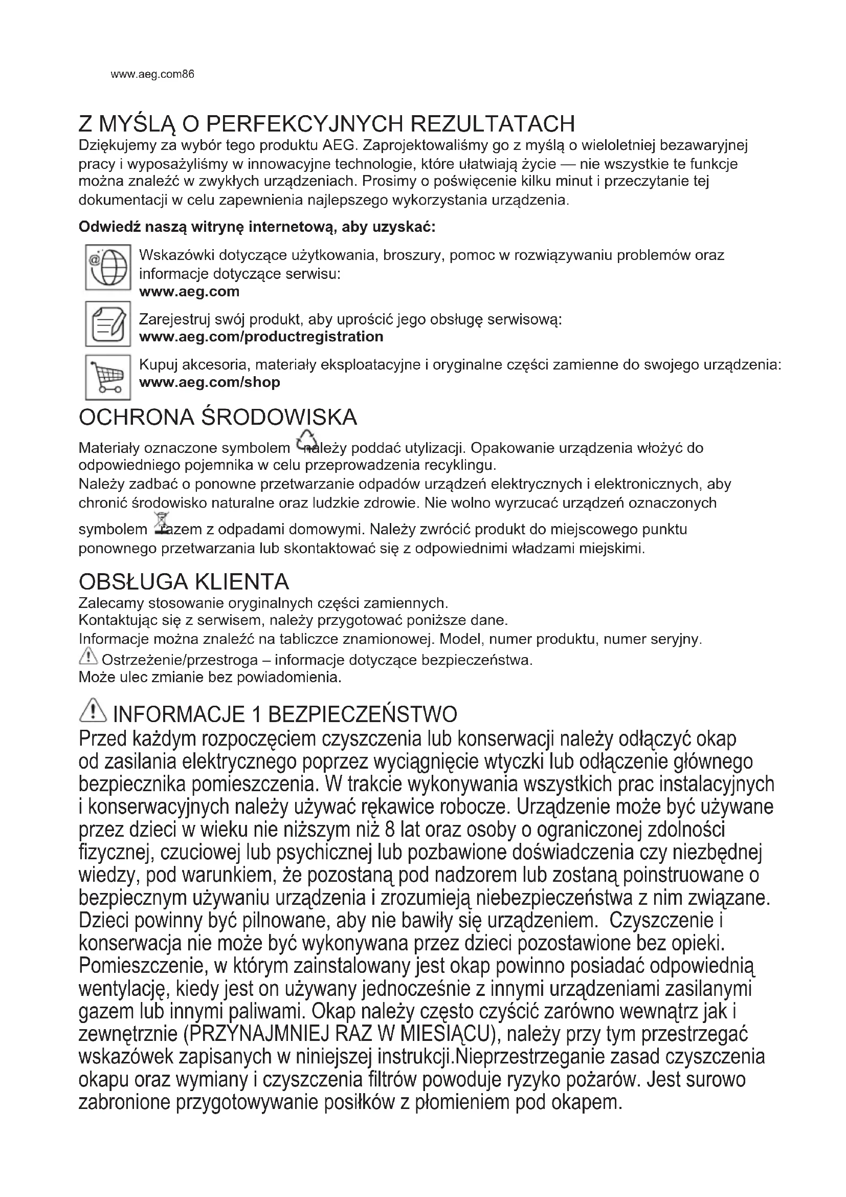 Dziękujemy za wybór tego produktu AEG. Zaprojektowaliśmy go z myślą o wieloletniej bezawaryjnej pracy i wyposażyliśmy w innowacyjne technologie, które ułatwiają życie — nie wszystkie te funkcje można znaleźć w zwykłych urządzeniach. Prosimy o poświęcenie kilku minut i przeczytanie tej dokumentacji w celu zapewnienia najlepszego wykorzystania urządzenia. Odwiedź naszą witrynę internetową, aby uzyskać: Wskazówki dotyczące użytkowania, broszury, pomoc w rozwiązywaniu problemów oraz informacje dotyczące serwisu: www.aeg.com Zarejestruj swój produkt, aby uprościć jego obsługę serwisową: www.aeg.com/productregistration Kupuj akcesoria, materiały eksploatacyjne i oryginalne części zamienne do swojego urządzenia: www.aeg.com/shop OCHRONA ŚRODOWISKA Materiały oznaczone symbolem należy poddać utylizacji. Opakowanie urządzenia włożyć do odpowiedniego pojemnika w celu przeprowadzenia recyklingu. Należy zadbać o ponowne przetwarzanie odpadów urządzeń elektrycznych i elektronicznych, aby chronić środowisko naturalne oraz ludzkie zdrowie. Nie wolno wyrzucać urządzeń oznaczonych symbolem razem z odpadami domowymi. Należy zwrócić produkt do miejscowego punktu ponownego przetwarzania lub skontaktować się z odpowiednimi władzami miejskimi.