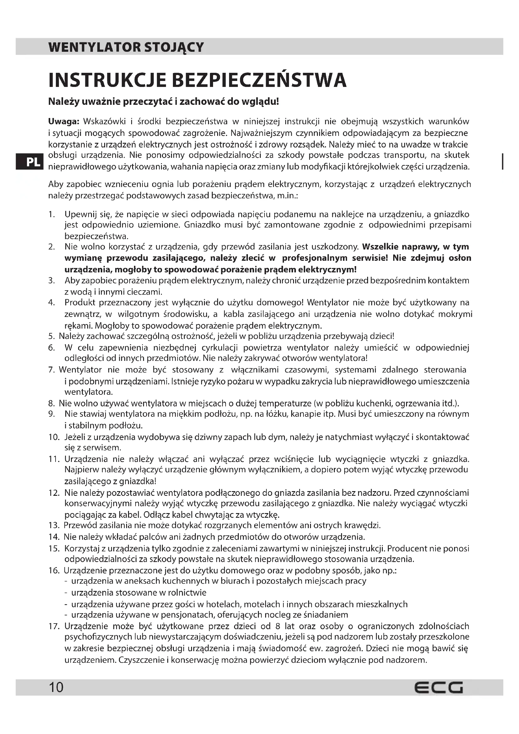 4. Produkt przeznaczony jest wyłącznie do użytku domowego! Wentylator nie może być użytkowany na