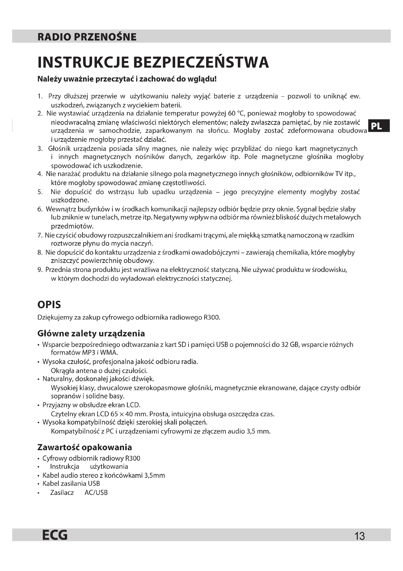 Należy uważnie przeczytać izachować do wglądu! 1. Przy dłuższej przerwie w użytkowaniu należy wyjąć baterie z urządzenia – pozwoli to uniknąć ew. uszkodzeń, związanych zwyciekiem baterii.2. Nie wystawiać urządzenia na działanie temperatur powyżej 60 °C, ponieważ mogłoby to spowodować nieodwracalną zmianę właściwości niektórych elementów; należy zwłaszcza pamiętać, by nie zostawić urządzenia w samochodzie, zaparkowanym na słońcu. Mogłaby zostać zdeformowana obudowa iurządzenie mogłoby przestać działać.3. Głośnik urządzenia posiada silny magnes, nie należy więc przybliżać do niego kart magnetycznych i innych magnetycznych nośników danych, zegarków itp. Pole magnetyczne głośnika mogłoby spowodować ich uszkodzenie.4. Nie narażać produktu na działanie silnego pola magnetycznego innych głośników, odbiorników TV itp., które mogłoby spowodować zmianę częstotliwości.5. Nie dopuścić do wstrząsu lub upadku urządzenia – jego precyzyjne elementy mogłyby zostać uszkodzone.6. Wewnątrz budynków iw środkach komunikacji najlepszy odbiór będzie przy oknie. Sygnał będzie słaby lub zniknie wtunelach, metrze itp. Negatywny wpływ na odbiór ma również bliskość dużych metalowych przedmiotów.7. Nie czyścić obudowy rozpuszczalnikiem ani środkami trącymi, ale miękką szmatką namoczoną wrzadkim roztworze płynu do mycia naczyń.8. Nie dopuścić do kontaktu urządzenia zśrodkami owadobójczymi – zawierają chemikalia, które mogłyby zniszczyć powierzchnię obudowy.9. Przednia strona produktu jest wrażliwa na elektryczność statyczną. Nie używać produktu wśrodowisku, wktórym dochodzi do wyładowań elektryczności statycznej. OPIS Dziękujemy za zakup cyfrowego odbiornika radiowego R300. Główne zalety urządzenia
