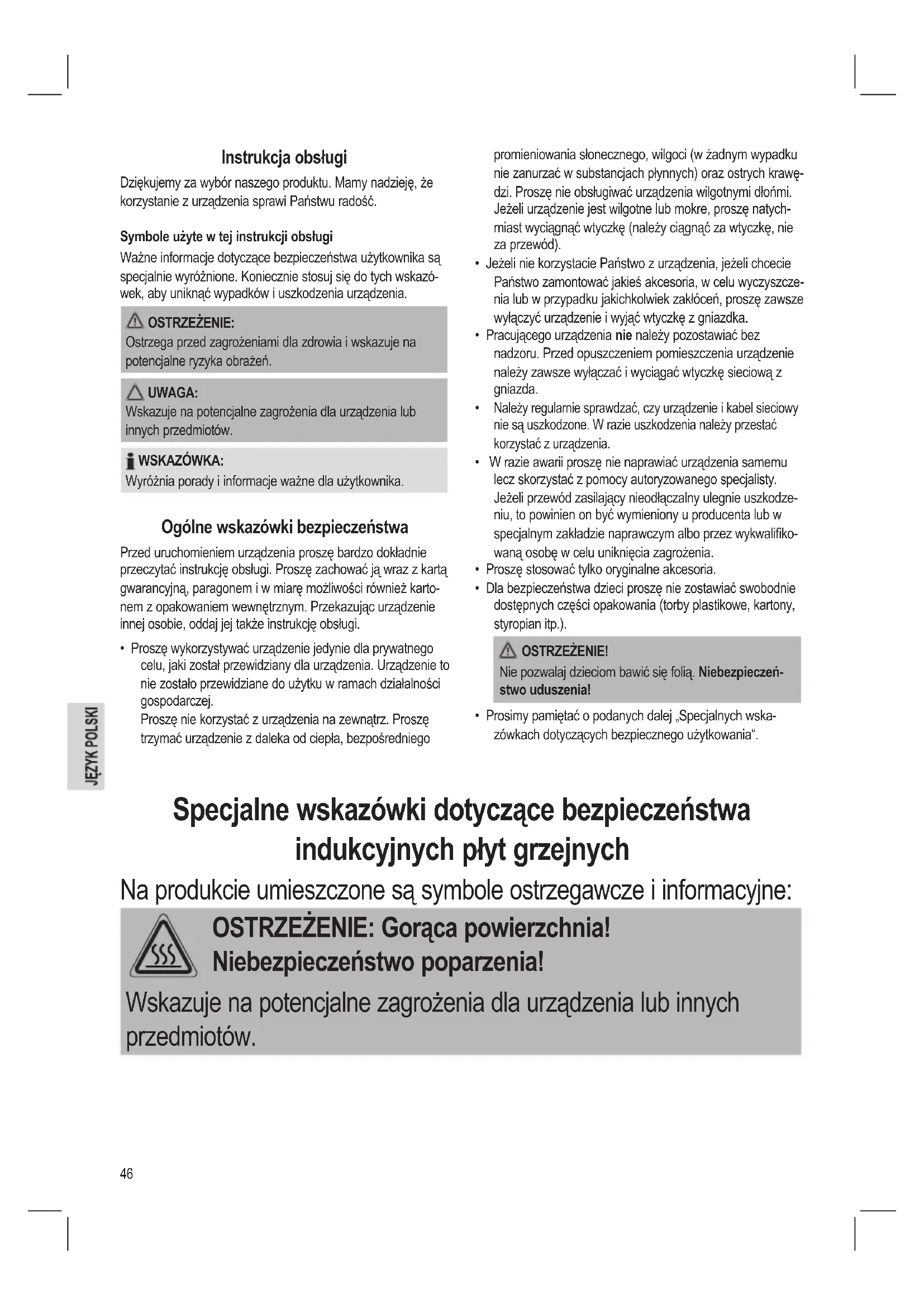 - Prosimy pamiętać o podanych dalej „Specjalnych wska- zówkach dotyczących bezpiecznego użytkowania“. Specjalne wskazówki dotyczące bezpieczeństwa indukcyjnych płyt grzejnych Na produkcie umieszczone są symbole ostrzegawcze i informacyjne: OSTRZEŻENIE: Gorąca powierzchnia! Niebezpieczeństwo poparzenia! Wskazuje na potencjalne zagrożenia dla urządzenia lub innych przedmiotów.47 OSTRZEŻENIE: