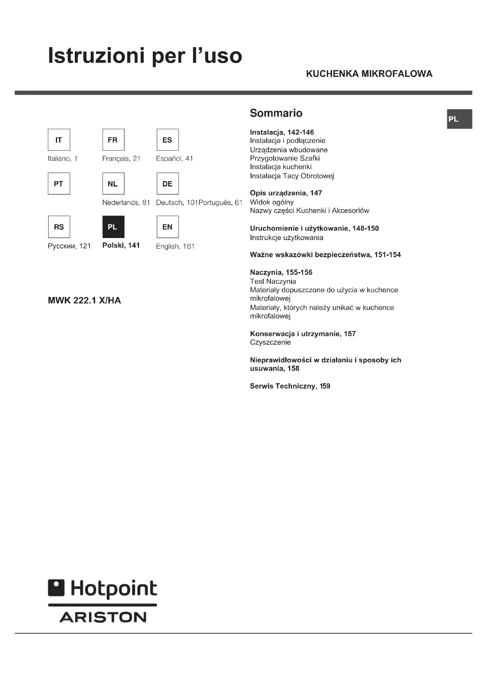 Indesit Company S.p.A Viale Aristide Merloni, 47 60044 Fabriano (AN) Italy www.indesitcompany.comRS 140PL Istruzioni per l’uso Sommario Instalacja, 142-146 Instalacja i podłączenie Urządzenia wbudowane Przygotowanie Szafki Instalacja kuchenki Instalacja Tacy Obrotowej Opis urządzenia, 147 Widok ogólny Nazwy części Kuchenki i Akcesoriów Uruchomienie i użytkowanie, 148-150 Instrukcje użytkowania Ważne wskazówki bezpieczeństwa, 151-154 Naczynia, 155-156 Test Naczynia Materiały dopuszczone do użycia w kuchence mikrofalowej Materiały, których należy unikać w kuchence mikrofalowej Konserwacja i utrzymanie, 157 Czyszczenie Nieprawidłowości w działaniu i sposoby ich usuwania, 158 Serwis Techniczny, 1