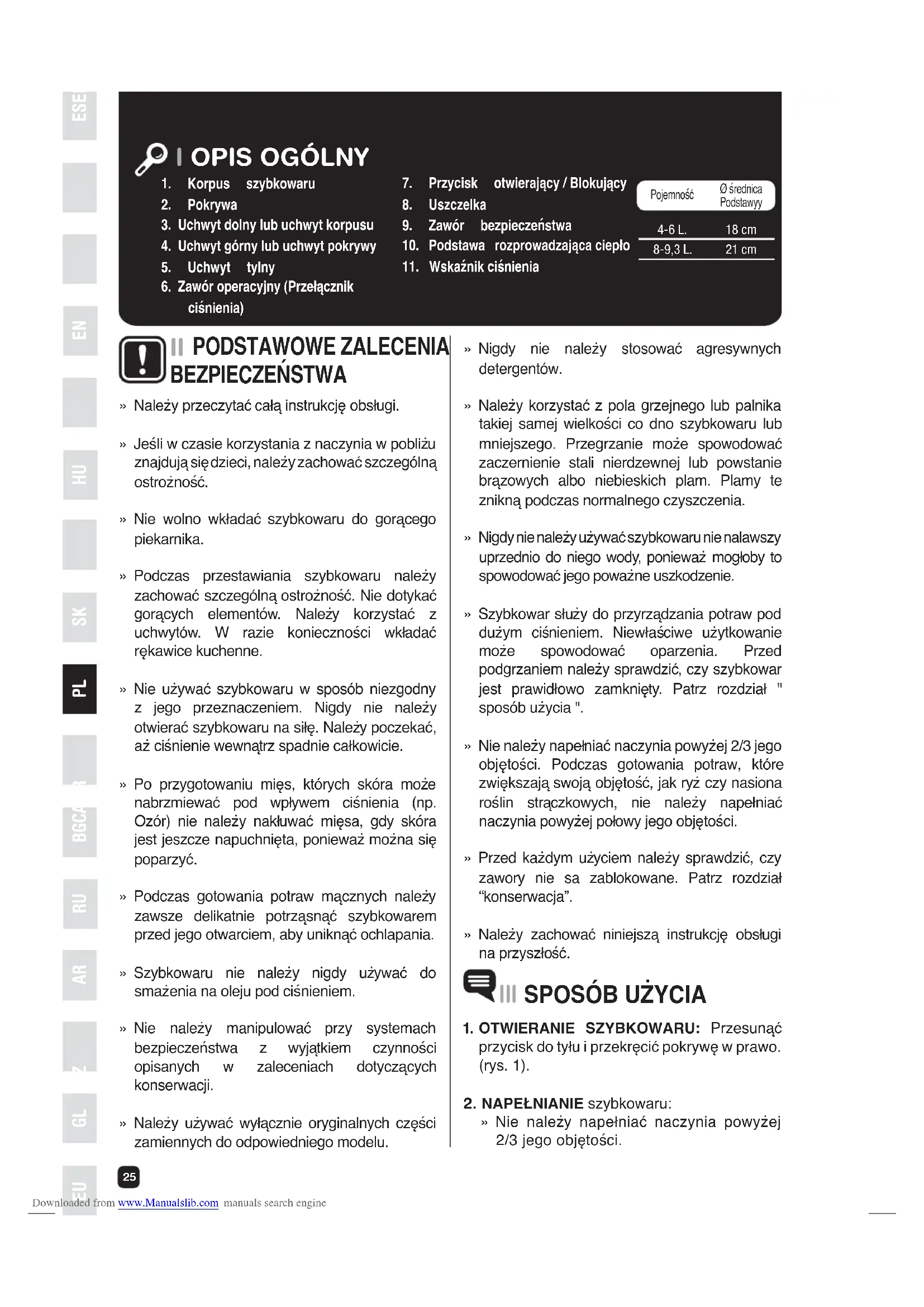 » Nie należy napełniać naczynia powyżej 2/3 jego objętości. Pojemność Ø średnica Podstawyy 4-6 L. 8-9,3 L. 18 cm 21 cm » Należy przeczytać całą instrukcję obsługi. » Jeśli w czasie korzystania z naczynia w pobliżu znajdują się dzieci, należy zachować szczególną ostrożność. » Nie wolno wkładać szybkowaru do gorącego piekarnika. » Podczas przestawiania szybkowaru należy zachować szczególną ostrożność. Nie dotykać gorących elementów. Należy korzystać z uchwytów. W razie konieczności wkładać rękawice kuchenne. » Nie używać szybkowaru w sposób niezgodny z jego przeznaczeniem. Nigdy nie należy otwierać szybkowaru na siłę. Należy poczekać, aż ci śnienie wewnątrz spadnie całkowicie. » Po przygotowaniu mięs, których skóra może nabrzmiewać pod wpływem ciśnienia (np. Ozór) nie należy nakłuwać mięsa, gdy skóra jest jeszcze napuchnięta, ponieważ można się poparzyć. » Podczas gotowania potraw mącznych należy zawsze delikatnie potrząsnąć szybkowarem przed jego otwarciem, aby uniknąć ochlapania. » Szybkowaru nie należy nigdy używać do smażenia na oleju pod ciśnieniem. » Nie należy manipulować przy systemach bezpieczeństwa z wyjątkiem czynności opisanych w zaleceniach dotyczących konserwacji. » Należy używać wyłącznie oryginalnych części zamiennych do odpowiedniego modelu.