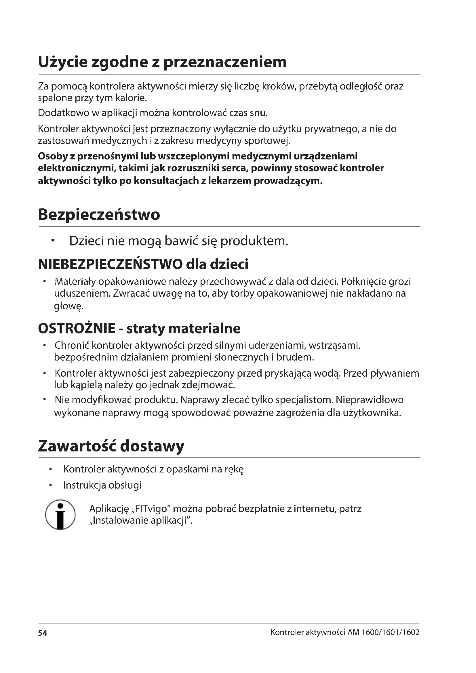 Kontroler aktywności AM 1600/1601/1602 Użycie zgodne z przeznaczeniem Za pomocą kontrolera aktywności mierzy się liczbę kroków, przebytą odległość oraz spalone przy tym kalorie. Dodatkowo w aplikacji można kontrolować czas snu. Kontroler aktywności jest przeznaczony wyłącznie do użytku prywatnego, a nie do zastosowań medycznych i z zakresu medycyny sportowej. Osoby z przenośnymi lub wszczepionymi medycznymi urządzeniami elektronicznymi, takimi jak rozruszniki serca, powinny stosować kontroler aktywności tylko po konsultacjach z lekarzem prowadzącym. Bezpieczeństwo Dzieci nie mogą bawić się produktem. NIEBEZPIECZEŃSTWO dla dzieci Materiały opakowaniowe należy przechowywać z dala od dzieci. Połknięcie grozi uduszeniem. Zwracać uwagę na to, aby torby opakowaniowej nie nakładano na głowę. OSTROŻNIE - straty materialne Chronić kontroler aktywności przed silnymi uderzeniami, wstrząsami, bezpośrednim działaniem promieni słonecznych i brudem. Kontroler aktywności jest zabezpieczony przed pryskającą wodą. Przed pływaniem lub kąpielą należy go jednak zdejmować. Nie modykować produktu. Naprawy zlecać tylko specjalistom. Nieprawidłowo wykonane naprawy mogą spowodować poważne zagrożenia dla użytkownika. Zawartość dostawy Kontroler aktywności z opaskami na rękę Instrukcja obsługi Aplikację „FITvigo” można pobrać bezpłatnie z internetu, patrz „Instalowanie aplikacji”. Druckbuch M 1600_01_02 Langanleitung.indb 54 11.10.2016 12:45:34W skrócie