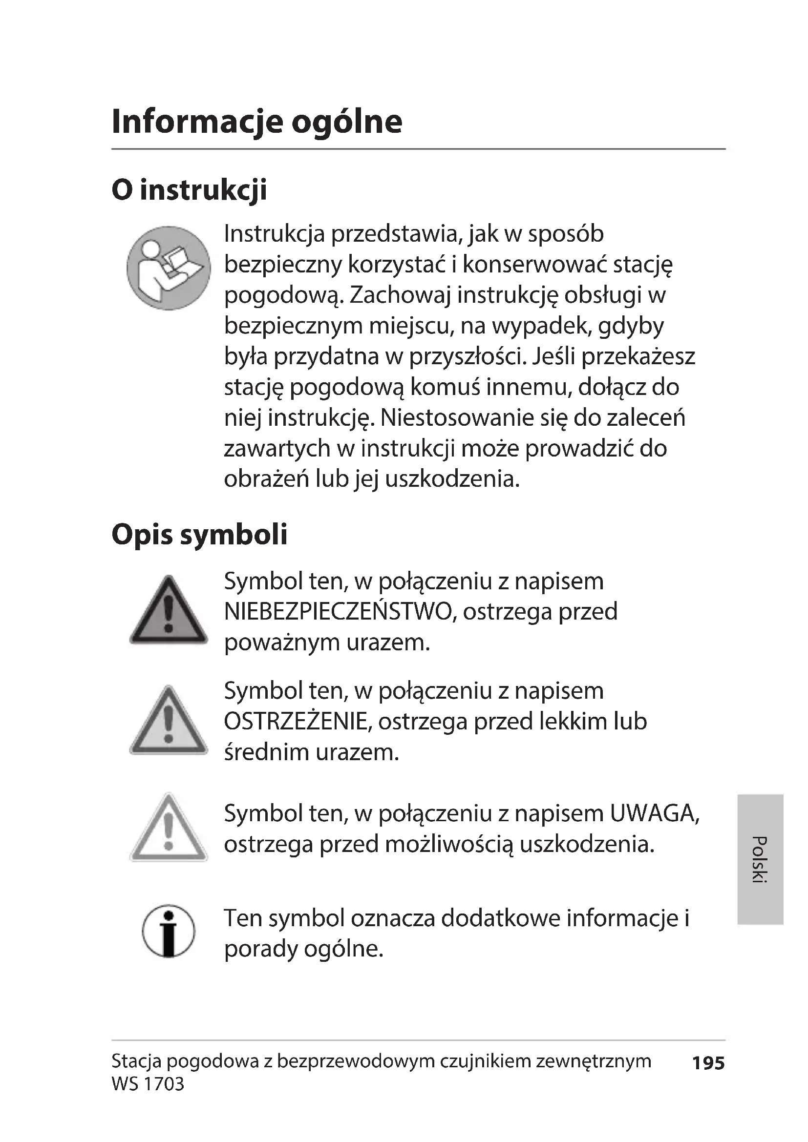 - Utylizacja FW Station.indb 194 26.04.2017 10:02:56195 Stacja pogodowa z bezprzewodowym czujnikiem zewnętrznym WS 1703 Polski Informacje ogólne O instrukcji Instrukcja przedstawia, jak w sposób bezpieczny korzystać i konserwować stację pogodową. Zachowaj instrukcję obsługi w bezpiecznym miejscu, na wypadek, gdyby była przydatna w przyszłości. Jeśli przekażesz stację pogodową komuś innemu, dołącz do niej instrukcję. Niestosowanie się do zaleceń zawartych w instrukcji może prowadzić do obrażeń lub jej uszkodzenia. Opis symboli Symbol ten, w połączeniu z napisem NIEBEZPIECZEŃSTWO, ostrzega przed poważnym urazem. Symbol ten, w połączeniu z napisem OSTRZEŻENIE, ostrzega przed lekkim lub średnim urazem. Symbol ten, w połączeniu z napisem UWAGA, ostrzega przed możliwością uszkodzenia. Ten symbol oznacza dodatkowe informacje i porady ogólne. FW Station.indb 195 26.04.2017 10:02:56196 Stacja pogodowa z bezprzewodowym czujnikiem zewnętrznym WS 1703 Przeznaczenie Stacja pogodowa, składająca się ze stacji bazowej i zewnętrznego czujnika bezprzewodowego wyświetla różne informacje o pogodzie (ciśnienie atmosferyczne, temperaturę, itp.) w najbliższej okolicy. Stacja pogodowa prognozuje pogodę na podstawie pomiarów warunków atmosferycznych. Ponadto stacja pogodowa podaje datę, godzinę, fazy księżyca i ma zintegrowany alarm. Stacja pogodowa nie nadaje się do wykorzystania komercyjnego polegającego na tworzeniu prognoz pogody ani do dokonywania pomiarów meteorologicznych. Zasady bezpieczeństwa Ze stacji mogą korzystać dzieci po ukończeniu ósmego roku życia oraz osoby o obniżonej sprawności zycznej, sensorycznej lub psychicznej, lub nieposiadające doświadczenia i/lub wiedzy, o ile są pod nadzorem lub zostały poinstruowane w zakresie bezpiecznego korzystania z urządzenia i rozumieją potencjalne niebezpieczeństwa z jakimi może się to wiązać. Urządzenie i zasilacz należy trzymać w miejscu niedostępnym dla dzieci poniżej 8roku życia. FW Station.indb 196 26.04.2017 10:02:56197 Stacja pogodowa z bezprzewodowym czujnikiem zewnętrznym WS 1703 Polski Dzieci nie mogą czyścić urządzenia i wykonywać czynności konserwacyjnych, o ile nie ukończyły 8 lat i nie są nadzorowane. Należy pilnować, aby dzieci nie bawiły się urządzeniem. Stacji pogodowej i zasilacza nie wolno zanurzać w wodzie lub innych cieczach. Grozi to porażeniem! Nie należy zatem umieszczać stacji bazowej w pobliżu źródeł wilgoci, na przykład umywalek. Należy korzystać wyłącznie z dołączonego zasilacza i wymienić go na zasilacz tego samego typu. Zasilacz można stosować jedynie w suchych pomieszczeniach i należy chronić go przed działaniem wilgoci. Niebezpieczeństwo dla dzieci Połknięcie baterii może oznaczać zagrożenie życia. Dlatego stację pogodową, czujnik bezprzewodowy i baterie należy trzymać w miejscu niedostępnym dla małych dzieci. W razie połknięcia baterii należy niezwłocznie skorzystać z pomocy medycznej. Upewnij się, że dzieci nie mają dostępu do opakowania i małych części zawartych w zestawie. W razie połknięcia grozi to zadławieniem. FW Station.indb 197 26.04.2017 10:02:56198 Stacja pogodowa z bezprzewodowym czujnikiem zewnętrznym WS 1703 Ryzyko porażenia prądem (przy korzystaniu z zasilacza) Podłącz urządzenie do prawidłowo zainstalowanego kontaktu o napięciu odpowiadającemu napięciu podanemu w „Danych technicznych”. Upewnij się, że gniazdko jest łatwo dostępne, aby w razie potrzeby szybko odłączyć zasilacz. Nie należy używać stacji, jeśli zasilacz lub kabel zasilacza są uszkodzone. Nie zasłaniaj zasilacza zasłoną, gazetą itp. i upewnij się, że jest odpowiednio wietrzony. Zasilacz może się nagrzewać. Przed podłączeniem zasilacza całkowicie rozwiń jego kabel. Uważaj, aby przy tym nie uszkodzić kabla ostrymi rogami lub gorącymi przedmiotami. Wyciągnij kabel zasilający z gniazdka: − przed czyszczeniem bezprzewodowej stacji pogodowej, − jeśli w trakcie pracy występują zakłócenia, na czas burzy. − Zawsze wyciągaj trzymając za wtyczkę, nie za kabel. FW Station.indb 198 26.04.2017 10:02:56199 Stacja pogodowa z bezprzewodowym czujnikiem zewnętrznym WS 1703 Polski Nie wprowadzaj zmian we wtyczce lub kablu. Naprawę przeprowadzać mogą jedynie specjalistyczne warsztaty, ponieważ nieprawidłowo naprawione urządzenia mogą stanowić zagrożenie. Nie wymieniaj kabla zasilającego. Uszkodzony kabel lub zasilacz należy zezłomować i zastąpić zasilaczem tego samego typu. Ryzyko obrażeń Uwaga: Niewłaściwe użytkowanie baterii grozi wybuchem. Nie należy ponownie ładować baterii, regenerować ich innymi metodami, rozbierać, wrzucać do ognia ani powodować spięć. Unikaj kontaktu płynu znajdującego się w baterii ze skórą, oczami i błonami śluzowymi. W razie kontaktu z cieczą należy niezwłocznie przepłukać miejsce kontaktu czystą wodą i skontaktować się z lekarzem. Uwaga na możliwość uszkodzenia Chroń stację bazową i zewnętrzny czujnik przed kurzem, wstrząsami, ekstremalnymi temperaturami i światłem słonecznym. Chroń stację bazową przed wilgocią. Stację należy umieścić jedynie w suchym, zamkniętym pomieszczeniu. FW Station.indb 199 26.04.2017 10:02:57200 Stacja pogodowa z bezprzewodowym czujnikiem zewnętrznym WS 1703 Czujnik bezprzewodowy jest zabezpieczony przed wilgocią, ale należy chronić go przed bezpośrednim działaniem cieczy, np. przed deszczem. Po wyczerpaniu baterii lub gdy urządzenie nie jest używane należy wyciągnąć baterie ze stacji bazowej i czujnika zewnętrznego. Dzięki temu unikniesz uszkodzeń, które mogą spowodować wyciek kwasu akumulatorowego. Nie narażaj baterii na działanie ekstremalnych warunków, np. przez przechowywanie ich na grzejniku lub nasłonecznionym miejscu. Zwiększa to ryzyko wycieku! W razie potrzeby, przed włożeniem wyczyść baterie oraz styki. Zawsze