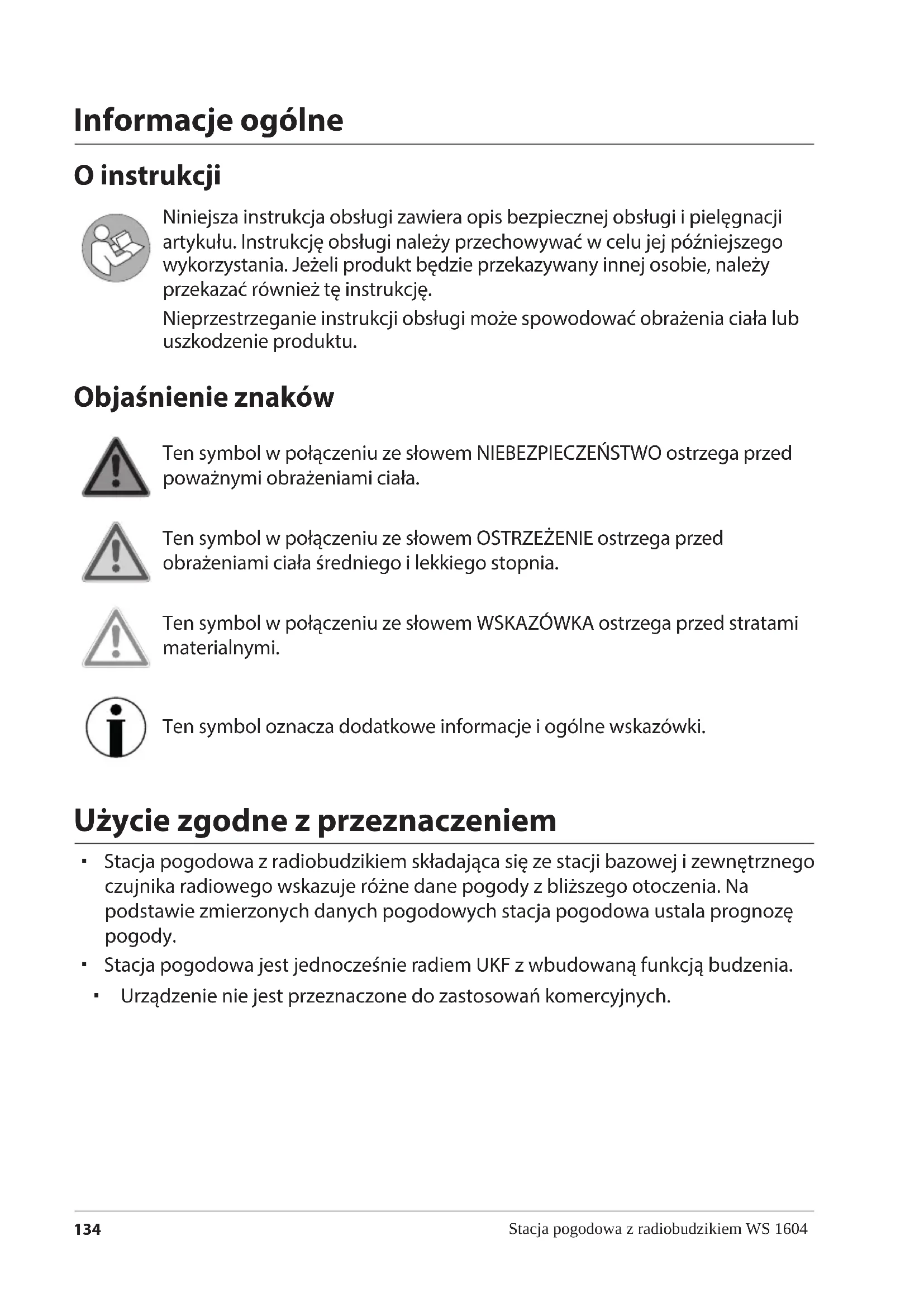 Stacja pogodowa z radiobudzikiem WS 1604 Informacje ogólne O instrukcji Niniejsza instrukcja obsługi zawiera opis bezpiecznej obsługi i pielęgnacji artykułu. Instrukcję obsługi należy przechowywać w celu jej późniejszego wykorzystania. Jeżeli produkt będzie przekazywany innej osobie, należy przekazać również tę instrukcję. Nieprzestrzeganie instrukcji obsługi może spowodować obrażenia ciała lub uszkodzenie produktu. Objaśnienie znaków Ten symbol w połączeniu ze słowem NIEBEZPIECZEŃSTWO ostrzega przed poważnymi obrażeniami ciała. Ten symbol w połączeniu ze słowem OSTRZEŻENIE ostrzega przed obrażeniami ciała średniego i lekkiego stopnia. Ten symbol w połączeniu ze słowem WSKAZÓWKA ostrzega przed stratami materialnymi. Ten symbol oznacza dodatkowe informacje i ogólne wskazówki. Użycie zgodne z przeznaczeniem Stacja pogodowa z radiobudzikiem składająca się ze stacji bazowej i zewnętrznego czujnika radiowego wskazuje różne dane pogody z bliższego otoczenia. Na podstawie zmierzonych danych pogodowych stacja pogodowa ustala prognozę pogody. Stacja pogodowa jest jednocześnie radiem UKF z wbudowaną funkcją budzenia. Urządzenie nie jest przeznaczone do zastosowań komercyjnych. Druckbuch WS1604 Alle Sprachen.indb 134 21.02.2017 09:25:42Bezpieczeństwo