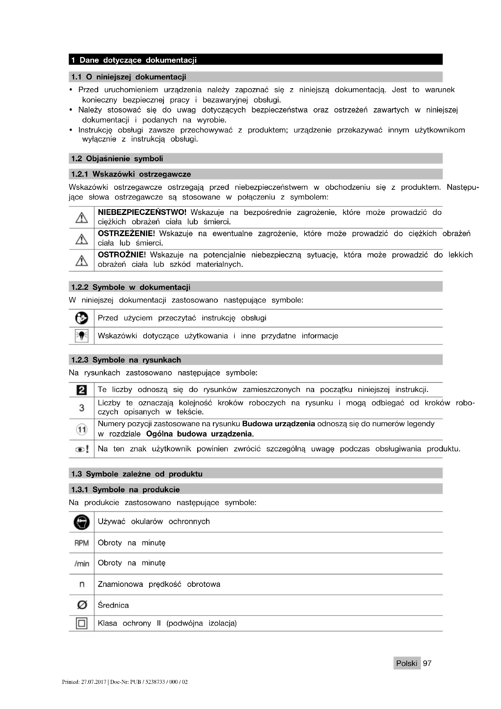 OSTROŻNIE Niebezpieczeństwo obrażeń ciała! Niezamierzone włączenie produktu. ▶ Przed przystąpieniem do nastawiania urządzenia lub wymiany osprzętu, wyciągnąć wtyczkę z gniazda. Należy przestrzegać wskazówek dotyczących bezpieczeństwa oraz ostrzeżeń zawartych w niniejszej doku- mentacji i podanych na produkcie. Printed: 27.07.2017 | Doc-Nr: PUB / 5238733 / 000 / 02104 Polski