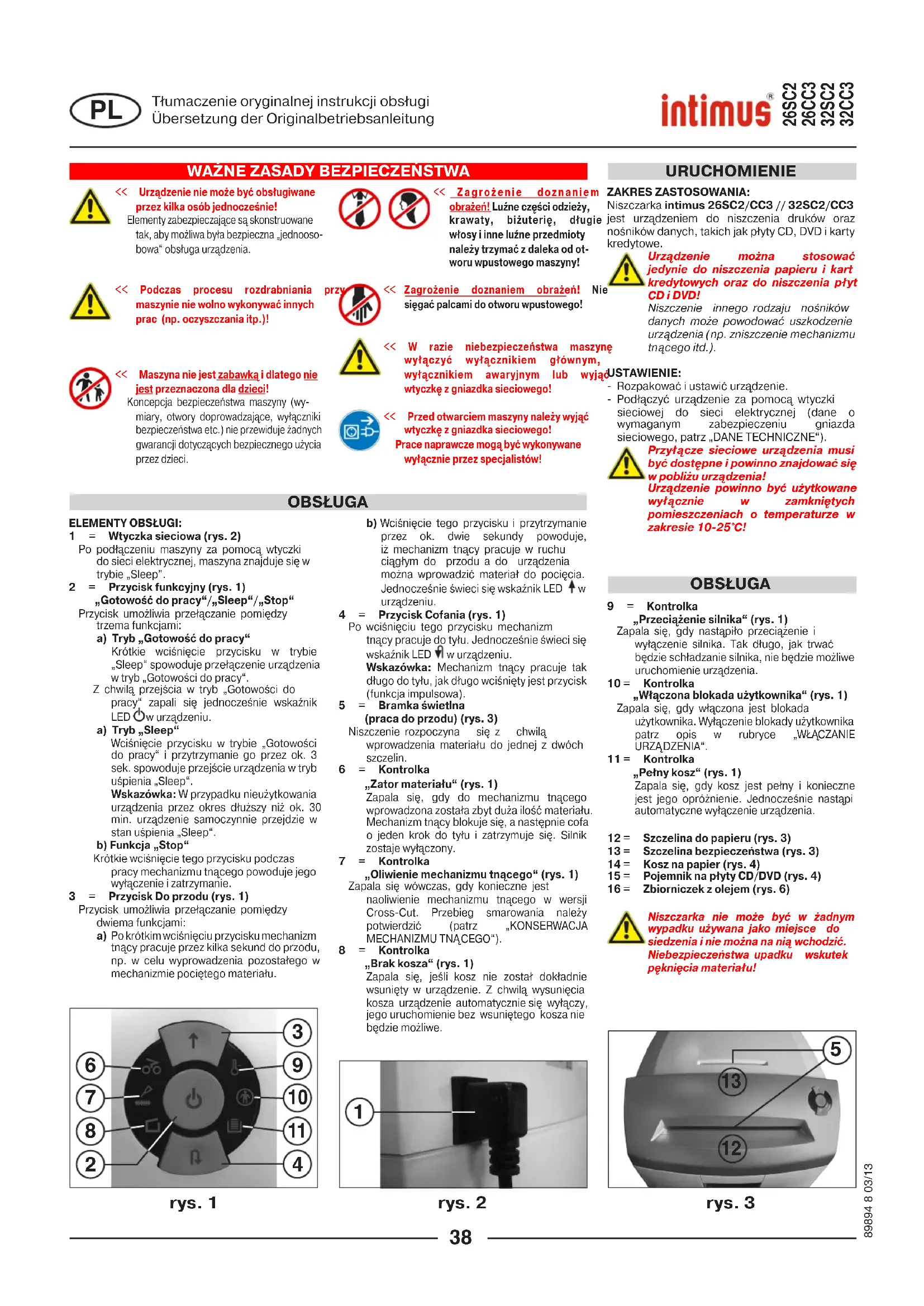 liitäntäjännite/taajuus · virranottoteho · teho intimus 26SC2 220-240V/50Hz · 1,7 A · 0,39 kW 120V/60Hz · 2,9 A · 0,35 kW intimus 26CC3 220-240V/50Hz · 1,7 A · 0,39 kW 120V/60Hz · 2,9 A · 0,35 kW intimus 32SC2 220-240V/50Hz · 1,9 A · 0,44 kW 120V/60Hz · 3,5 A · 0,42 kW intimus 32CC3 220-240V/50Hz · 1,9 A · 0,44 kW 120V/60Hz · 3,5 A · 0,42 kW Leikkuuleveys Leikkuuteho Työleveys Ajoittainen käyttö Paino paperia / CD,DVD paperia / CD,DVD PÄÄLLE / POIS PÄÄLTÄ L x S x K intimus 26SC2 276-4S 4 mm / 8 mm 13 arkkia* / 1 kappale 240 mm ca. 55 dB(A) 10 / 45 min 390 x 330 x 550 mm 16 kg intimus 26CC3 276-4C 4x28 mm / 8 mm 9 arkkia* / 1 kappale 240 mm ca. 55 dB(A) 10 / 45 min 390 x 330 x 550 mm 16,2 kg intimus 32SC2 277-4S 4 mm / 8 mm 17 arkkia* / 1 kappale 240 mm ca. 55 dB(A) 10 / 45 min 390 x 360 x 600 mm 16,5 kg intimus 32CC3 277-4C 4x28 mm / 8 mm 12 arkkia* / 1 kappale 240 mm ca. 55 dB(A) 10 / 45 min 390 x 360 x 600 mm 16,7 kg TEKNISET TIEDOT ERIKOISVARUSTUS Nimike Muovisäkki, 300x300x700x0,018 mm 99925Öljypullo, 110 ml 88035 Kun haluat tilata lisävarusteita tai varaosia, käänny ammattiliikkeen puoleen.kuva 5kuva 6 Alkuperäisen käyttöohjeen käännös Übersetzung der Originalbetriebsanleitung Sulake (hidas): 220-240V = 10 A / 120V = 15 AWAŻNEZASADYBEZPIECZEŃSTWA << Urządzenieniemożebyćobsługiwaneprzezkilkaosóbjednocześnie! Elementy zabezpieczające są skonstruowane tak, aby możliwa była bezpieczna „jednooso-bowa“ obsługa urządzenia.<< Podczas procesu rozdrabniania przymaszynieniewolnowykonywaćinnychprac(np.oczyszczaniaitp.)!<< Maszynaniejestzabawkąidlategoniejestprzeznaczonadladzieci! Koncepcja bezpieczeństwa maszyny (wy-miary, otwory doprowadzające, wyłączniki bezpieczeństwa etc.) nie przewiduje żadnych gwarancji dotyczących bezpiecznego użycia przez dzieci.<< Zagrożenie doznaniemobrażeń!Luźneczęściodzieży,krawaty, biżuterię, długiewłosyiinneluźneprzedmiotynależytrzymaćzdalekaodot-woruwpustowegomaszyny!<<Zagrożenie doznaniem obrażeń! Niesięgaćpalcamidootworuwpustowego!<< W razie niebezpieczeństwa maszynęwyłączyć wyłącznikiem głównym,wyłącznikiem awaryjnym lub wyjąćwtyczkęzgniazdkasieciowego!<< Przedotwarciemmaszynynależywyjąćwtyczkęzgniazdkasieciowego! Pracenaprawczemogąbyćwykonywanewyłącznieprzezspecjalistów!9 = Kontrolka „Przeciążeniesilnika“(rys.1) Zapala się, gdy nastąpiło przeciążenie i wyłączenie silnika. Tak długo, jak trwać będzie schładzanie silnika, nie będzie możliwe uruchomienie urządzenia.10= Kontrolka „Włączonablokadaużytkownika“(rys.1) Zapala się, gdy włączona jest blokada użytkownika. Wyłączenie blokady użytkownika patrz opis w rubryce „WŁĄCZANIE URZĄDZENIA“.11= Kontrolka „Pełnykosz“(rys.1) Zapala się, gdy kosz jest pełny i konieczne jest jego opróżnienie. Jednocześnie nastąpi automatyczne wyłączenie urządzenia.12= Szczelinadopapieru(rys.3)13= Szczelinabezpieczeństwa(rys.3)14= Kosznapapier(rys.4)15= PojemniknapłytyCD/DVD(rys.4)16= Zbiorniczekzolejem(rys.6) Niszczarka nie może być w żadnym wypadku używana jako miejsce do siedzenia i nie można na nią wchodzić. Niebezpieczeństwa upadku wskutek pęknięcia materiału!ELEMENTYOBSŁUGI:1 = Wtyczkasieciowa(rys.2) Po podłączeniu maszyny za pomocą wtyczki do sieci elektrycznej, maszyna znajduje się w trybie „Sleep”.2 = Przyciskfunkcyjny(rys.1) „Gotowośćdopracy“/„Sleep“/„Stop“ Przycisk umożliwia przełączanie pomiędzy trzema funkcjami: a) Tryb„Gotowośćdopracy“ Krótkie wciśnięcie przycisku w trybie „Sleep“ spowoduje przełączenie urządzenia w tryb „Gotowości do pracy“. Z chwilą przejścia w tryb „Gotowości do pracy“ zapali się jednocześnie wskaźnik LED w urządzeniu. a) Tryb„Sleep“ Wciśnięcie przycisku w trybie „Gotowości do pracy“ i przytrzymanie go przez ok. 3 sek. spowoduje przejście urządzenia w tryb uśpienia „Sleep“. Wskazówka: W przypadku nieużytkowania urządzenia przez okres dłuższy niż ok. 30 min. urządzenie samoczynnie przejdzie w stan uśpienia „Sleep“. b) Funkcja„Stop“ Krótkie wciśnięcie tego przycisku podczas pracy mechanizmu tnącego powoduje jego wyłączenie i zatrzymanie.3 = PrzyciskDoprzodu(rys.1) Przycisk umożliwia przełączanie pomiędzy dwiema funkcjami: a) Po krótkim wciśnięciu przycisku mechanizm tnący pracuje przez kilka sekund do przodu, np. w celu wyprowadzenia pozostałego w mechanizmie pociętego materiału. b) Wciśnięcie tego przycisku i przytrzymanie przez ok. dwie sekundy powoduje, iż mechanizm tnący pracuje w ruchu ciągłym do przodu a do urządzenia można wprowadzić materiał do pocięcia. Jednocześnie świeci się wskaźnik LED w urządzeniu.4 = PrzyciskCofania(rys.1) Po wciśnięciu tego przycisku mechanizm tnący pracuje do tyłu. Jednocześnie świeci się wskaźnik LED w urządzeniu. Wskazówka: Mechanizm tnący pracuje tak długo do tyłu, jak długo wciśnięty jest przycisk (funkcja impulsowa).5 = Bramkaświetlna (pracadoprzodu)(rys.3) Niszczenie rozpoczyna się z chwilą wprowadzenia materiału do jednej z dwóch szczelin.6 = Kontrolka „Zatormateriału“(rys.1) Zapala się, gdy do mechanizmu tnącego wprowadzona została zbyt duża ilość materiału. Mechanizm tnący blokuje się, a następnie cofa o jeden krok do tyłu i zatrzymuje się. Silnik zostaje wyłączony.7 = Kontrolka „Oliwieniemechanizmutnącego“(rys.1) Zapala się wówczas, gdy konieczne jest naoliwienie mechanizmu tnącego w wersji Cross-Cut. Przebieg smarowania należy potwierdzić (patrz „KONSERWACJA MECHANIZMU TNĄCEGO“).8 = Kontrolka „Brakkosza“(rys.1) Zapala się, jeśli kosz nie został dokładnie wsunięty w urządzenie. Z chwilą wysunięcia kosza urządzenie automatycznie się wyłączy, jego uruchomienie bez wsuniętego kosza nie będzie możliwe.ZAKRESZASTOSOWANIA:Niszczarka intimus26SC2/CC3//32SC2/CC3 jest urządzeniem do niszczenia druk