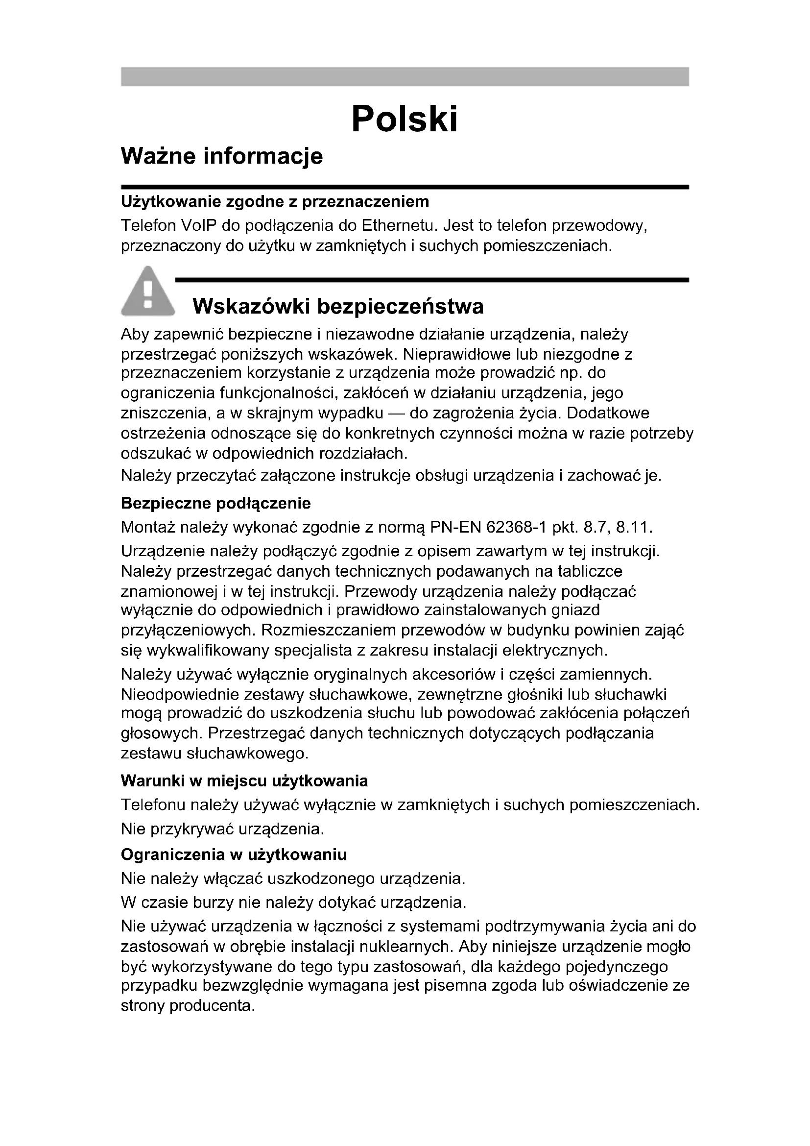 - Wijzig het wachtwoord onmiddellijk. U kunt dit doen onder Gebruiker. Opmerking: Nadere informatie over onder andere het instellen van een identiteit kunt u vinden onder Online help. Telefooncentrale VoIP-provider SIP- gebruikersnaam het voor de telefoon ingestelde interne telefoonnummer Voorbeeld: 557 de voor het account ingestelde gebruikersnaam Voorbeeld: telefoonnummer@provider.nl Wachtwoord het bijbehorende wachtwoord het bijbehorende wachtwoord SIP registreren het IP-adres van de telefooncentrale Voorbeeld: 192.168.196.37 de URL van de VoIP- provider Voorbeeld: providernaam.nlPolski Ważne informacje Użytkowanie zgodne z przeznaczeniem Telefon VoIP do podłączenia do Ethernetu. Jest to telefon przewodowy, przeznaczony do użytku w zamkniętych i suchych pomieszczeniach. Wskazówki bezpieczeństwa Aby zapewnić bezpieczne i niezawodne działanie urządzenia, należy przestrzegać poniższych wskazówek. Nieprawidłowe lub niezgodne z przeznaczeniem korzystanie z urządzenia może prowadzić np. do ograniczenia funkcjonalności, zakłóceń w działaniu urządzenia, jego zniszczenia, a w skrajnym wypadku — do zagrożenia życia. Dodatkowe ostrzeżenia odnoszące się do konkretnych czynności można w razie potrzeby odszukać w odpowiednich rozdziałach. Należy przeczytać załączone instrukcje obsługi urządzenia i zachować je. Bezpieczne podłączenie Montaż należy wykonać zgodnie z normą PN-EN 62368-1 pkt. 8.7, 8.11. Urządzenie należy podłączyć zgodnie z opisem zawartym w tej instrukcji. Należy przestrzegać danych technicznych podawanych na tabliczce znamionowej i w tej instrukcji. Przewody urządzenia należy podłączać wyłącznie do odpowiednich i prawidłowo zainstalowanych gniazd przyłączeniowych. Rozmieszczaniem przewodów w budynku powinien zająć się wykwalifikowany specjalista z zakresu instalacji elektrycznych. Należy używać wyłącznie oryginalnych akcesoriów i części zamiennych. Nieodpowiednie zestawy słuchawkowe, zewnętrzne głośniki lub słuchawki mogą prowadzić do uszkodzenia słuchu lub powodować zakłócenia połączeń głosowych. Przestrzegać danych technicznych dotyczących podłączania zestawu słuchawkowego. Warunki w miejscu użytkowania Telefonu należy używać wyłącznie w zamkniętych i suchych pomieszczeniach. Nie przykrywać urządzenia. Ograniczenia w użytkowaniu Nie należy włączać uszkodzonego urządzenia. W czasie burzy nie należy dotykać urządzenia. Nie używać urządzenia w łączności z systemami podtrzymywania życia ani do zastosowań w obrębie instalacji nuklearnych. Aby niniejsze urządzenie mogło być wykorzystywane do tego typu zastosowań, dla każdego pojedynczego przypadku bezwzględnie wymagana jest pisemna zgoda lub oświadczenie ze strony producenta.Wiedza niezbędna podczas konfiguracji Niekompletna lub błędna konfiguracja może prowadzić do zagrożenia życia, na przykład wskutek braku możliwości wykonania połączenia w celu wezwania pomocy. Konfigurację produktu wykonuje się przez telefon lub poprzez zainstalowane na zintegrowanym serwerze sieci Web strony internetowe, które można otwierać za pomocą przeglądarki internetowej. Właściwa pomoc jest dostępna w języku angielskim lub niemieckim. Jeżeli te języki i zastosowane fachowe pojęcia sprawiają trudność, należy powierzyć te czynności osobie z odpowiednimi kwalifikacjami językowymi i merytorycznymi. Naprawa Nie należy otwierać urządzenia. Tylko producent może otwierać i naprawiać urządzenie. Czyszczenie Uwaga: Płyny wnikające do obudowy mogą uszkodzić lub zniszczyć urządzenie.