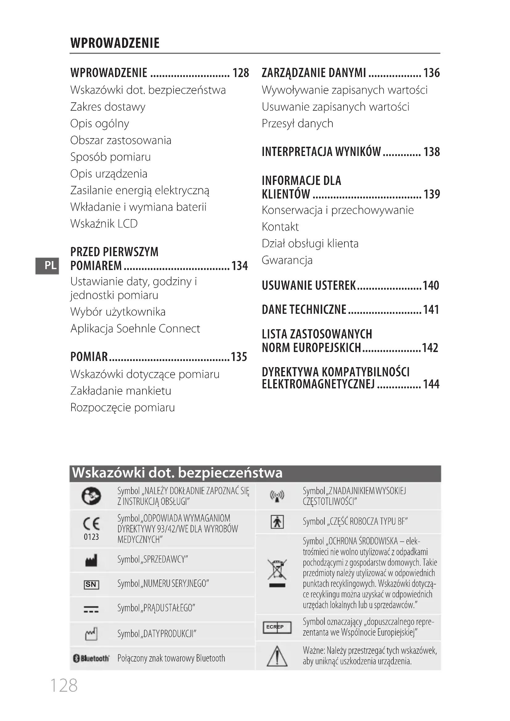 WPROWADZENIE WPROWADZENIE ........................... 128 Wskazówki dot. bezpieczeństwa Zakres dostawy Opis ogólny Obszar zastosowania Sposób pomiaru Opis urządzenia Zasilanie energią elektryczną Wkładanie i wymiana baterii Wskaźnik LCD PRZED PIERWSZYM POMIAREM .................................... 134 Ustawianie daty, godziny i jednostki pomiaru Wybór użytkownika Aplikacja Soehnle Connect POMIAR ......................................... 135 Wskazówki dotyczące pomiaru Zakładanie mankietu Rozpoczęcie pomiaru