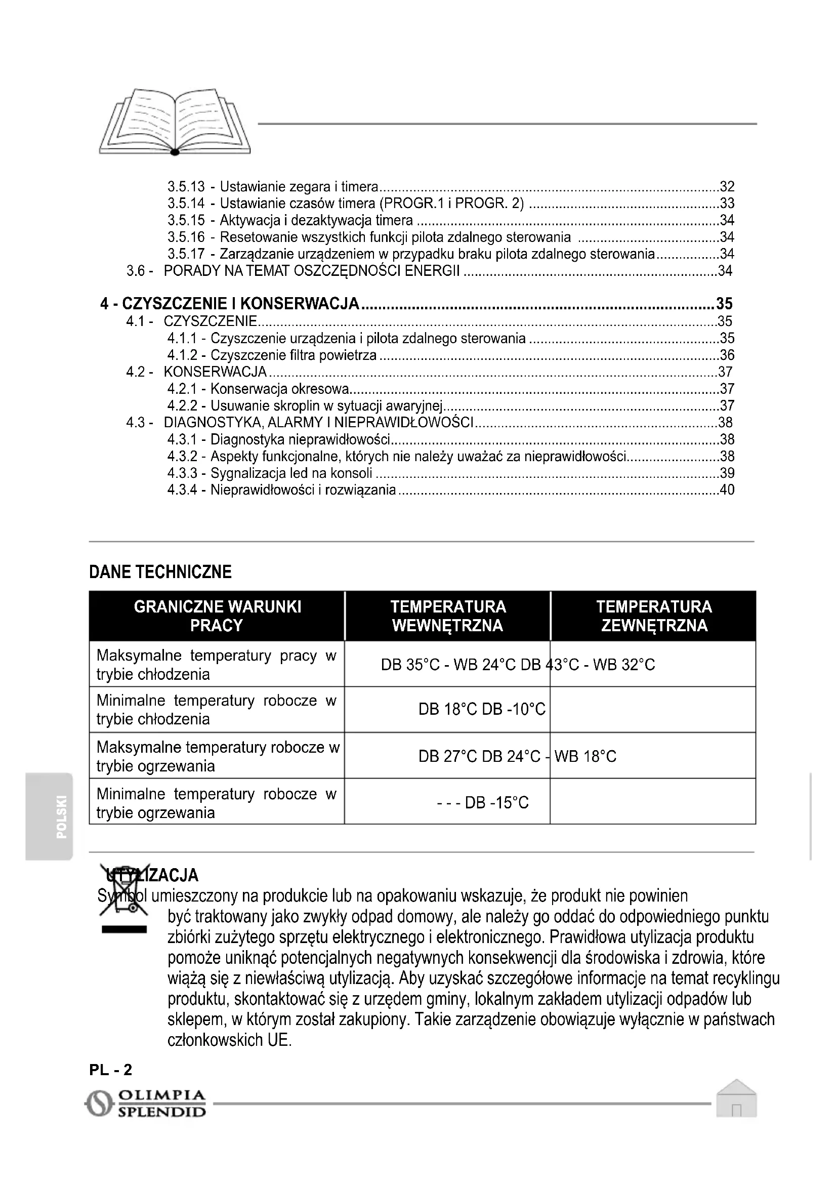3.5.12 - Ustawianie timera ........................................................................................................32PL - 2 POLSKI UTYLIZACJA Symbol umieszczony na produkcie lub na opakowaniu wskazuje, że produkt nie powinien być traktowany jako zwykły odpad domowy, ale należy go oddać do odpowiedniego punktu zbiórki zużytego sprzętu elektrycznego i elektronicznego. Prawidłowa utylizacja produktu pomoże uniknąć potencjalnych negatywnych konsekwencji dla środowiska i zdrowia, które wiążą się z niewłaściwą utylizacją. Aby uzyskać szczegółowe informacje na temat recyklingu produktu, skontaktować się z urzędem gminy, lokalnym zakładem utylizacji odpadów lub sklepem, w którym został zakupiony. Takie zarządzenie obowiązuje wyłącznie w państwach członkowskich UE. 3.5.13 - Ustawianie zegara i timera ...........................................................................................32