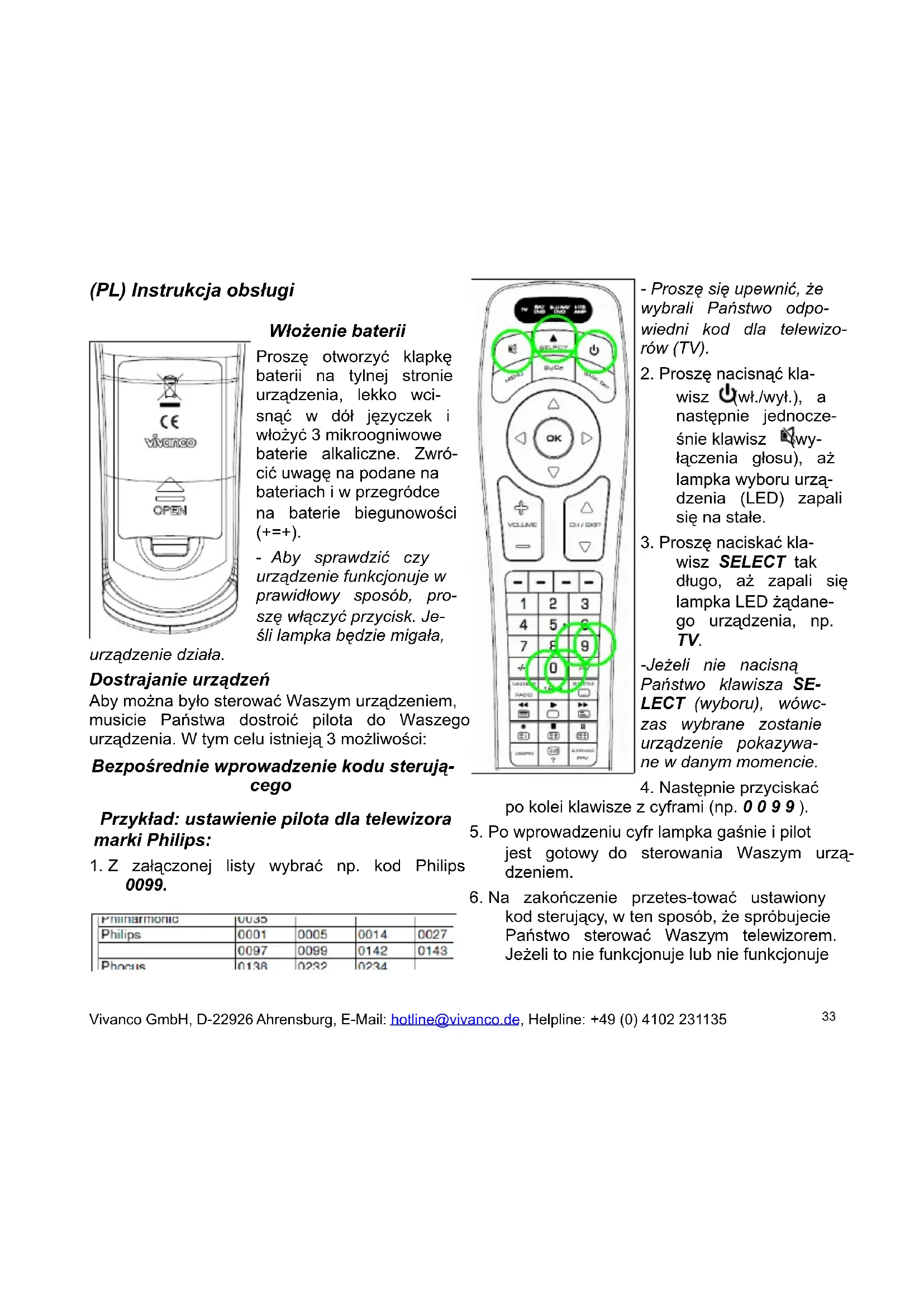 kod sterujący, w ten sposób, że spróbujecie Państwo sterować Waszym telewizorem. Jeżeli to nie funkcjonuje lub nie funkcjonuje Vivanco GmbH, D-22926 Ahrensburg, E-Mail: hotline@vivanco.de, Helpline: +49 (0) 4102 231135 33właściwie, to proszę spróbować następny kod z listy lub wyszukiwanie kodów, patrz niżej.