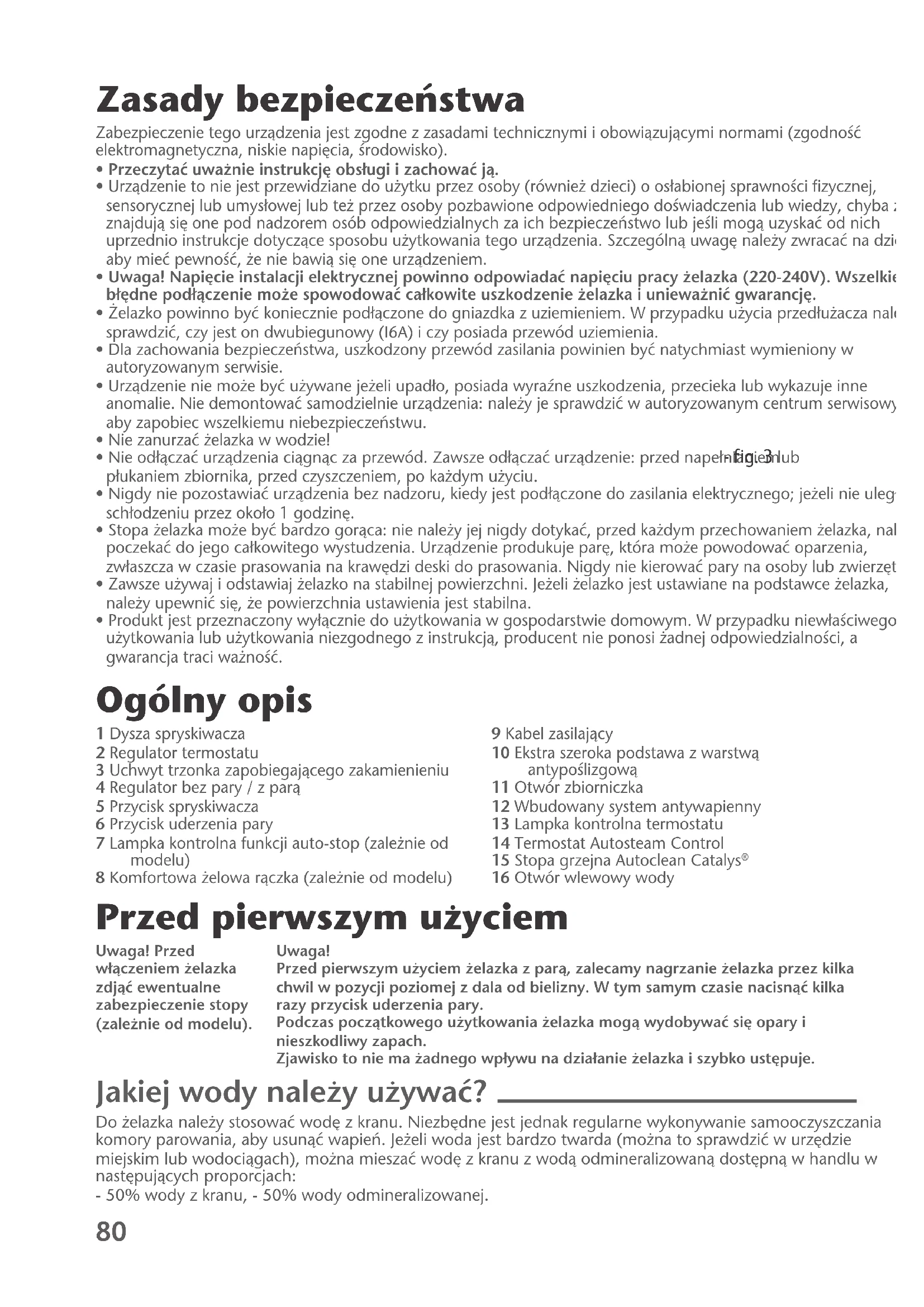 - Gdy ˝elazko spoczywa nieruchomo na stopce ponad 8 min• Gdy ˝elazko spoczywa przez ponad 30 sek. w pozycji poziomej lub na boku.- W celu ponownego uruchomienia ˝elazka, nale˝y nim lekko potrzàsnàç domomentu kiedy lampka kontrolna przestanie migaç.9. Stopa grzejna Autoclean Catalys® - ˚elazko wyposa˝one jest w samooczyszczajàcà si´ stop´ grzejnà - fig. 14 samooczyszczanie dzia∏a na zasadzie katalizy. - Wyjàtkowy rodzaj pow∏oki pozwala na ciàg∏e eliminowanie wszelkich zanieczyszczeƒ pojawiajàcych si´ w tokunormalnego u˝ytkowania. Zaleca si´ stawianie ˝elazka zawsze na stopce w celu zachowania samooczyszczajàcej si´pow∏oki. Prasowanie na sucho - Wybraç program prasowania.- Ustawiç regulator pary w pozycji SEC - fig. 1. - Rozpoczàç prasowanie po wy∏àczeniu si´ lampki kontrolnej. Utrzymywanie ˝elazka w dobrym stanie UWAGA! Przed czyszczeniem ˝elazka nale˝y wy∏àczyç je z sieci i poczekaç do jego wystygni´cia. Czszczenie sztyftu antywapiennego - Wy∏àczyç ˝elazko i opró˝niç pojemnik na wod´.- W celu wyciàgni´cia trzonka zapobiegajàcego zakamienieniu, ustawiç termostat w pozycji MAX