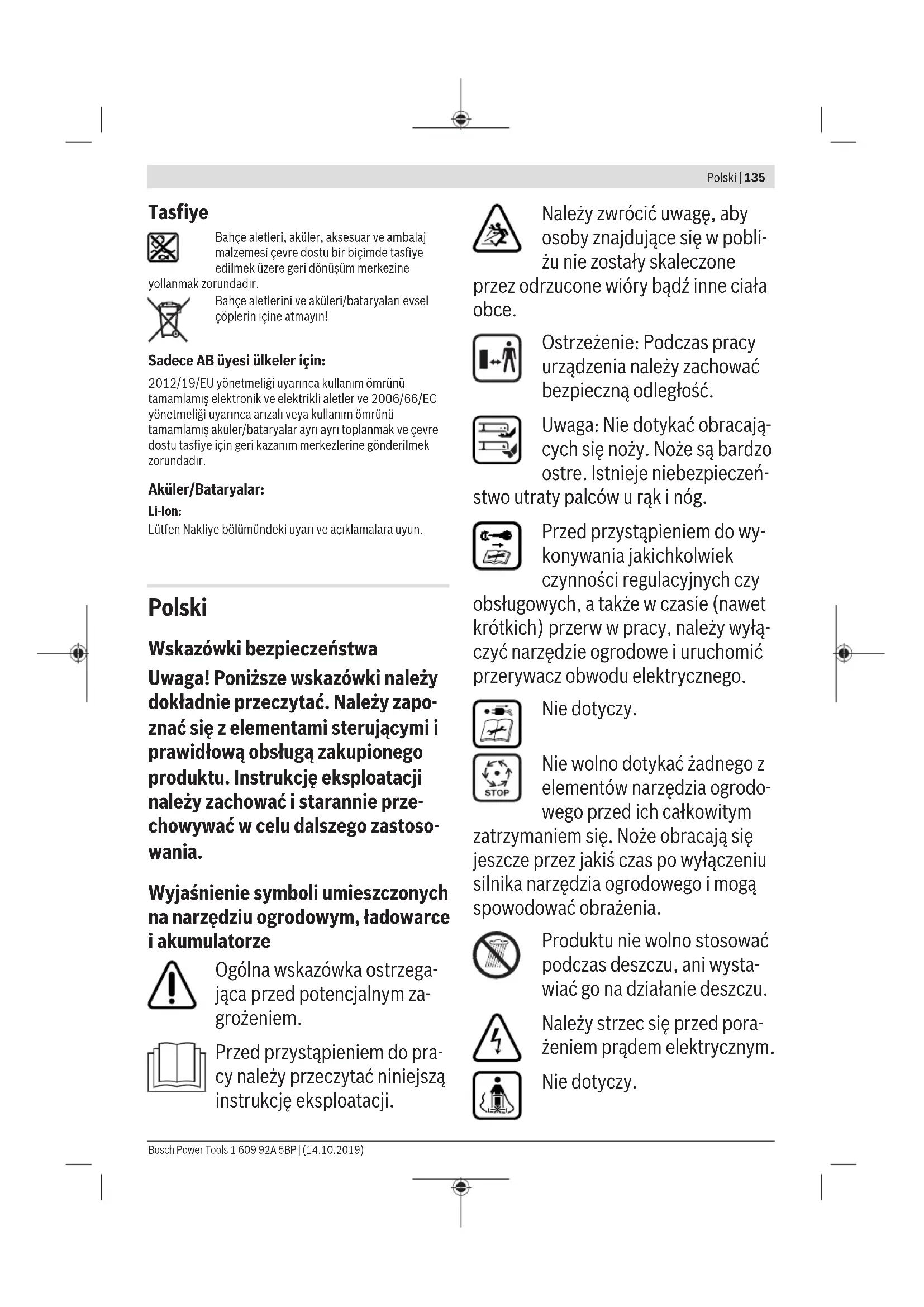 'ye kadar İşletme süresini artırmak için Bosch Bahçe Aletleri için yetkili bir servisten yedek bir akü alınabilir. Hata arama Hata göstergesi Olası neden Giderilme yöntemi Motor çalışmıyor Bahçe aletinin içindeki kablo sisteminde hata var Bosch Müşteri Servisine başvurun Akü boşalmış durumda Aküyü şarj edin Akü çok soğuk veya çok sıcak Aküyü ısıtın veya soğutun Çimler çok uzun En büyük kesme yüksekliği ayarı ile izin verilen maks. çim yüksekliğ 30 cm Motor koruma sistemi devreye girmiş durumda Motoru soğutun ve daha büyük kesme yüksekliği ayarlayın Akım devresi kesicisi doğru veya tam olarak yerleştirilmemiş Doğru yerleştirin 1 609 92A 5BP | (14.10.2019) Bosch Power ToolsTürkçe | 133 Hata göstergesi Olası neden Giderilme yöntemi Bahçe aleti kesintili olarak çalışıyor Bahçe aletinin içindeki kablo sisteminde hata var Bosch Müşteri Servisine başvurun Motor koruma sistemi devreye girmiş durumda Motoru soğutun ve daha büyük kesme yüksekliği ayarlayın Bahçe ekipmanı düzensiz biçme profili bırakır ve/veya motor ağır çalışır Kesme yüksekliği çok düşük Daha büyük kesme yüksekliği ayarlayın Bıçaklar körelmiş Bıçağı değiştirin (bkz. Resim J) Tıkanma olabilir Bahçe aletini kapatın ve akım devresi kesiciyi gevşet Bahçe aletinin alt tarafını kontrol edin ve gerekiyorsa temizleyin Bıçaklar yanlış takılmış Bıçakları doğru takın Bahçe aleti açıldıktan sonra bıçak dönmüyor Bıçakların dönmesi çim tarafından engelleniyor Bahçe aletini kapatın ve akım devresi kesiciyi gevşet Tıkanmayı giderin (her zaman bahçe eldivenleri giyin) Bıçak somunu/-cıvatası gevşek Bıçak somununu/-cıvatasını sıkın (27Nm) Aşırı titreşim ve gürültü var Bıçak somunu/-cıvatası gevşek Bıçak somununu/-cıvatasını sıkın (27Nm) Bıçaklar hasarlı Bıçağı değiştirin (bkz. Resim J) Akü ve şarj cihazı Hata göstergesi Olası neden Giderilme yöntemi Şarj cihazında kırmızı akü şarj göstergesi yanıp sönüyor Şarj işlemi mümkün değil Akü takılı (doğru takılı) değil Akü şarj cihazına doğru olarak yerleştirin Akü kontakları kirli Akü kontaklarını temizleyin; örneğin aküyü birkaç kez takıp çıkararak. Gerekiyorsa aküyü yenileyin Akü arızalı Aküyü yenileyin Şarj cihazında akü şarj göstergeleri yanmıyor Şarj cihazının şebeke fişi takılı değil veya doğru takılı değil Şebeke fişini tam olarak prize takın Priz, şebeke kablosu veya şarj cihazı arızalı Şebeke gerilimini kontrol edin, gerekiyorsa şarj cihazını Bosch elektrikli el aletleri için yetkili bir serviste kontrol ettirin Bakım ve servis Akü bakımı u Dikkat! Bakım veya temizlik işlemlerine başlamadan önce bahçe aletini kapatın, akım devresi kesicisini gevşetin ve aküyü ve çim tutma selesini çıkarın. u Keskin bıçakların alanında meşgul olurken veya çalışırken daima bahçe eldivenleri kullanın. Aküden optimum ölçüde yararlanabilmek için aşağıdaki uyarı ve önlemlere uyun: – Aküyü neme ve suya karşı koruyun. – Bahçe aletini sadece -20 °C ile 50 °C arasında depolayın. Bahçe aletini örneğin yaz mevsiminde otomobil içinde bırakmayın. – Aküleri bahçe aletinin içinde değil ayrı yerde depolayın. – Aküyü şiddetli güneş ışını altındaki bahçe aleti içinde bırakmayın. – Akünün saklanması için optimum sıcaklık 5 derecedir. – Akünün havalandırma aralıklarını düzenli olarak yumuşak, temiz ve kuru bir fırça ile temizleyin. Şarj işleminden sonra belirgin ölçüde kısa işletme süresi akünün kullanım ömrünün tamamlandığını ve yenilenmesi gerektiğini gösterir. Müşteri servisi ve uygulama danışmanlığı www.bosch-garden.com Bütün başvuru ve yedek parça siparişlerinizde ürünün tip etiketi üzerindeki 10 haneli ürün kodunu mutlaka belirtin. Sadece Türkiye için geçerlidir: Bosch genel olarak yedek parçaları 5 yıl hazır tutar. Türkçe Bosch Sanayi ve Ticaret A.Ş. Elektrikli El Aletleri Aydınevler Mah. İnönü Cad. No: 20 Küçükyalı Ofis Park A Blok Bosch Power Tools 1 609 92A 5BP | (14.10.2019)134 | Türkçe 34854 Maltepe-İstanbul Tel.: 444 80 10 Fax: +90 216 432 00 82 E-mail: iletisim@bosch.com.tr www.bosch.com.tr Bulsan Elektrik İstanbul Cad. Devrez Sok. İstanbul Çarşısı No: 48/29 İskitler Ankara Tel.: +90 312 3415142 Tel.: +90 312 3410302 Fax: +90 312 3410203 E-mail: bulsanbobinaj@gmail.com Faz Makine Bobinaj Cumhuriyet Mah. Sanayi Sitesi Motor İşleri Bölümü 663 Sk. No:18 Antalya Tel.: +90 242 3465876 Tel.: +90 242 3462885 Fax: +90 242 3341980 E-mail: info@fazmakina.com.tr Körfez Elektrik Karaağaç Mah. Sümerbank Cad. No:18/2 Erzincan Tel.: +90 446 2230959 Fax: +90 446 2240132 E-mail: bilgi@korfezelektrik.com.tr Değer İş Bobinaj İsmetpaşa Mah. İlk Belediye Başkan Cad. 5/C Şahinbey/Gaziantep Tel.: +90 342 2316432 Fax: +90 342 2305871 E-mail: degerisbobinaj@hotmail.com Tek Çözüm Bobinaj Küsget San.Sit.A Blok 11Nolu Cd.No:49/A Şehitkamil/Gaziantep Tel.: +90 342 2351507 Fax: +90 342 2351508 E-mail: cozumbobinaj2@hotmail.com Günşah Otomotiv Beylikdüzü Sanayi Sit. No: 210 Beylikdüzü İstanbul Tel.: +90 212 8720066 Fax: +90 212 8724111 E-mail: gunsahelektrik@ttmail.com Aygem 10021 Sok. No: 11 AOSB Çiğli İzmir Tel.: +90232 3768074 Fax: +90 232 3768075 E-mail: boschservis@aygem.com.tr Sezmen Bobinaj Ege İş Merkezi 1201/4 Sok. No: 4/B Yenişehir İzmir Tel.: +90 232 4571465 Tel.: +90 232 4584480 Fax: +90 232 4573719 E-mail: info@sezmenbobinaj.com.tr Ankaralı Elektrik Eski Sanayi Bölgesi 3. Cad. No: 43 Kocasinan Kayseri Tel.: +90 352 3364216 Tel.: +90 352 3206241 Fax: +90 352 3206242 E-mail: gunay@ankarali.com.tr Asal Bobinaj Eski Sanayi Sitesi Barbaros Cad. No: 24/C Samsun Tel.: +90 362 2289090 Fax: +90 362 2289090 E-mail: bpsasalbobinaj@hotmail.com Üstündağ Elektrikli Alet